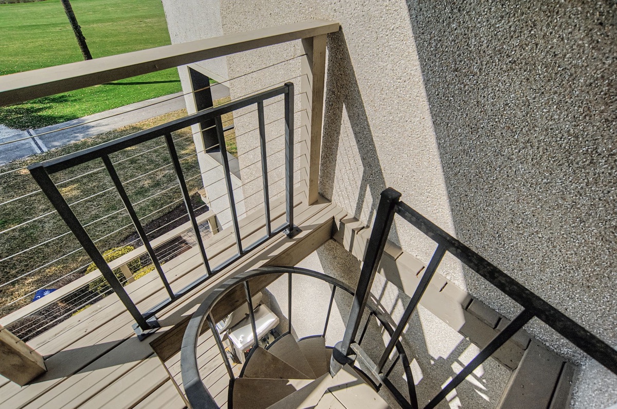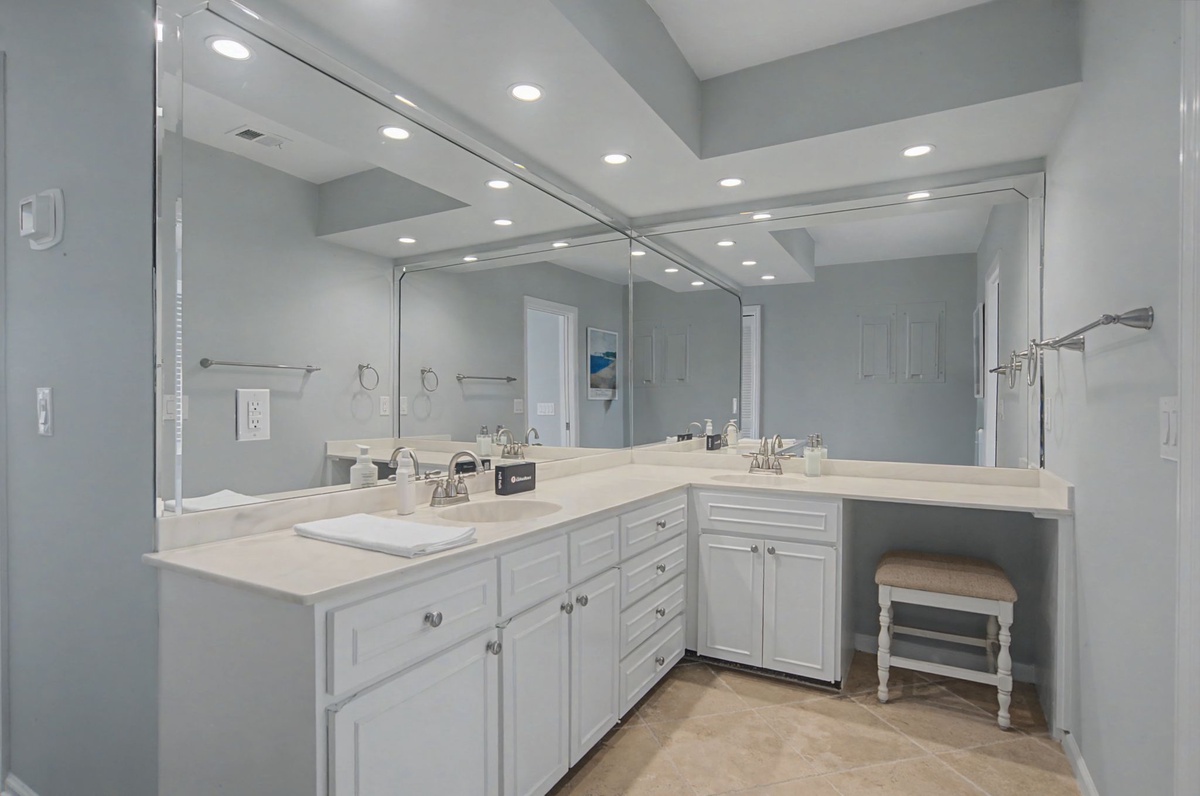 The primary suite—facing the golf course—offers breathtaking, floor-to-ceiling views of the fairway and water beyond. A private den with a pull-out sofa, decorative fireplace, and large flat-screen TV provides a cozy retreat. Sliding doors open to a private balcony with seating for two, plus access to the first and second-floor decks via a spiral staircase. The oversized primary bathroom features dual vanities, a tub/shower combination, and a separate walk-in shower. A generous walk-in closet completes this spacious suite. The second upstairs bedroom includes two twin beds and an ensuite bath with a tub/shower combination and single vanity. A full-sized washer and dryer are conveniently located on this level.