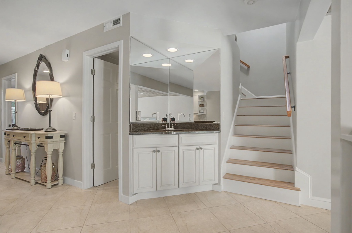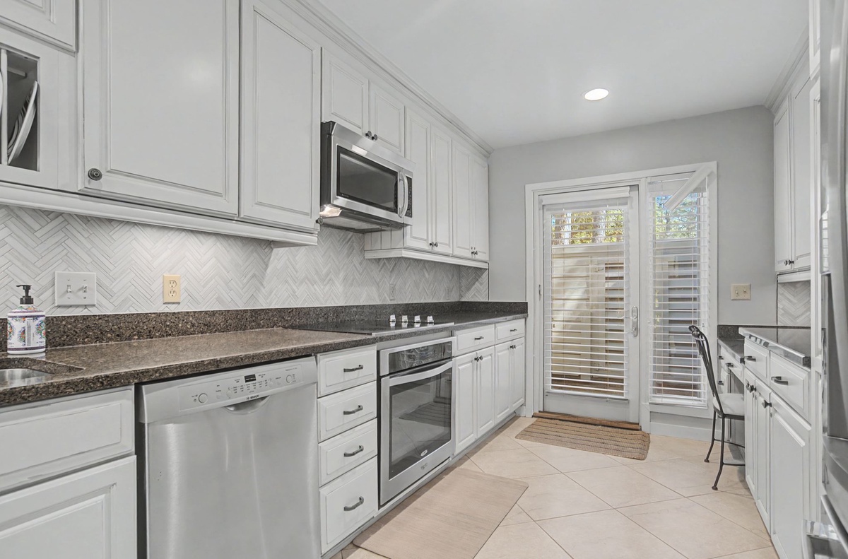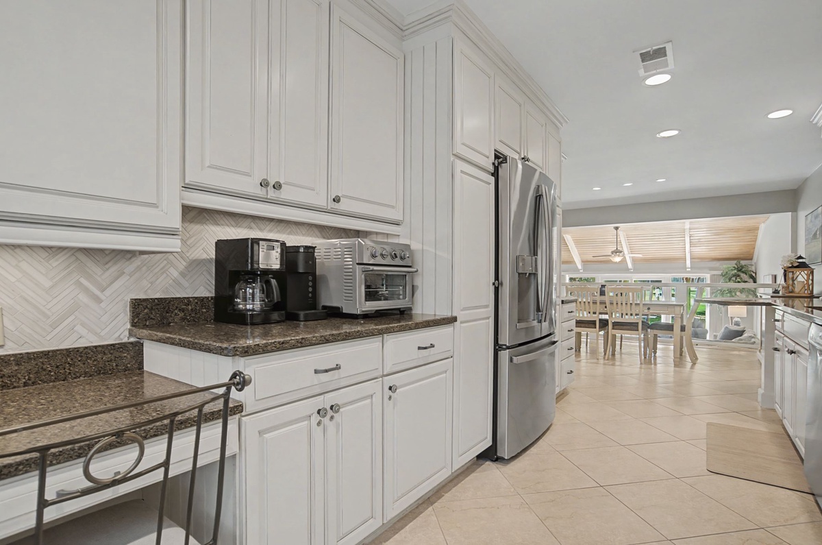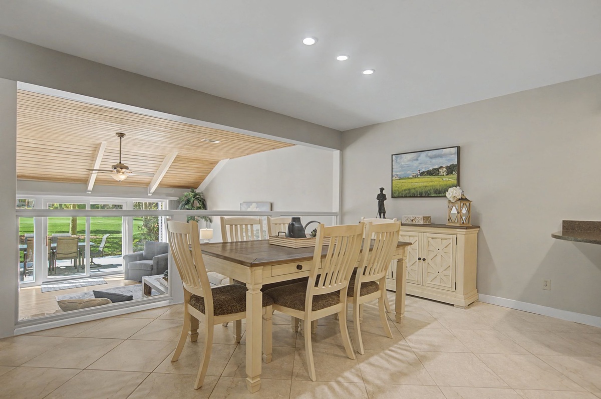 As you enter, those golf views guide you toward a spacious dining room where seating for six segues to bar seating for two at wide granite counters spilling down to a gourmet kitchen. The full suite of updated appliances, as well as the nearby wet bar, make for effortless entertaining.