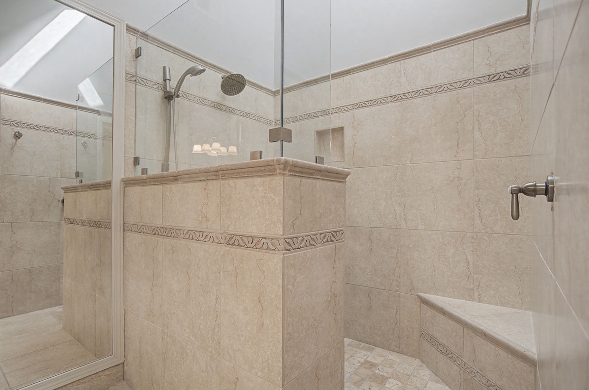 A staircase bathed in natural light from a tall skylight guide you up to the first two guest rooms. In one, dual twin beds face a flat-screen tv in a space with an en suite bath boasting tub and shower. In the other, soaring vaulted ceilings lend spaciousness to a suite with queen-sized bed and daybed, exquisite private deck overlooking the golf views and expansive en suite bath. A vanity leading to the bath boasts a beverage cooler, while inside the en suite a massive walk-in shower boasts dual showerheads.