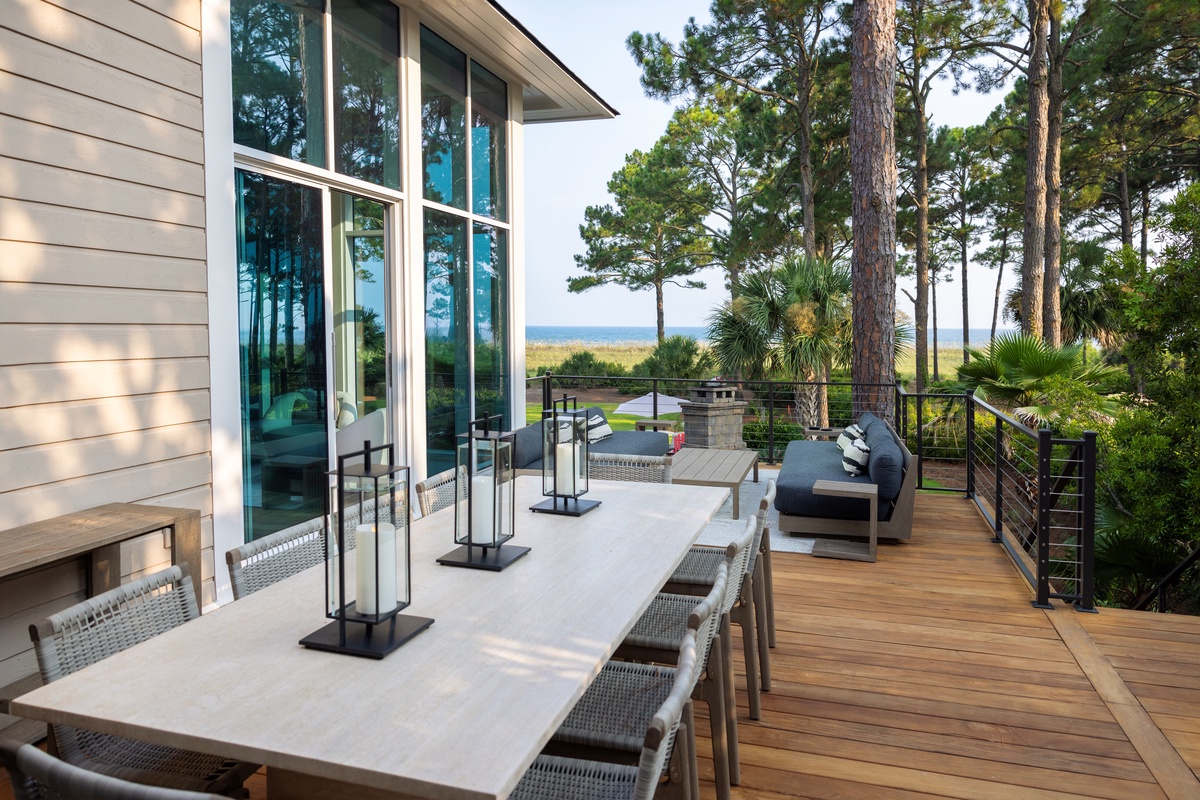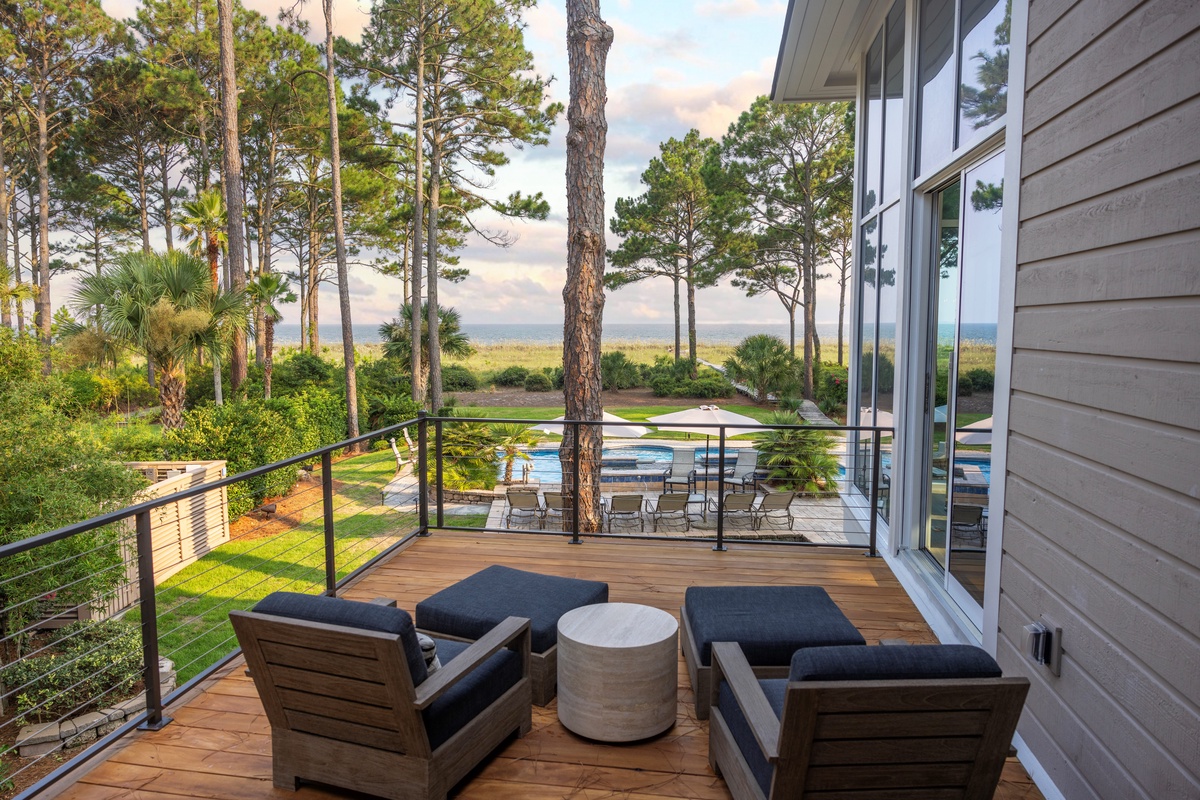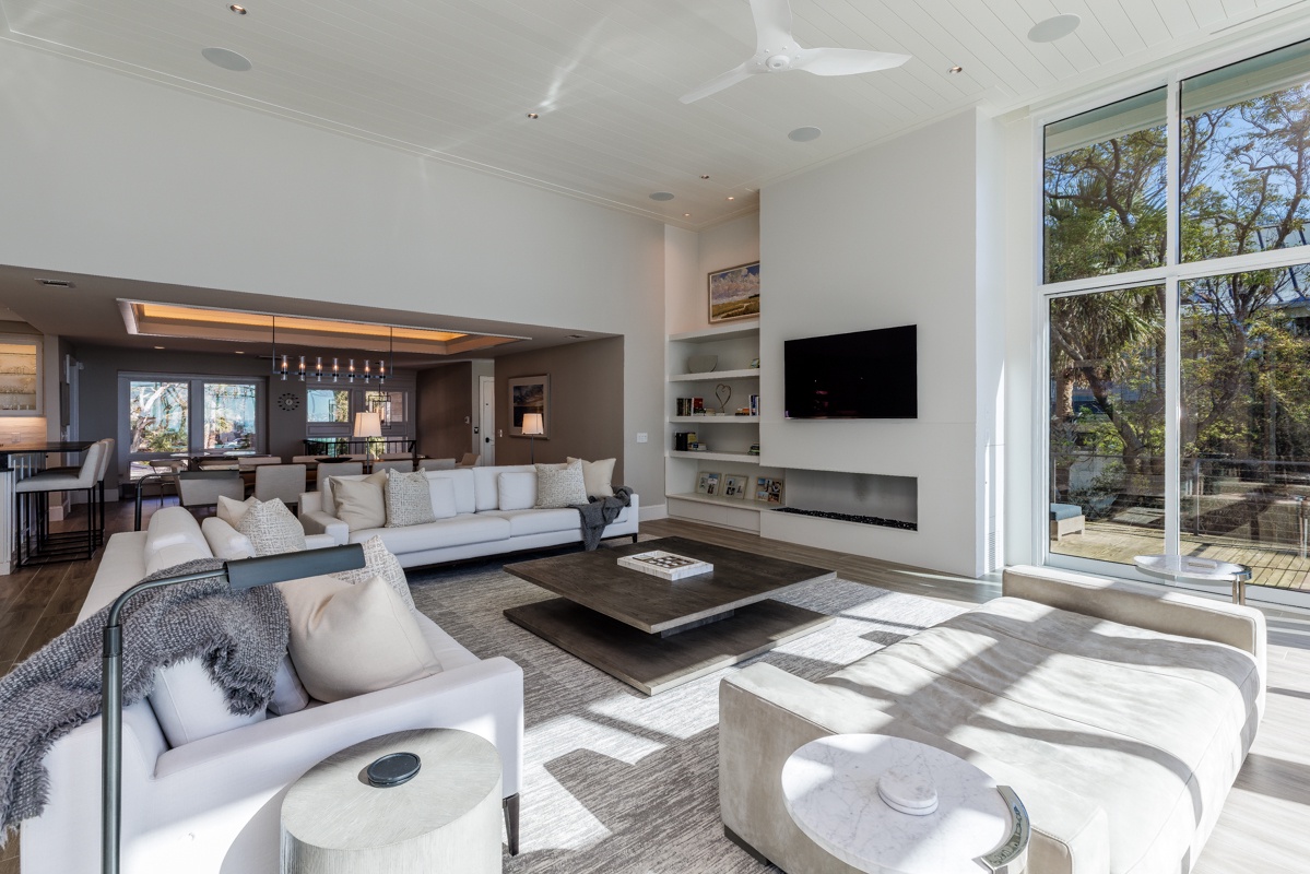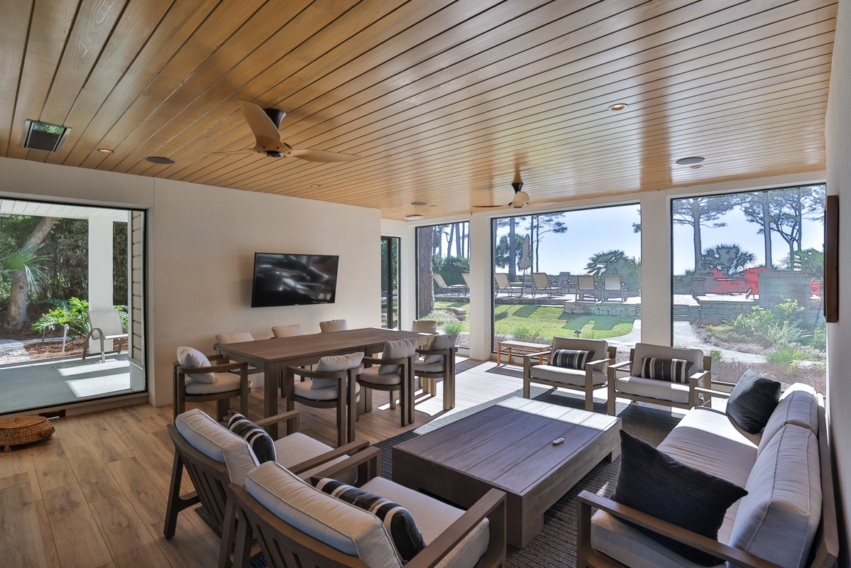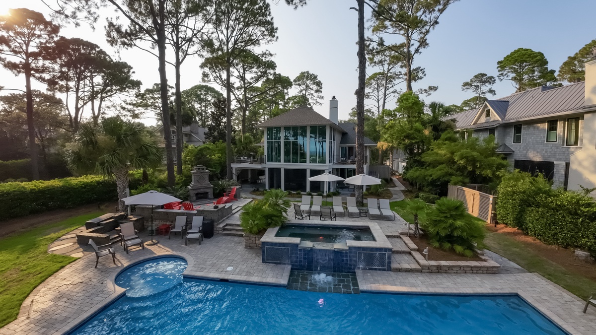 The outdoor space is designed for both relaxation and entertainment. A resort-style pool with cascading water sits just steps from the private boardwalk leading to the beach. A Jacuzzi spa with ambient lighting enhances nighttime enjoyment. The poolside lower level includes a screened porch with ocean views, plenty of guest seating, dining and game tables, and a flat-screen TV. A manicured lawn provides space for recreation and entertaining, complete with a distributed Sonos sound system. The outdoor fireplace serves as a cozy gathering place, with starter firewood provided. The upper level has two decks with ocean views—one off the primary bedroom with lounge seating and another off the living room with lounge seating and a dining table. A Weber grill allows for outdoor dining.
