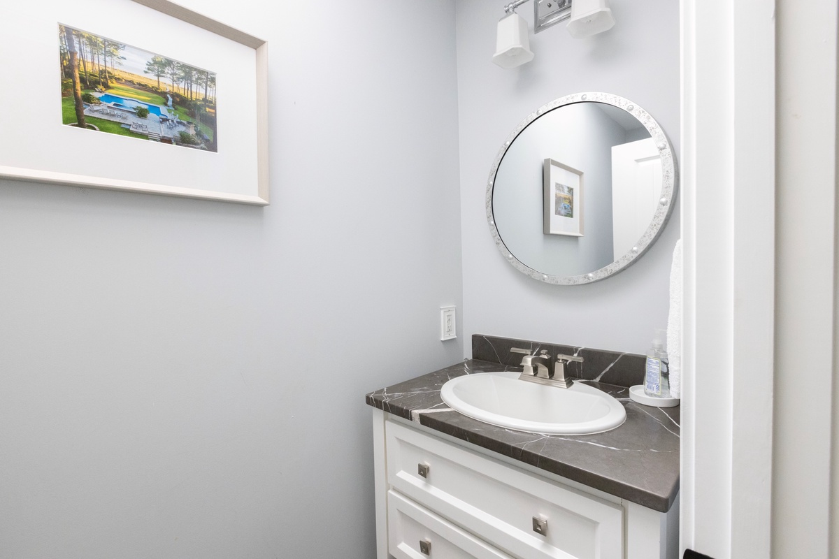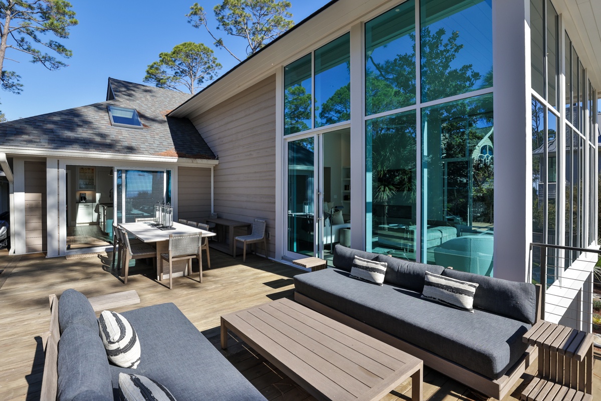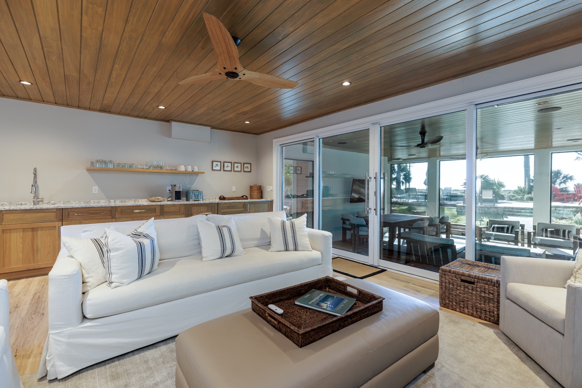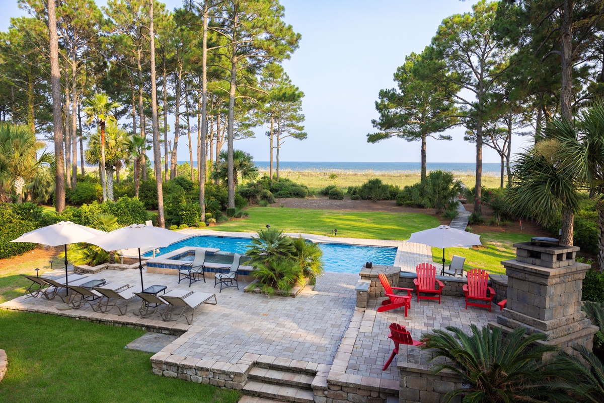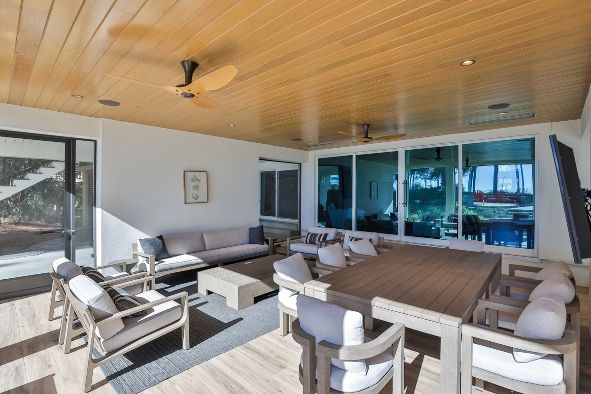 The outdoor space is designed for both relaxation and entertainment. A resort-style pool with cascading water sits just steps from the private boardwalk leading to the beach. A Jacuzzi spa with ambient lighting enhances nighttime enjoyment. The poolside lower level includes a screened porch with ocean views, plenty of guest seating, dining and game tables, and a flat-screen TV. A manicured lawn provides space for recreation and entertaining, complete with a distributed Sonos sound system. The outdoor fireplace serves as a cozy gathering place, with starter firewood provided. The upper level has two decks with ocean views—one off the primary bedroom with lounge seating and another off the living room with lounge seating and a dining table. A Weber grill allows for outdoor dining.