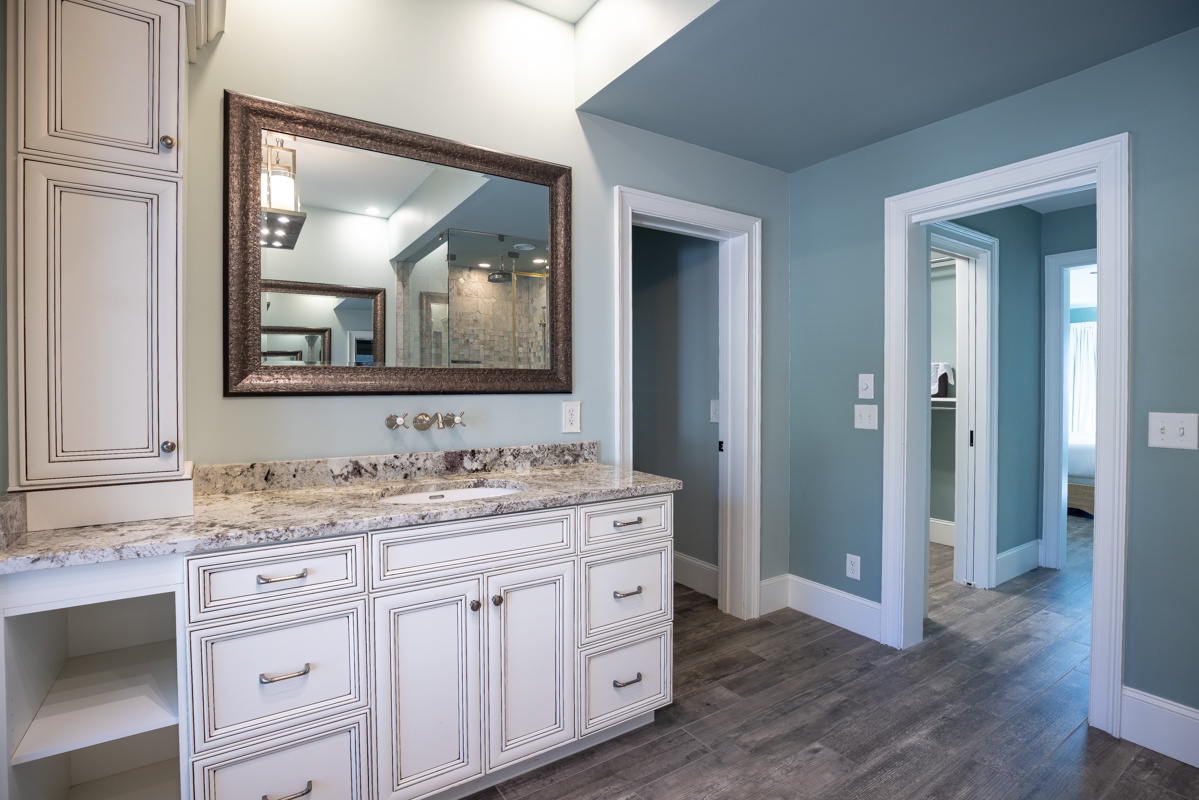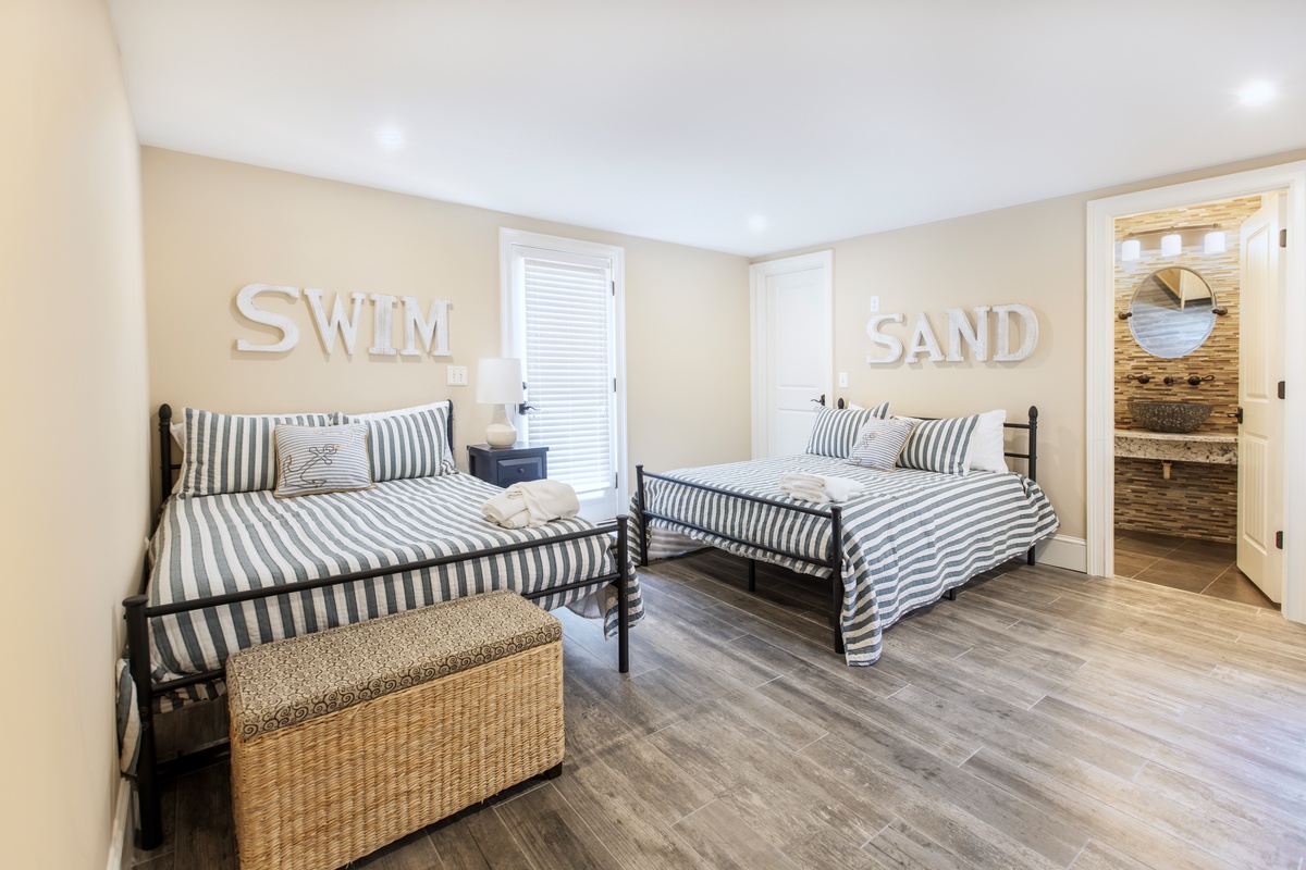 Inside, the open-floor plan is designed to maximize ocean views from every angle. The formal dining and bar area offers seating for sixteen. The living space is furnished with coastal decor, a decorative fireplace, and a flat-screen TV. The chef’s kitchen is fully equipped with a six-burner Wolf range, a Sub-Zero refrigerator, and a Sub-Zero wine refrigerator. Every open space features a TV, and there is a quiet office space with a printer and 500MB high-speed internet. The first floor includes a spacious media room that opens to the screened porch through sliding glass doors. Three of the six guest suites are located on this level. Two of them feature ocean views, king beds, flat-screen TVs, private access to the ocean facing terraces, and spa-like private baths. The third has two double beds, a flat-screen TV, and an updated en suite with a walk-in shower.