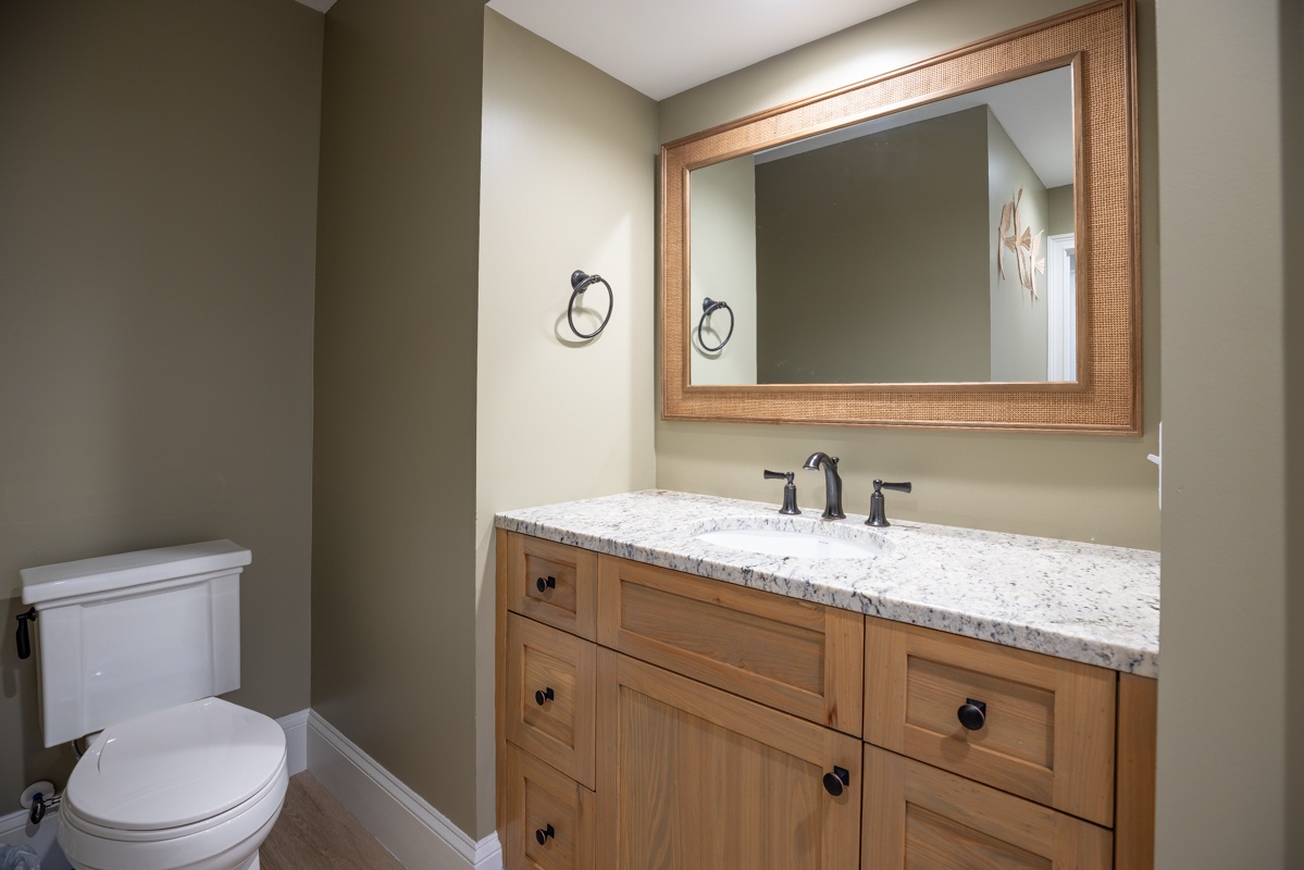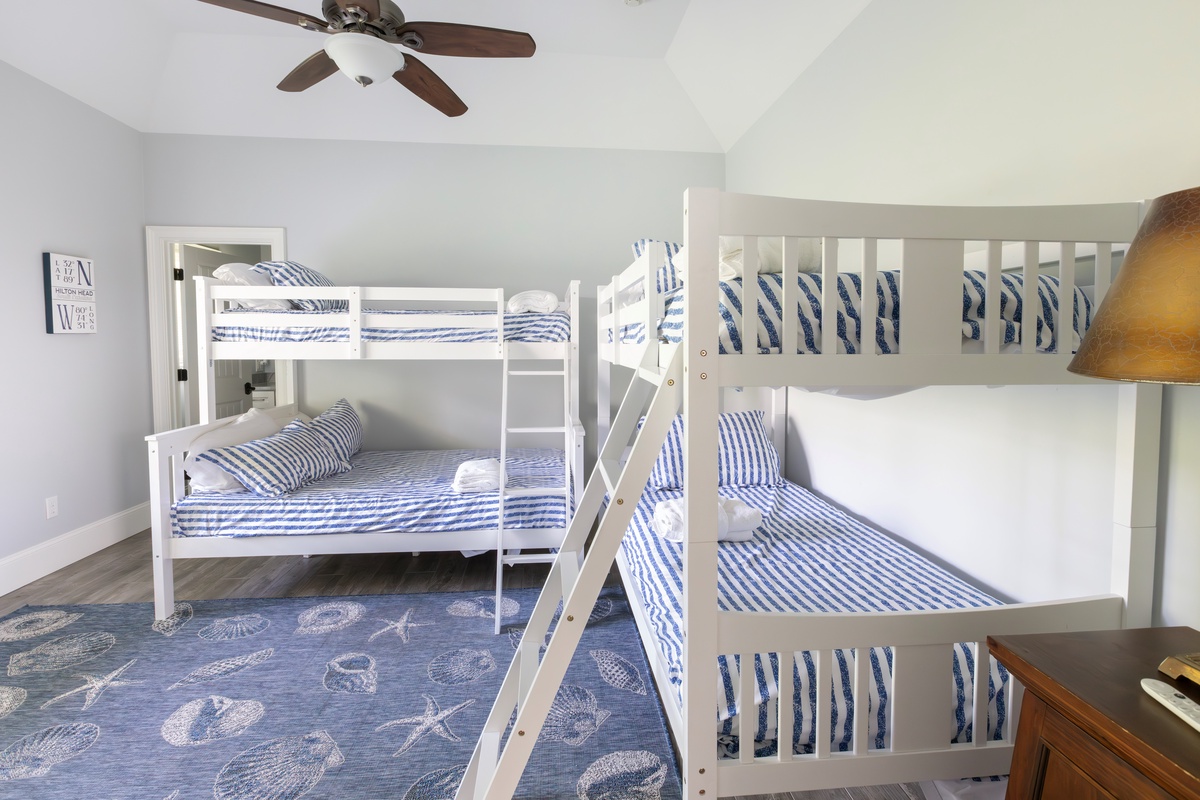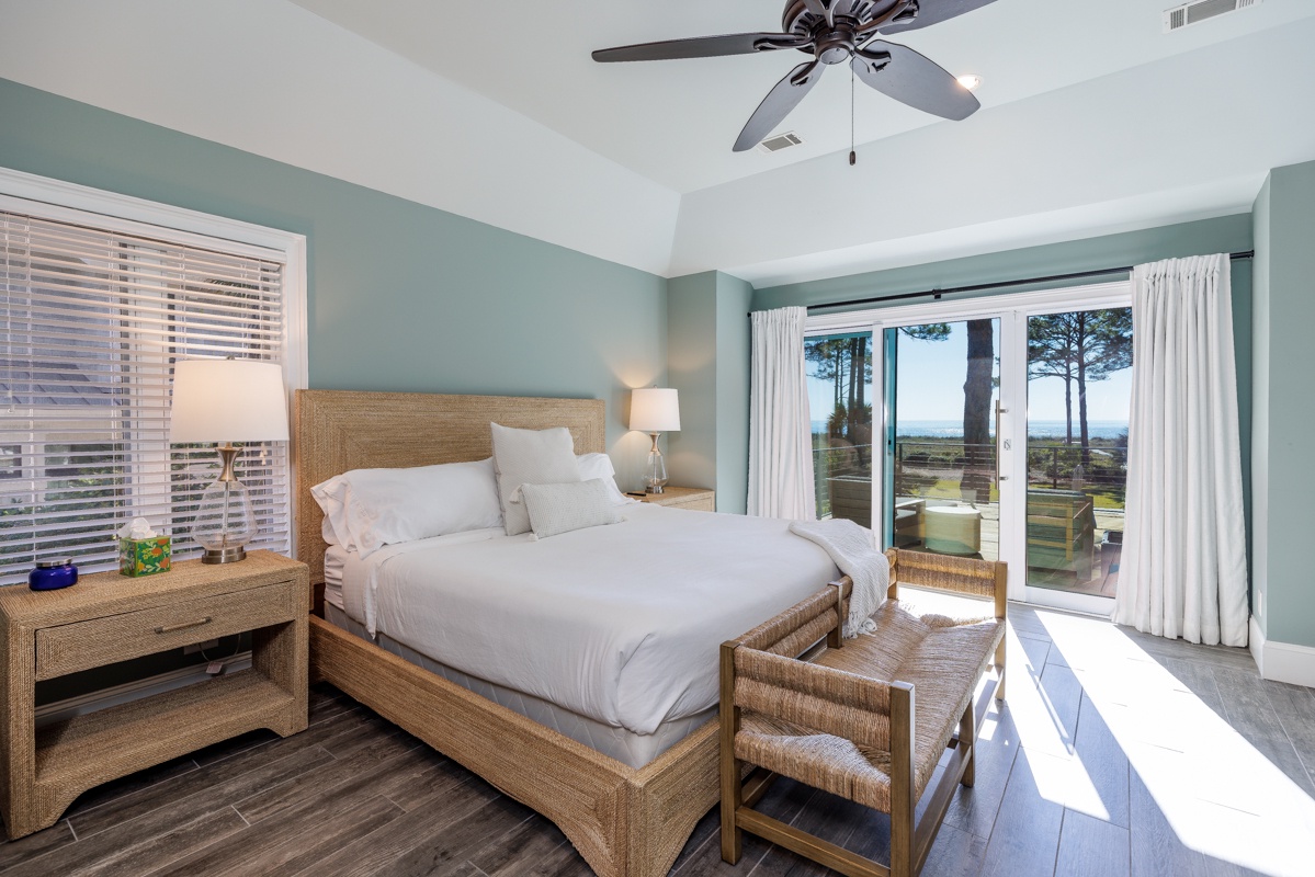 The second floor houses additional guest rooms, including a festive bunk room with dual bunk beds, a flat-screen TV, and a private bath with a walk-in shower. Another spacious and private upstairs suite features a king bed, abundant natural light, a bar with an under-counter refrigerator, an office area, and an en suite bath with a spacious corner walk-in shower. The master suite is a luxurious oceanfront retreat, offering a spacious layout, private access to an elevated deck with elegant furnishings, and a spa-like en suite with a tub and a large walk-in shower.