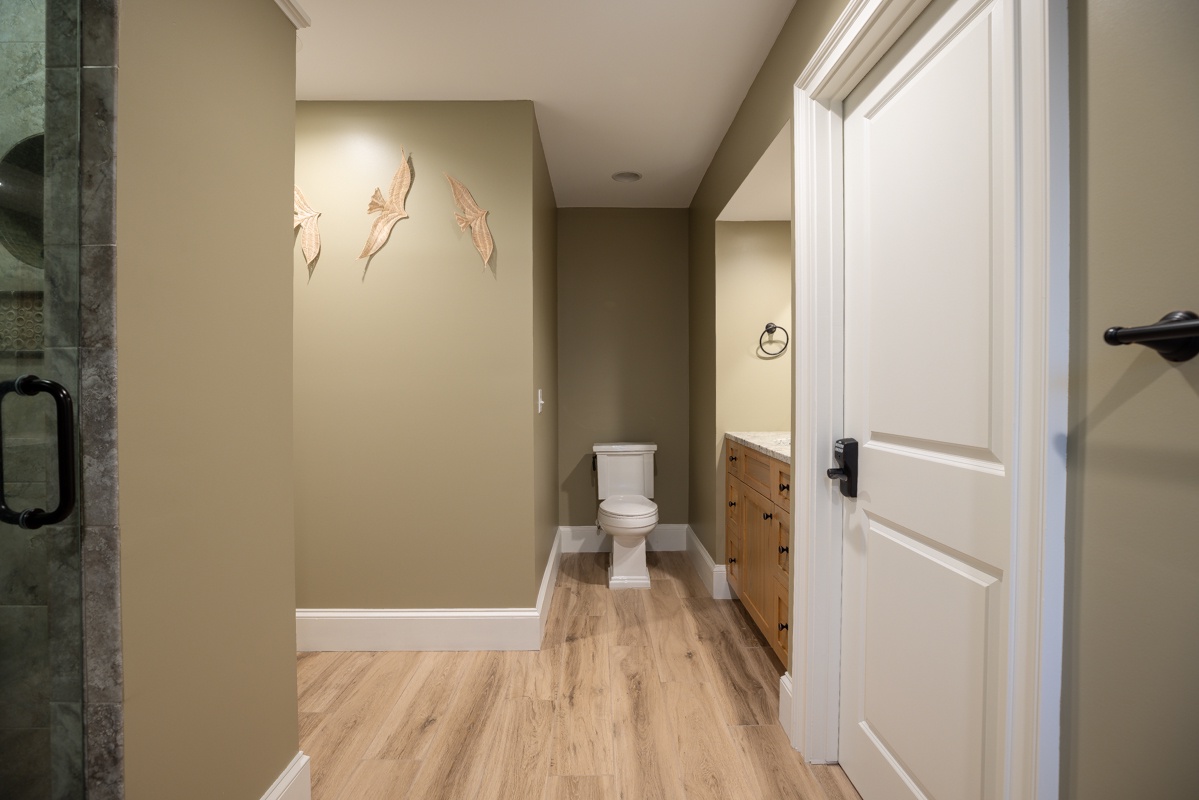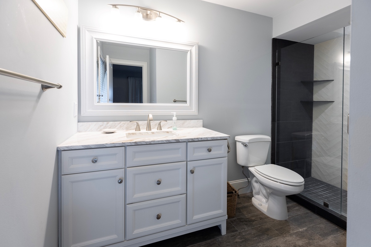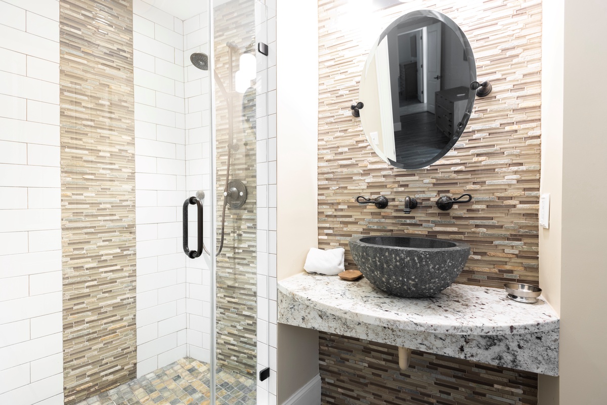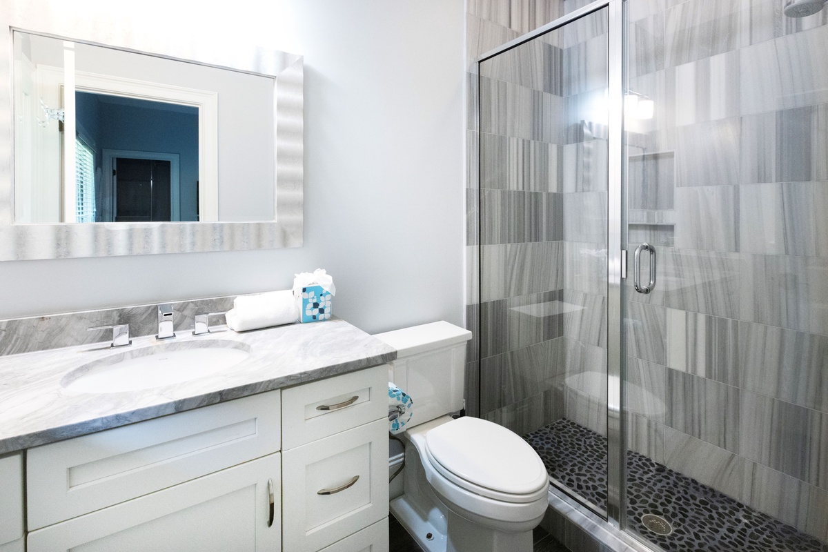 The second floor houses additional guest rooms, including a festive bunk room with dual bunk beds, a flat-screen TV, and a private bath with a walk-in shower. Another spacious and private upstairs suite features a king bed, abundant natural light, a bar with an under-counter refrigerator, an office area, and an en suite bath with a spacious corner walk-in shower. The master suite is a luxurious oceanfront retreat, offering a spacious layout, private access to an elevated deck with elegant furnishings, and a spa-like en suite with a tub and a large walk-in shower.