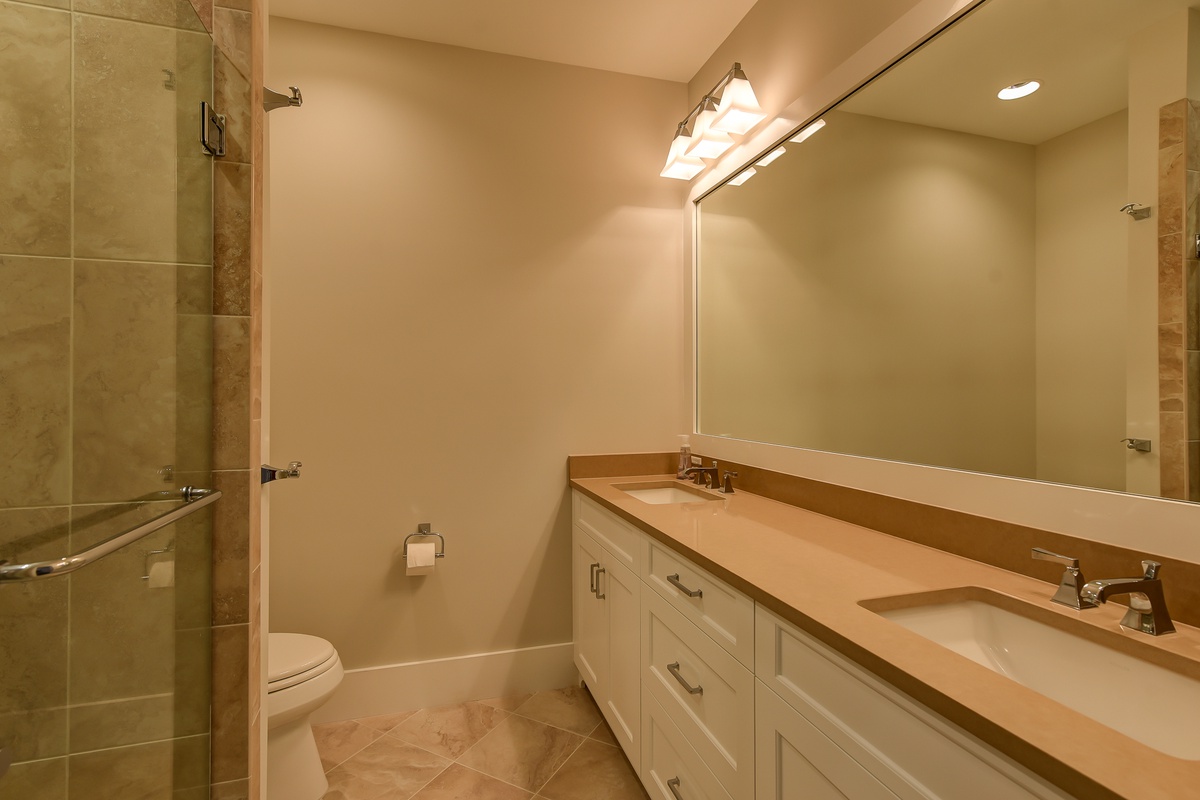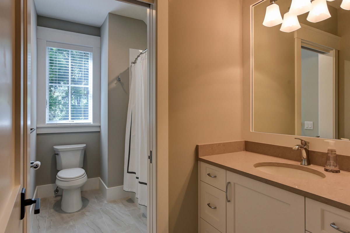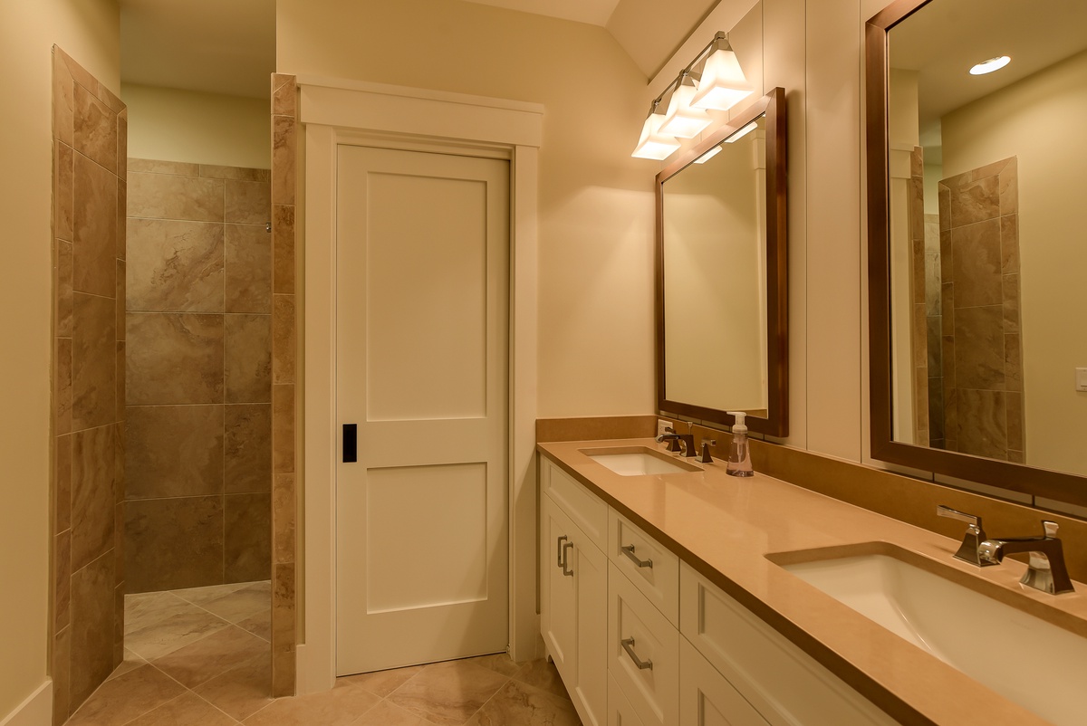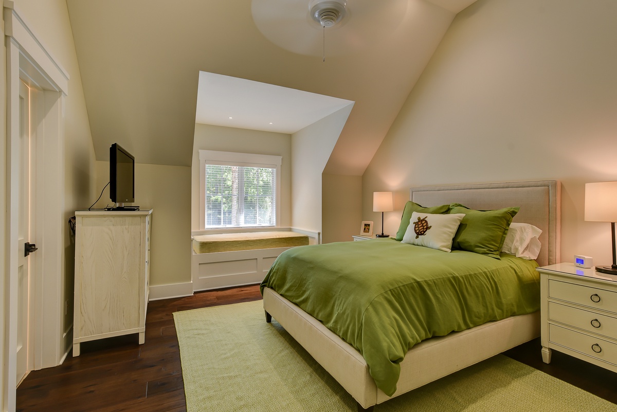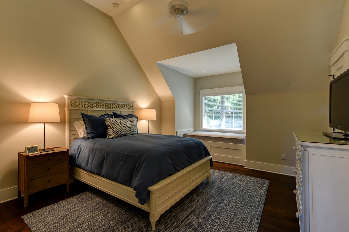 Three more guest rooms on the second floor enjoy their own washer and dryer, as well as luxurious resort-style amenities. In one, vaulted ceilings soar over a queen-size bed in a space with a built-in desk, flat-screen tv and en suite with tub and shower. A similar design in a second bedroom sees a queen-size bed paired with a large window seat, along with flat-screen TV and en suite with dual basins and walk-in shower boasting a rainfall showerhead. You’ll find the same luxurious amenities, along with the same lush spaciousness, in the third upstairs bedroom.