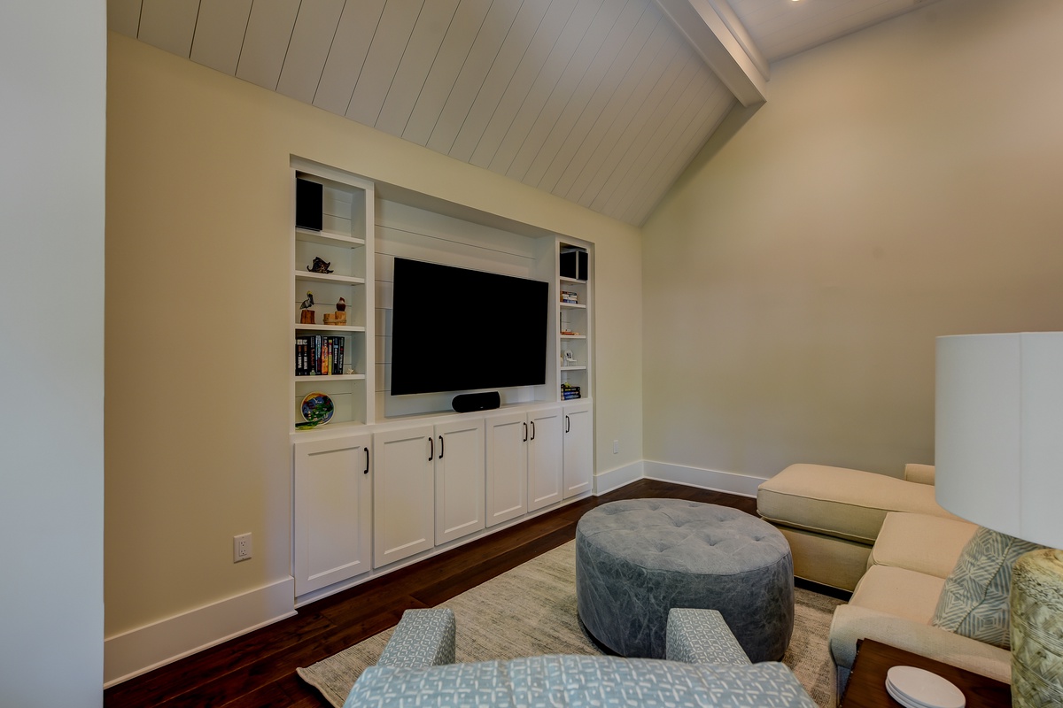Adding to the tranquility of the third floor is a spacious den, enjoying cathedral ceilings above a wide sectional sofa and armchair fronting a media system with flat-screen TV, Blu-ray player and surround sound for the full theatre experience.
