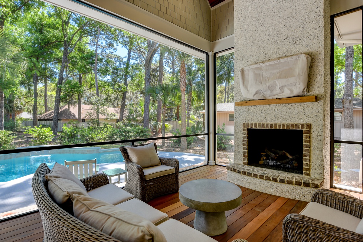 A nearby screened-in lanai completes the outdoor experience, with a flat-screen TV set above a decorative tabby fireplace offering the ultimate in relaxation.