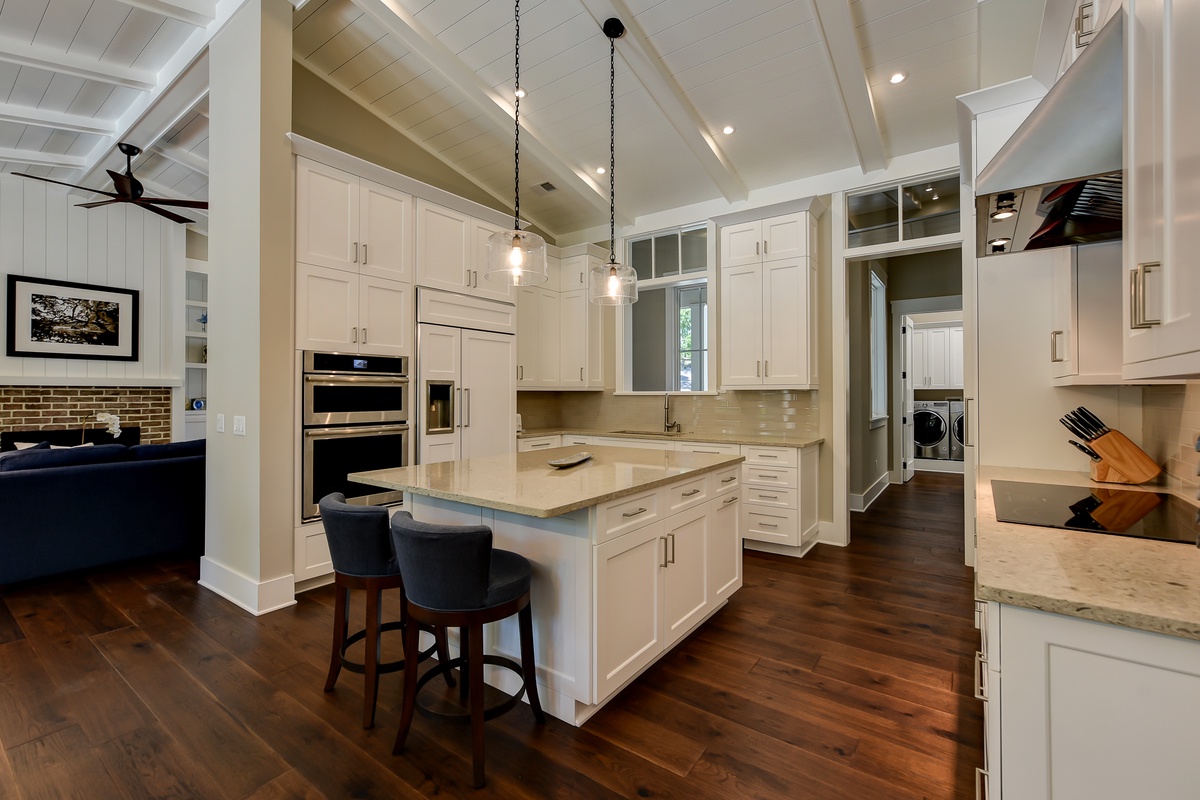 Tucked away on a quiet private street, this vacation home offers you the finest in Lowcountry living, with a sense of open airiness that greets you as soon as you walk in. Beneath cathedral ceilings, an open living room sees a chic coastal-inspired sofa and loveseat fronting a decorative fireplace flanked by custom built-ins containing a large flat-screen TV. Just steps away, but uniquely designed for its own sense of space, the gourmet kitchen revels in high-end appliances, quartz counters and tall ceilings. Bar seating for two at the wide center island adds to further seating for six at a dine-in table.