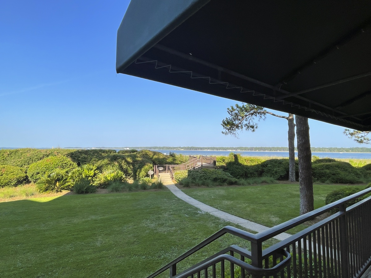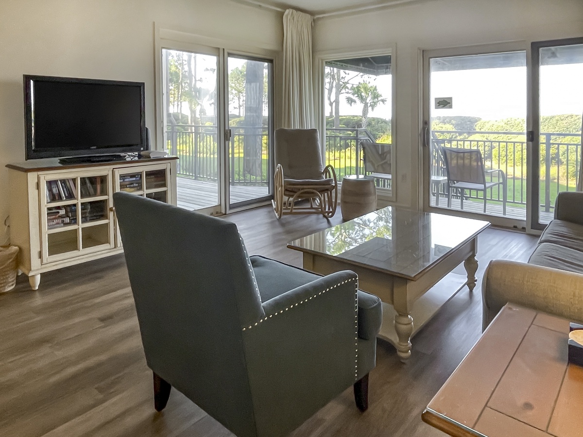 This view surrounds the living room, with two sets of doors giving 270-degree views and lending lush natural light to a space with sleeper sofa, armchair and a rocker facing a large flat-screen TV. Step out either of those doors and you’re on a blissfully tranquil covered patio with al fresco dining and soothing sea breezes. Just steps away, a trail winds to the sandy shores at the edge of the Calibogue Sound.