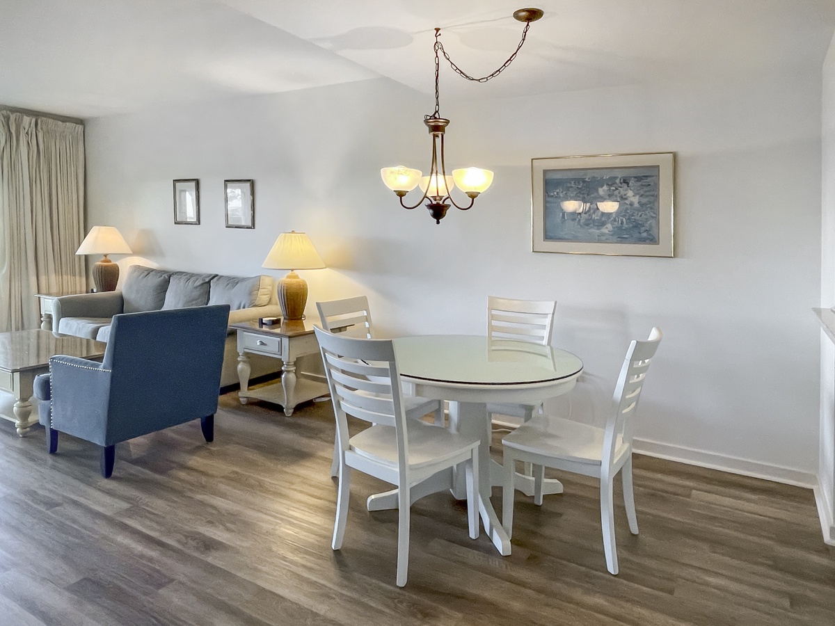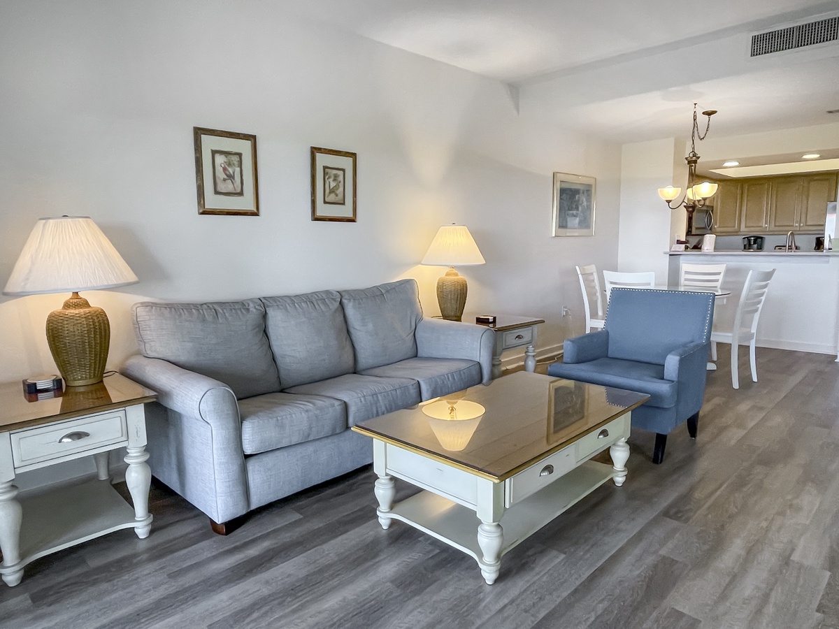 The star of the show is the majestic view of the dunes, and the private trail that winds between them right to the beach. This view floods the main living space, which has been masterfully opened to take full advantage. It reaches into the updated kitchen, with its granite counters, stainless steel appliances and spacious pass-through. This opening provides easy access to the dining room, which offers space for four in the round.