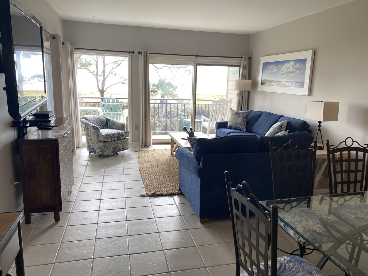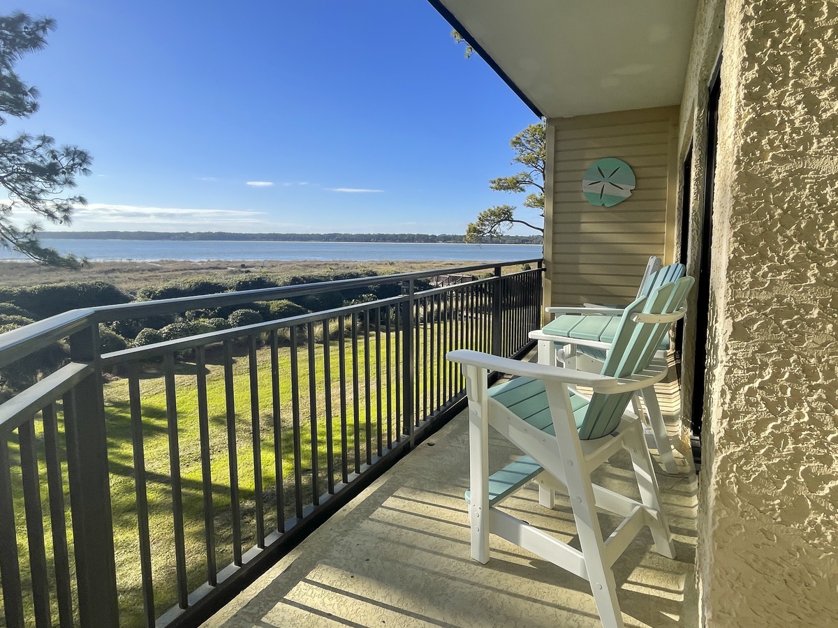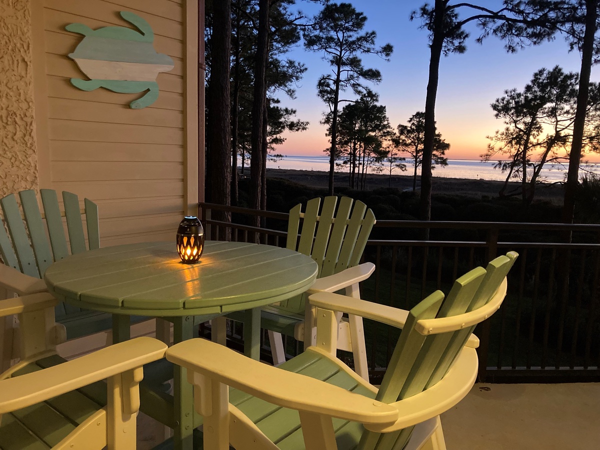 From the moment you step in, the open floor plan guides you towards that beautiful, water-front scenery. The open concept kitchen enjoys all the amenities of home. Enjoy meals at the bar seating for two or at the dining room table for six. The living area features a sleeper sofa and loveseat facing a massive flat-screen TV. The panoramic scenery is visible throughout the open-concept kitchen, dining, and living space. Step through either of two different sliders and you’ll find yourself on a spacious wraparound porch gazing at the dunes and the waters below. Deer are often seen browsing in the dunes, and dolphin can almost always be spotted playing in the surf of Calibogue Sound. The patio is wonderfully appointed with a bistro table with four balcony-height Adirondack Chairs, with an additional two-chair unit at the other end of the outdoor space. This allows for superb beachside al fresco dining for up to six guests. Beautiful sunset views can be enjoyed nightly from both balconies and every window in the villa.
