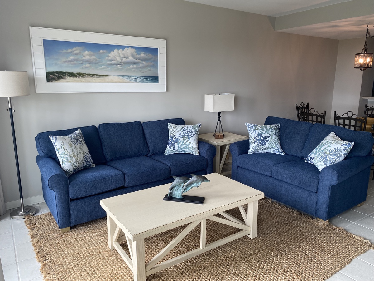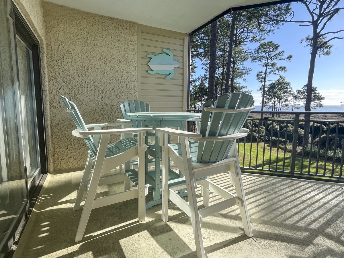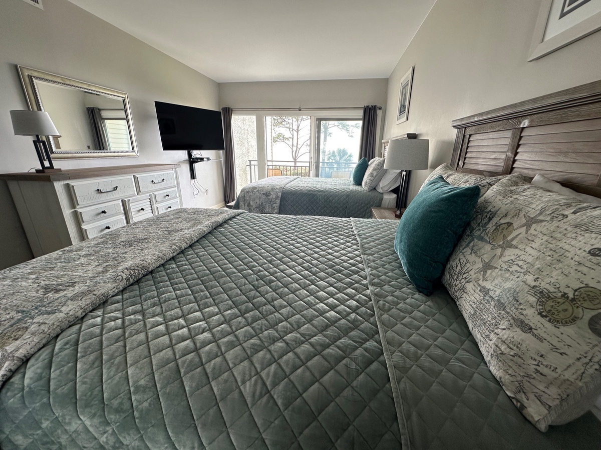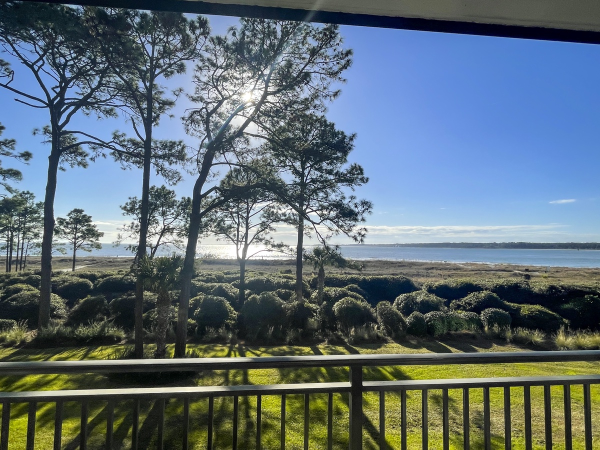 From the moment you step in, the open floor plan guides you towards that beautiful, water-front scenery. The open concept kitchen enjoys all the amenities of home. Enjoy meals at the bar seating for two or at the dining room table for six. The living area features a sleeper sofa and loveseat facing a massive flat-screen TV. The panoramic scenery is visible throughout the open-concept kitchen, dining, and living space. Step through either of two different sliders and you’ll find yourself on a spacious wraparound porch gazing at the dunes and the waters below. Deer are often seen browsing in the dunes, and dolphin can almost always be spotted playing in the surf of Calibogue Sound. The patio is wonderfully appointed with a bistro table with four balcony-height Adirondack Chairs, with an additional two-chair unit at the other end of the outdoor space. This allows for superb beachside al fresco dining for up to six guests. Beautiful sunset views can be enjoyed nightly from both balconies and every window in the villa.