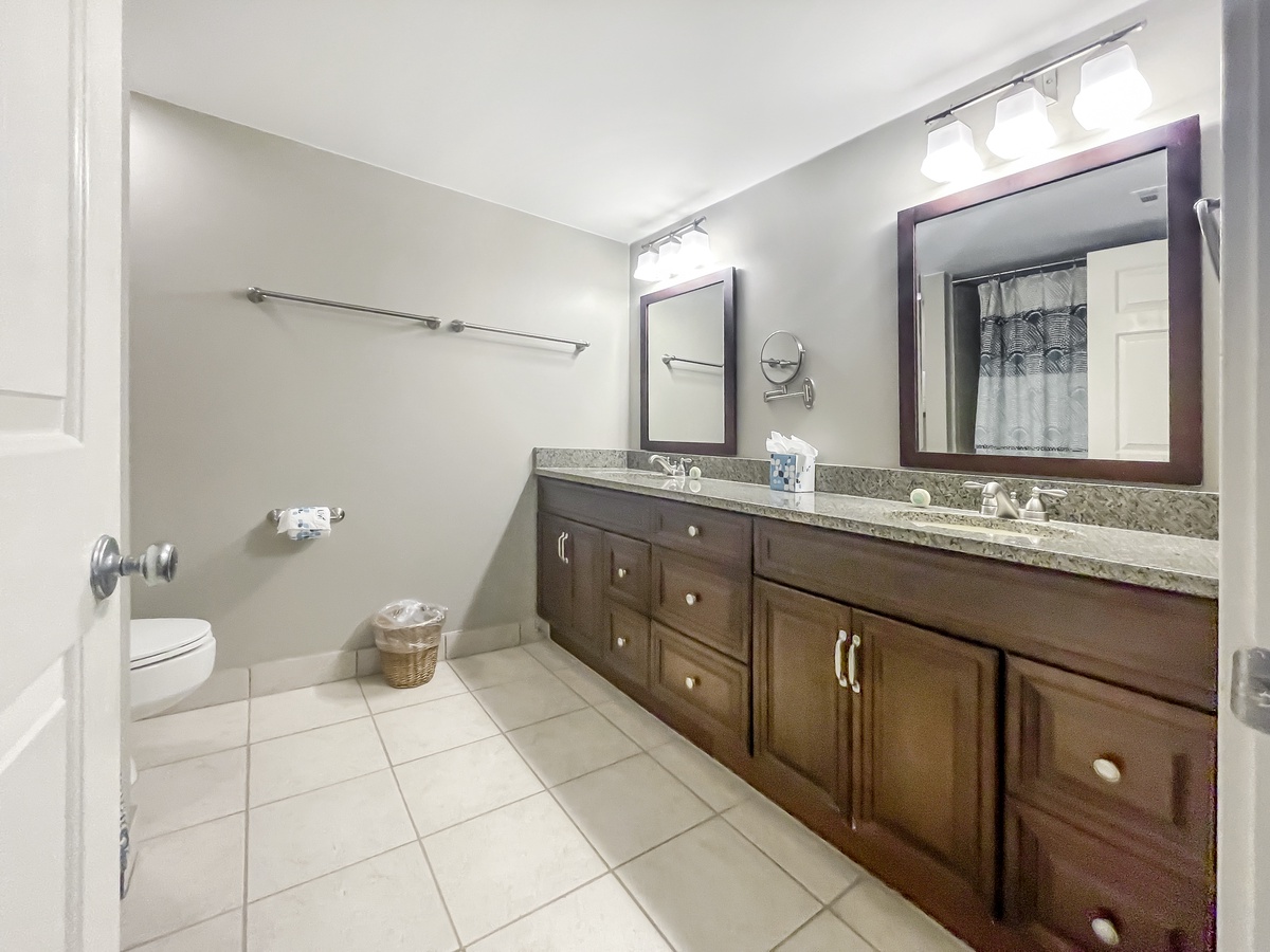 Flanking the main living space are a pair of grand suites boasting luxury resort amenities. In one suite, a pair of queen beds anchor a space with flat-screen TV, sliders out to a private balcony and an en suite with tub and shower. On the far side, the master suite enjoys a king-size bed as well as a flat-screen TV, wide desk, private access to the outdoor dining and an en suite with walk-in shower boasting rainfall showerhead and bench.