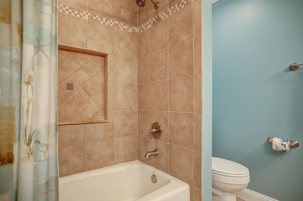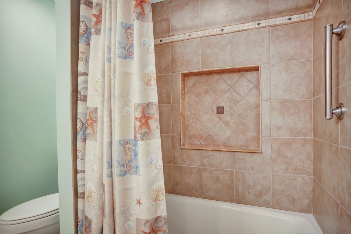 The second bedroom also carries a rich sense of space, placing two queen beds in seashell linens opposite a wall-mounted flat-screen TV with DVD player. This room enjoys access to the property’s main patio through a set of sliding-glass doors that frame a magnificent view of the water.