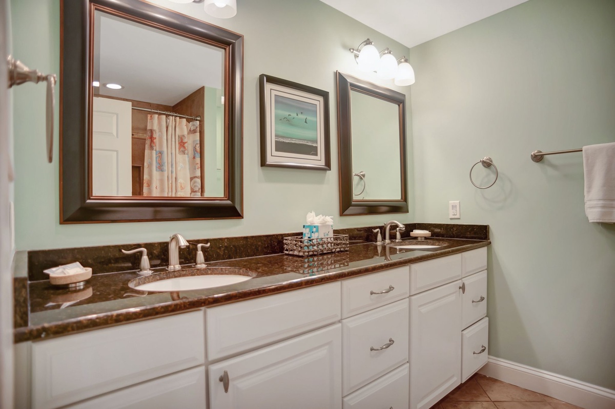 Each bedroom’s en suite is a mirror of the other’s, with spacious countertops in black marbled granite and dual basins, plus a roomy tub and shower set in exquisite tilework.