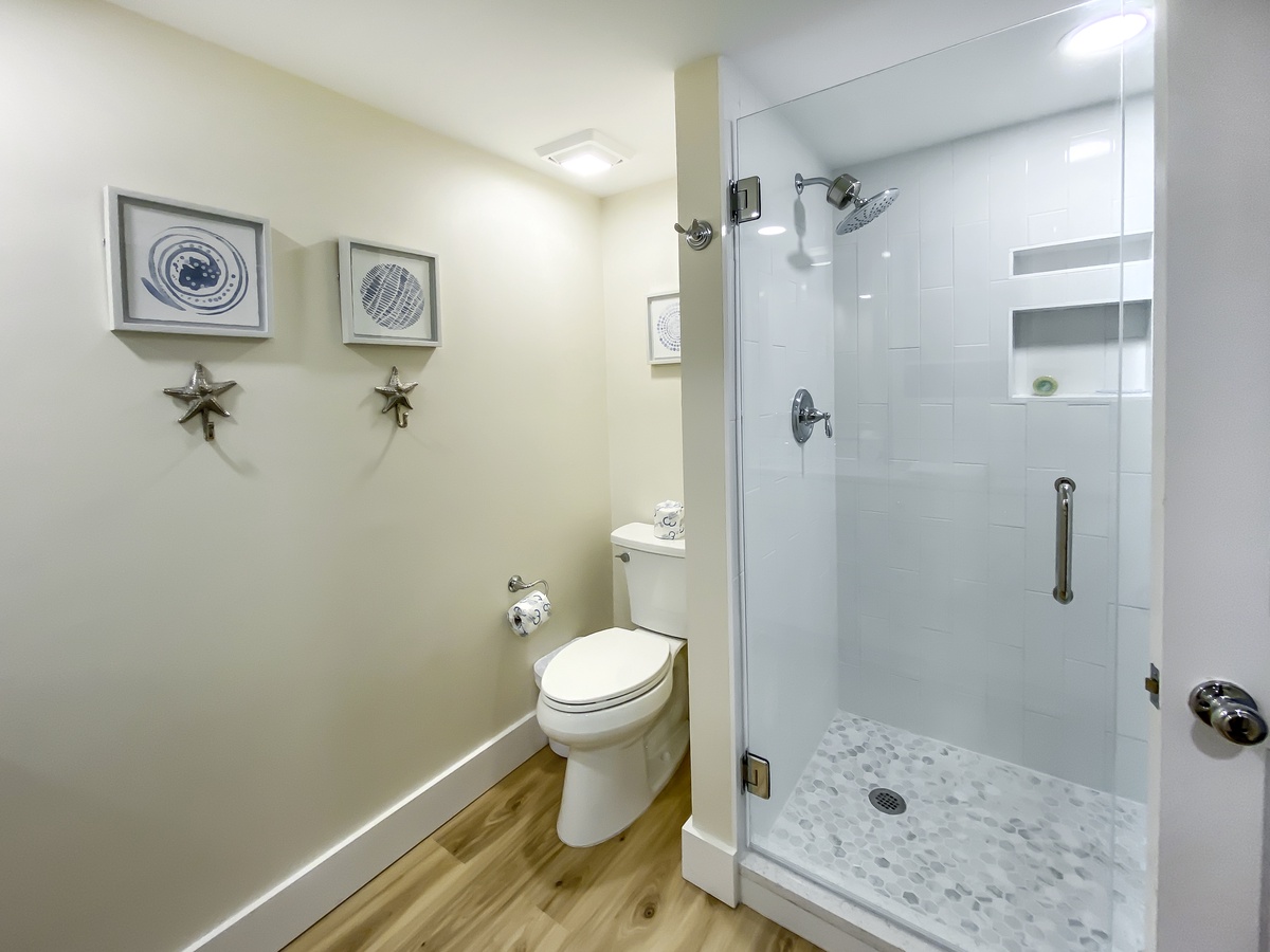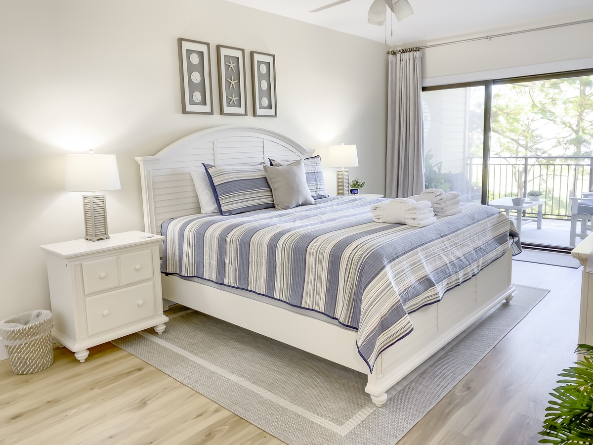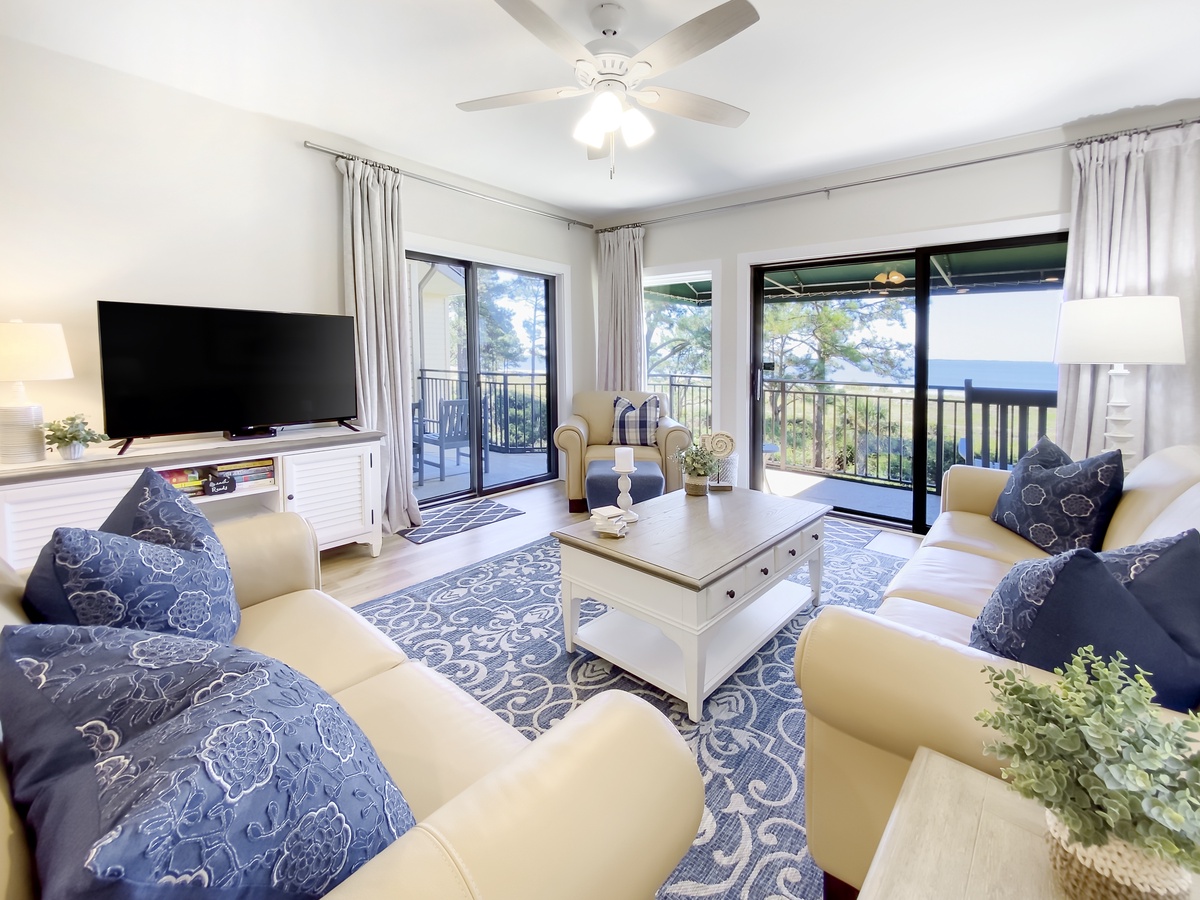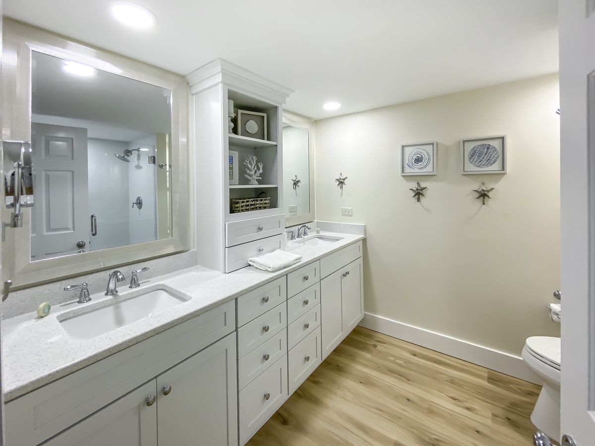 Both rooms enjoy an exquisite sense of comfort and four-star amenities to rival any luxury resort in the world. The queen bedroom sees dual queen beds set before a private balcony overlooking the sound with a TV, and offers a spacious en suite bath with tub and shower. At the other end of the villa, the owner’s suite dials up the comfort with a king size bed, there is NO TV, expansive private balcony and glamorous en suite bath boasting dual basins, plentiful built-ins and a cavernous walk-in shower.