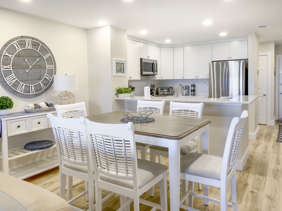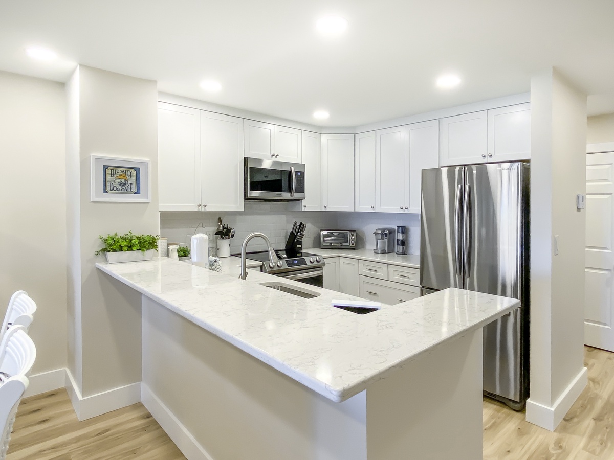 Indulge in comfort amid the living room’s overstuffed leather sofas as you gaze out across the dunes, or step just through a set of sliders and breathe the salt air from the waters just beyond your covered deck. Inside you’ll find plentiful room for entertaining, with a two-tone dining table seating six amid coastal chic splendor and a spacious kitchen with wide bar in creamy quartzite spilling down to wraparound counters and state-of-the-art appliances.