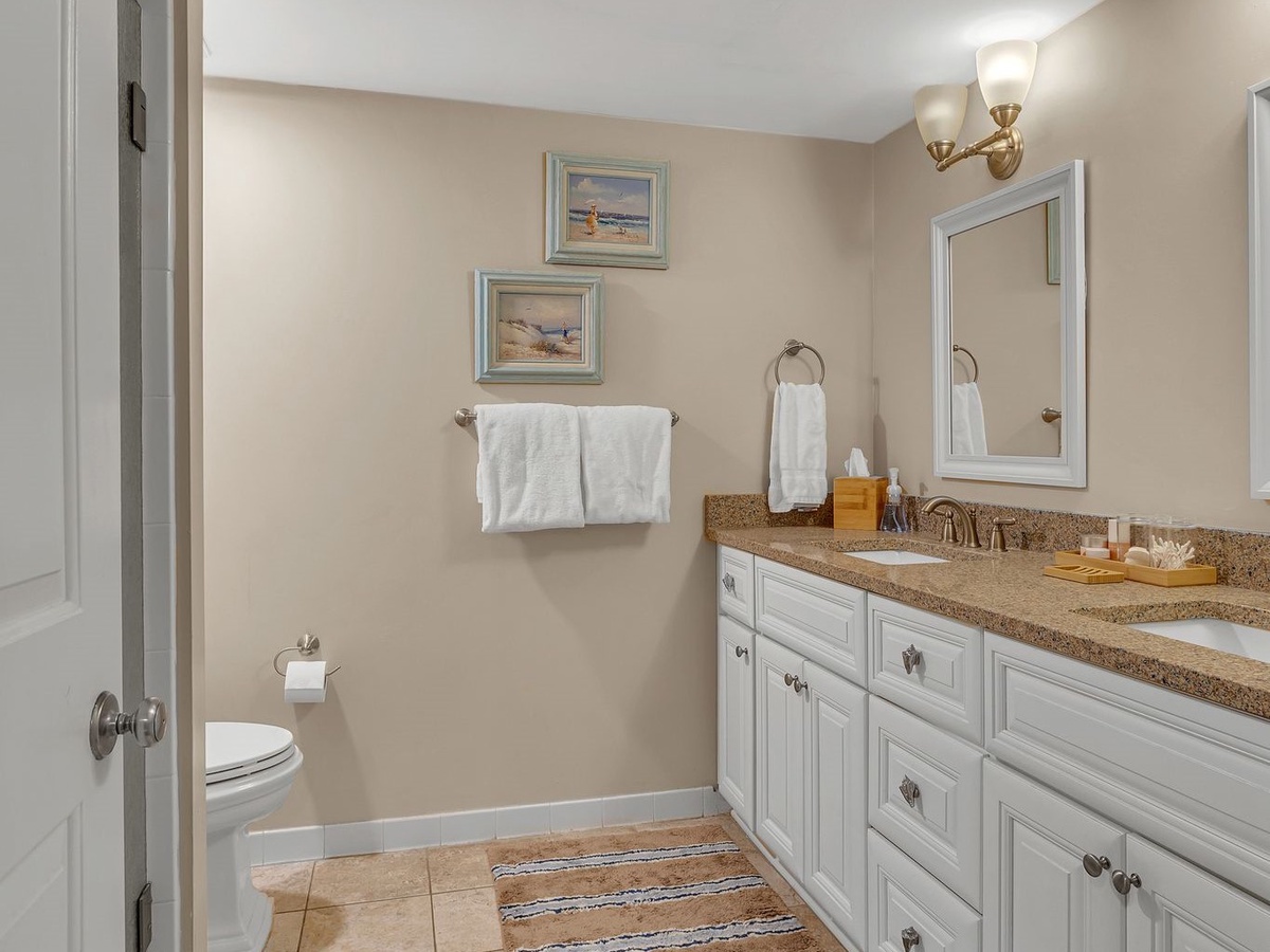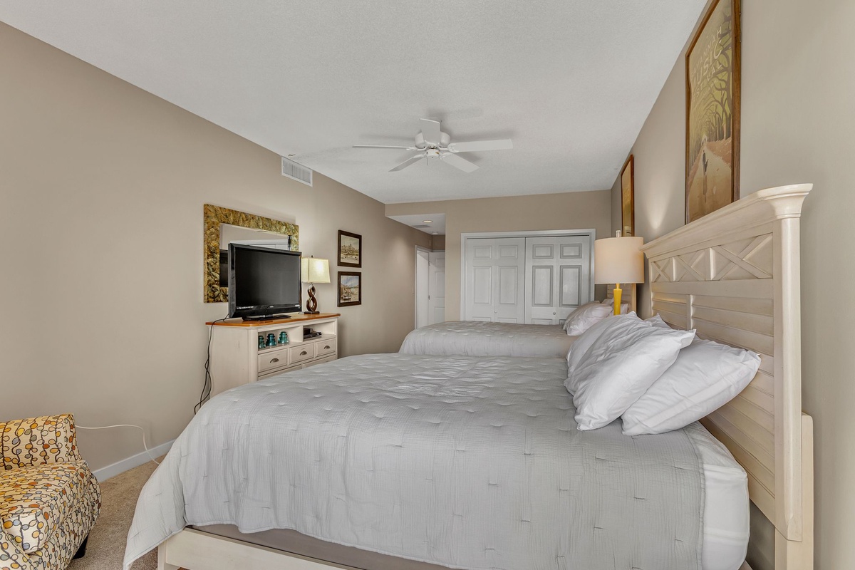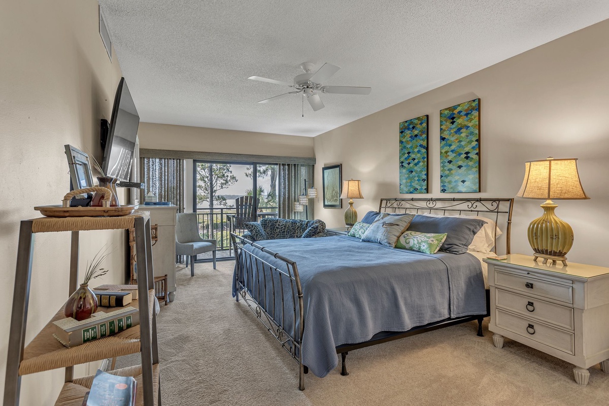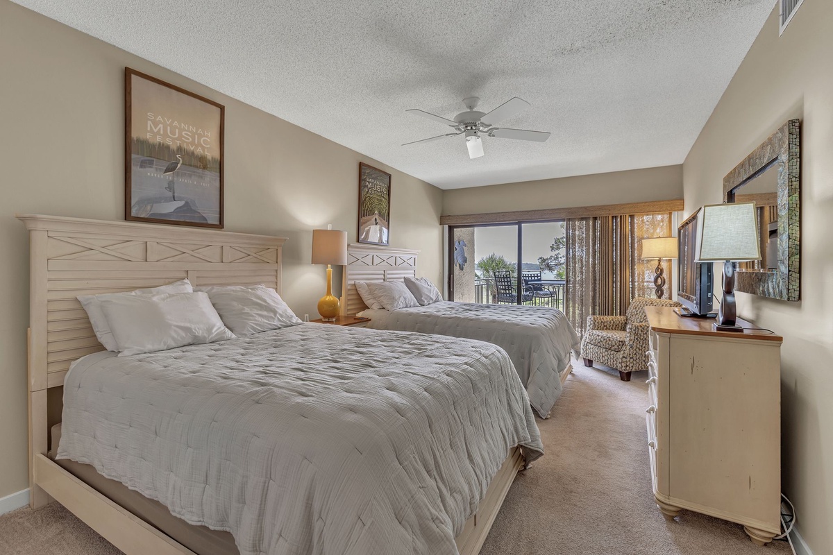 Each of the villa’s suites paints its own picture of Lowcountry serenity. In one, a pair of queen-size beds rest beneath a ceiling fan in a space with flat-screen TV, private patio access, and en suite bath with dual-basin vanities. The other surrounds a king-size bed in tones of coastal blues and greens, with ceiling fan, flat-screen TV, private patio and en suite bath with dual-basin vanity.