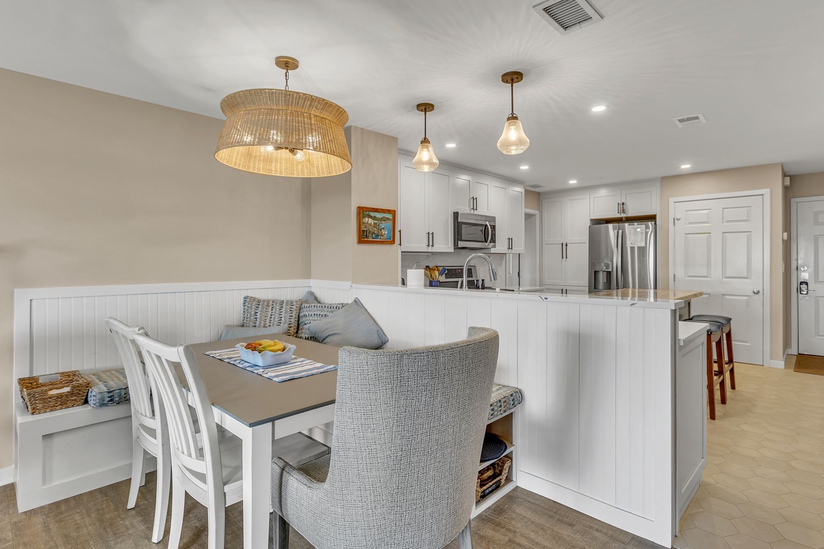Passing over the countertops, a comfortable dining nook has been crafted through custom built-ins that envelope dining for six beneath a coastal-inspired chandelier. Just beyond, the main living room sees a leather sofa and dual armchairs set before a flat-screen TV and wrapped in water views. Sliders to one side open to an elevated patio blessed by sea breezes.