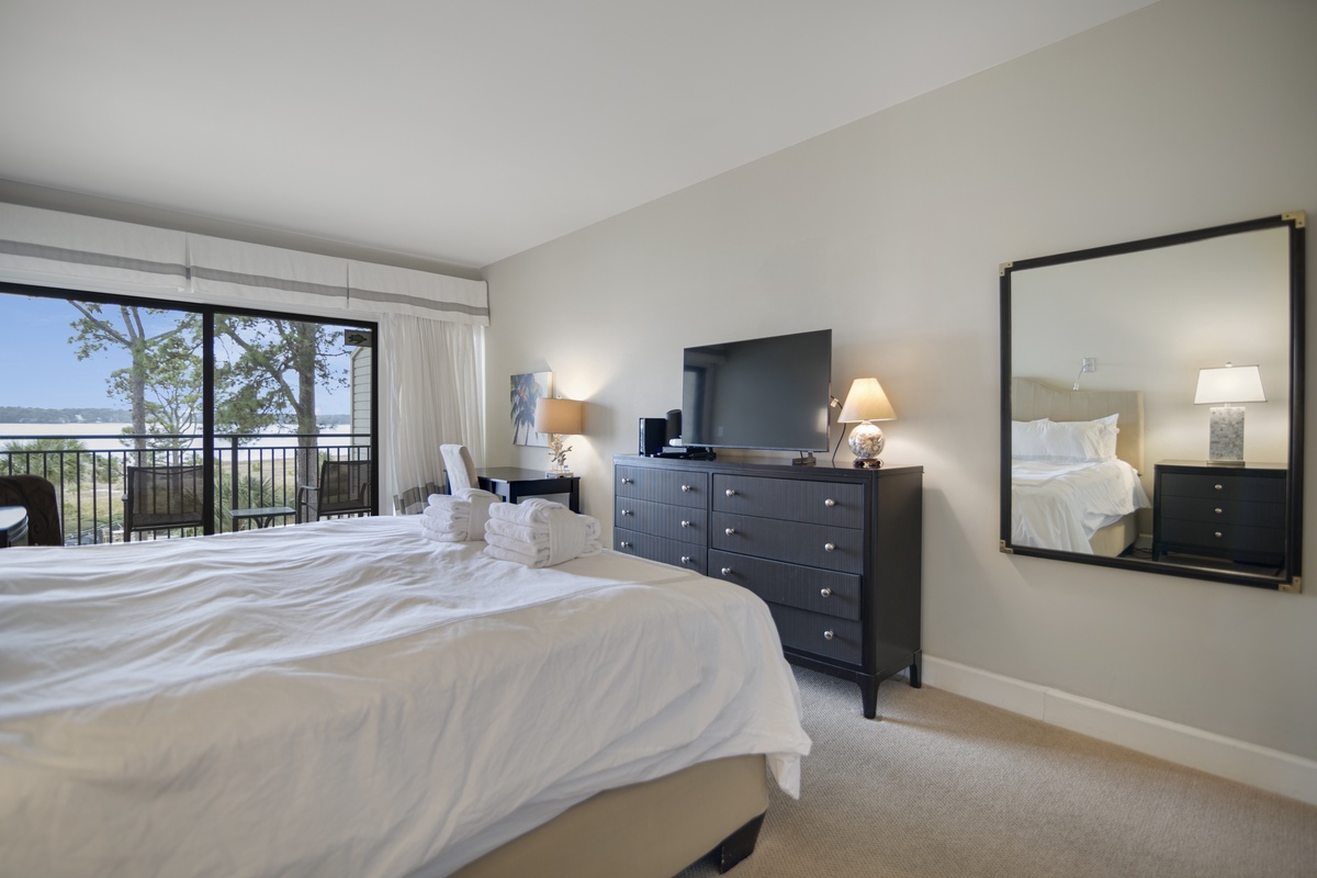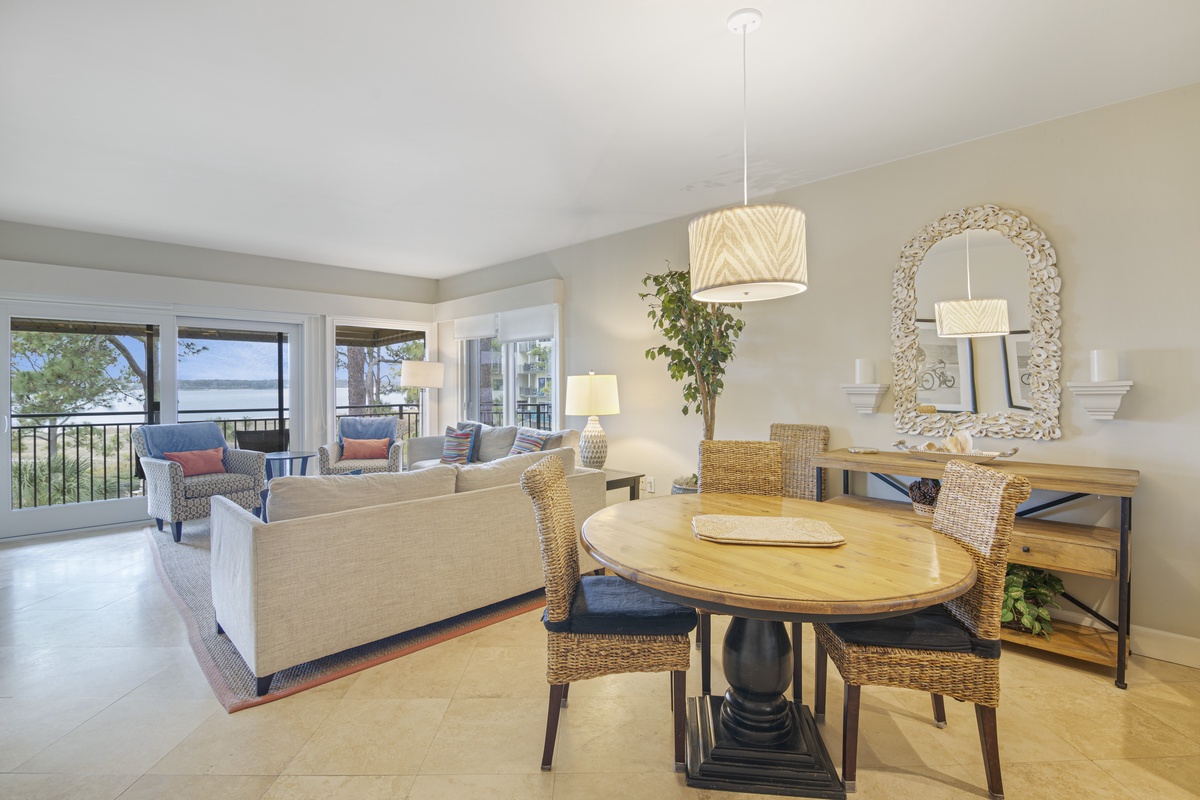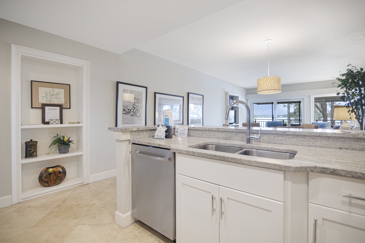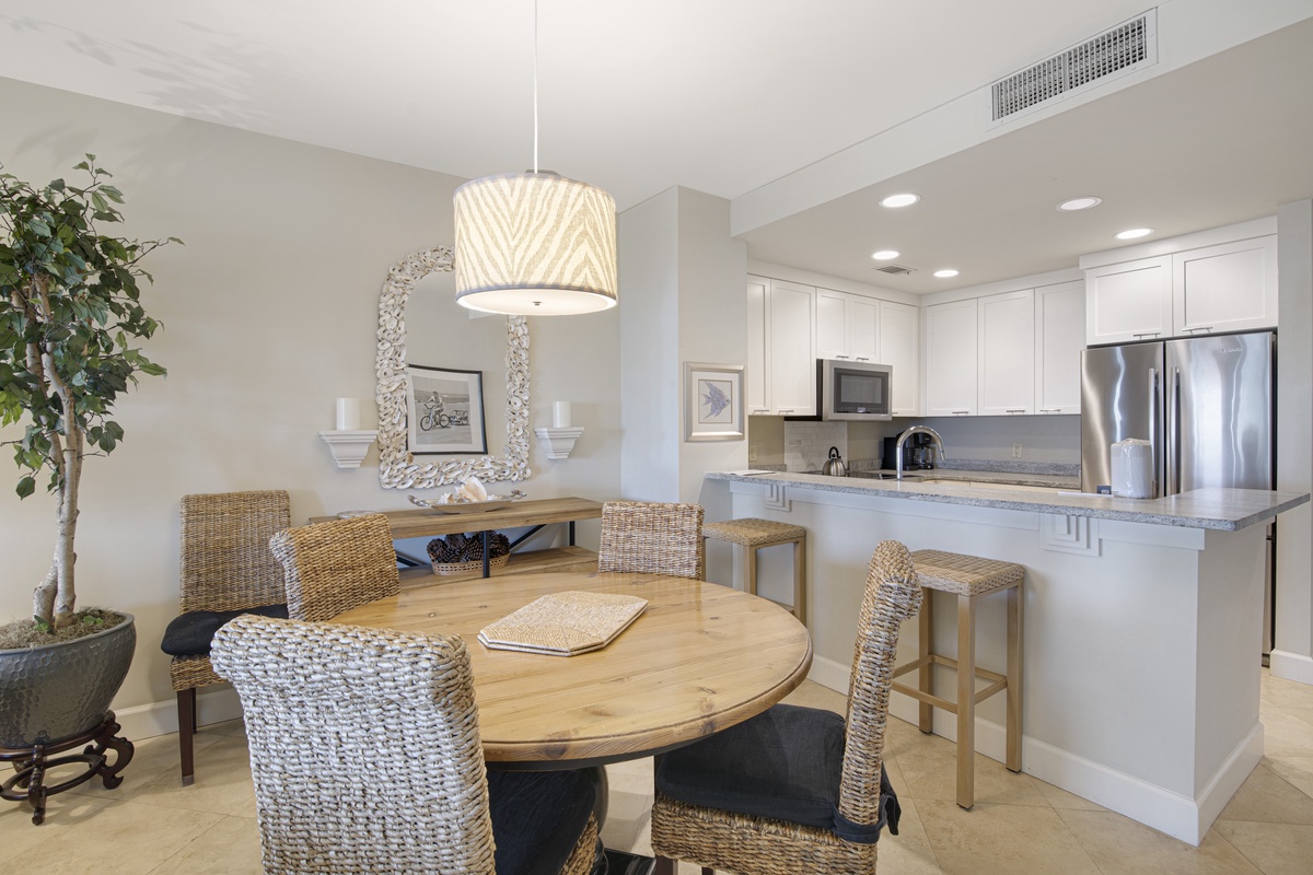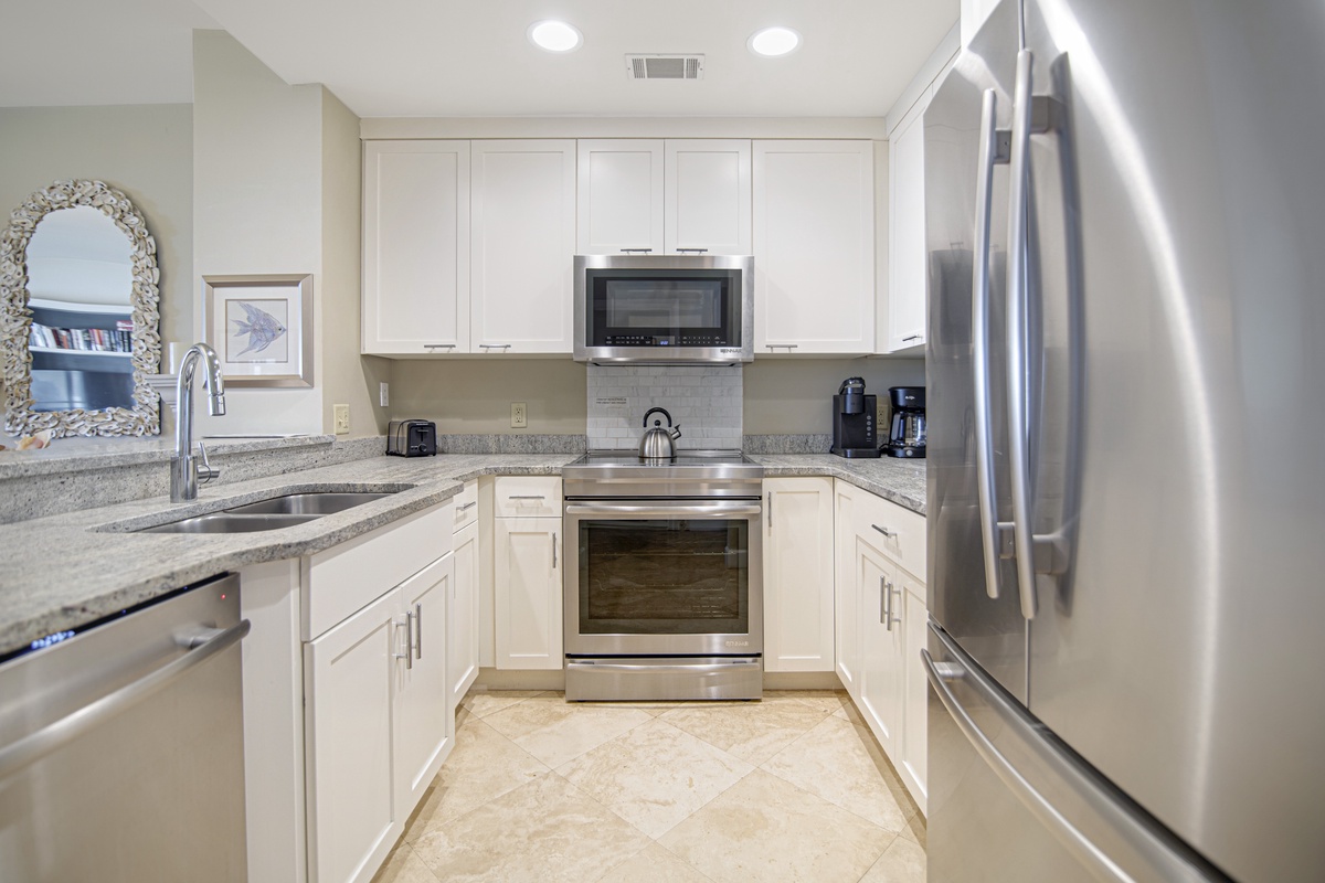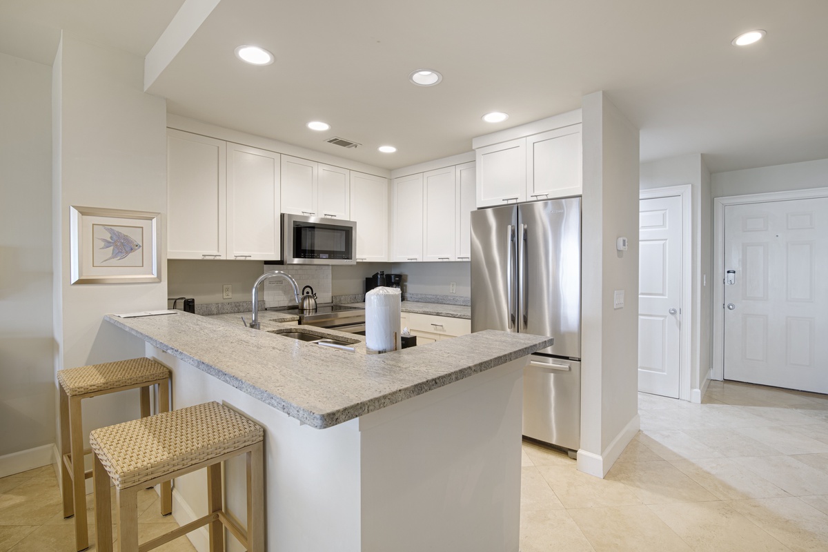 Every inch of the interior has been infused with sophisticated coastal style, where fresh and clean whites find playful elegance. The roomy kitchen includes stainless steel appliances, cream cabinets with brushed nickel hardware and a raised bar-height counter with seating for two.