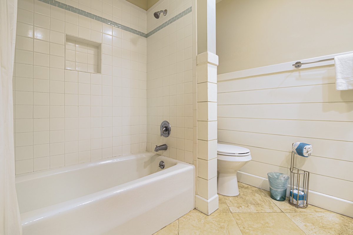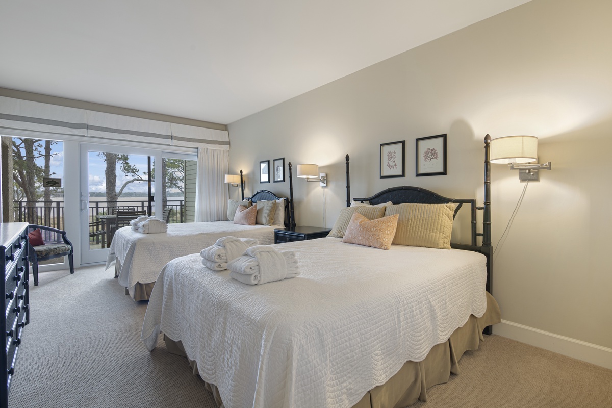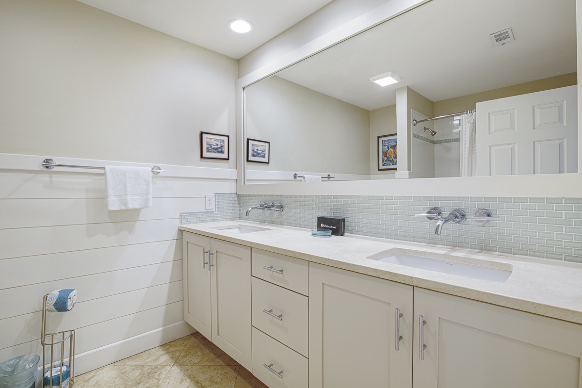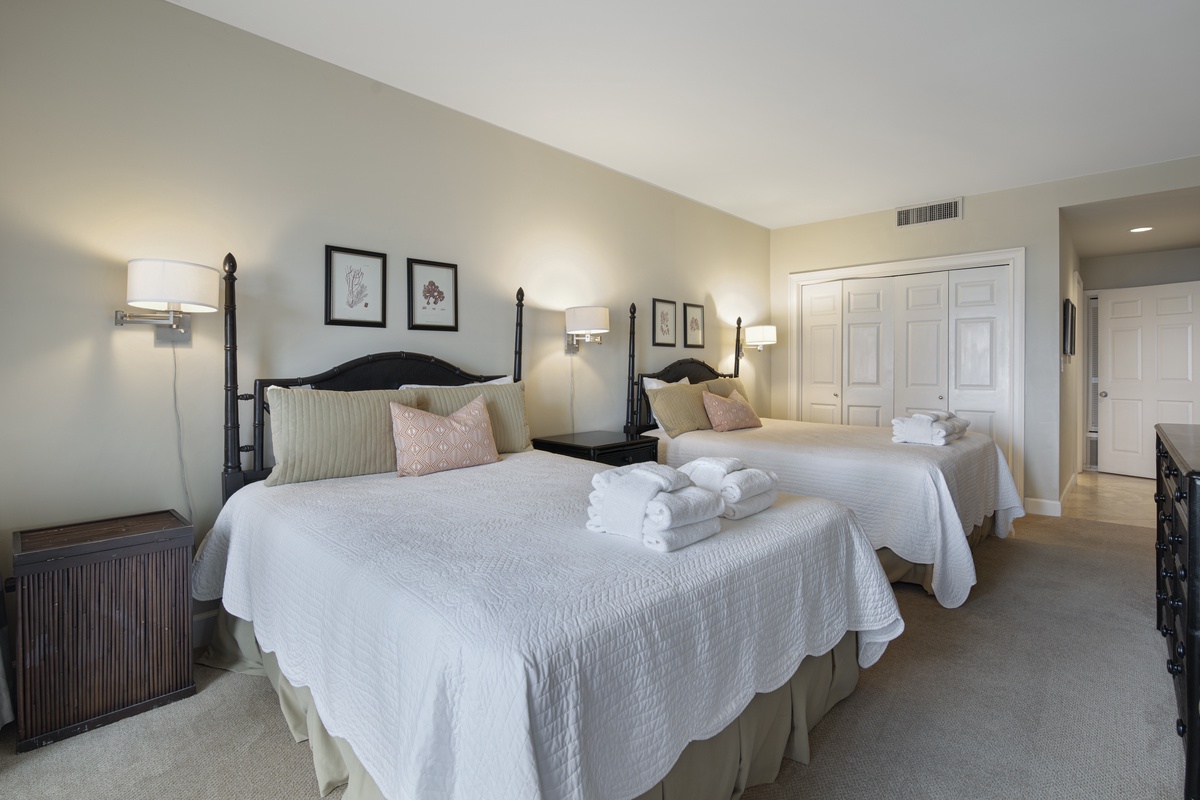 The second bedroom pairs two queen size beds, a flat-screen TV, but you’ll spend most of your viewing time gazing out the sliding glass doors out to the porch and the ocean beyond. An en suite rounds out the luxury of this space with its own dual-basin stone-topped vanity, seaglass tilework and tub shower combo.