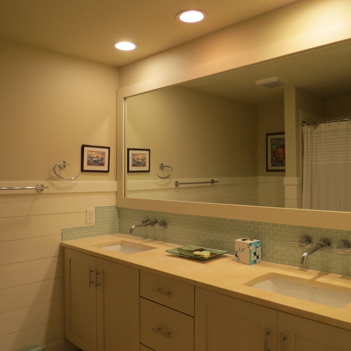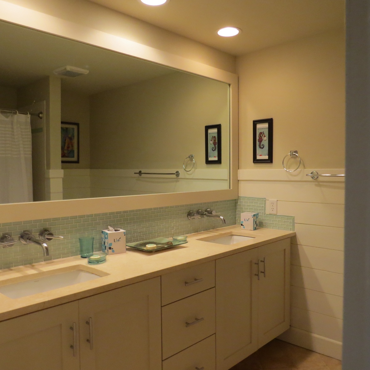 The second bedroom pairs two queen size beds in rich creams against dark tropical inspired furnishings. A flat-screen TV with DVD and VHS provides entertainment, but you’ll spend most of your viewing time gazing out the sliding glass doors out to the porch and the ocean beyond. An en suite rounds out the luxury of this space with its own dual-basin stone-topped vanity, seaglass tilework and tub shower combo.