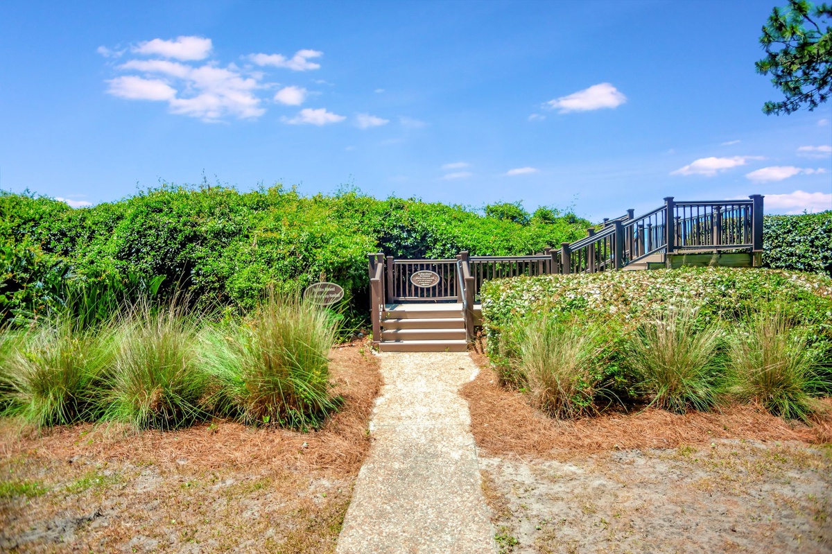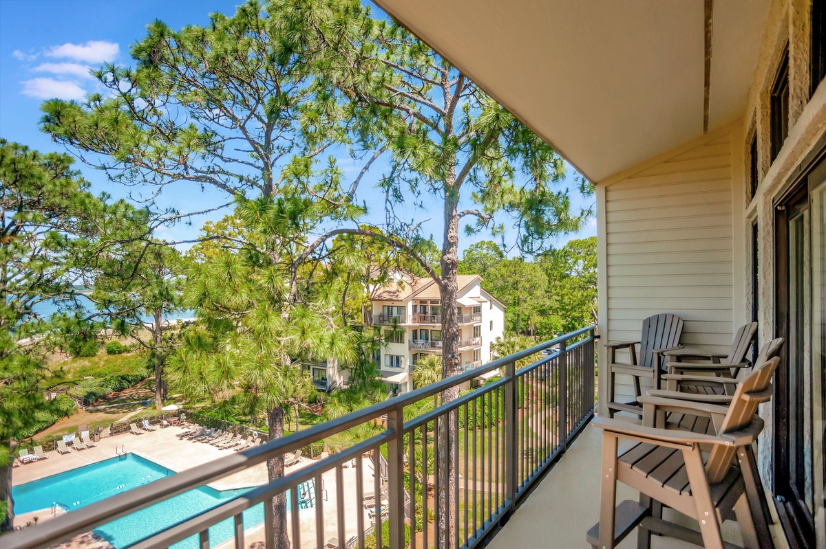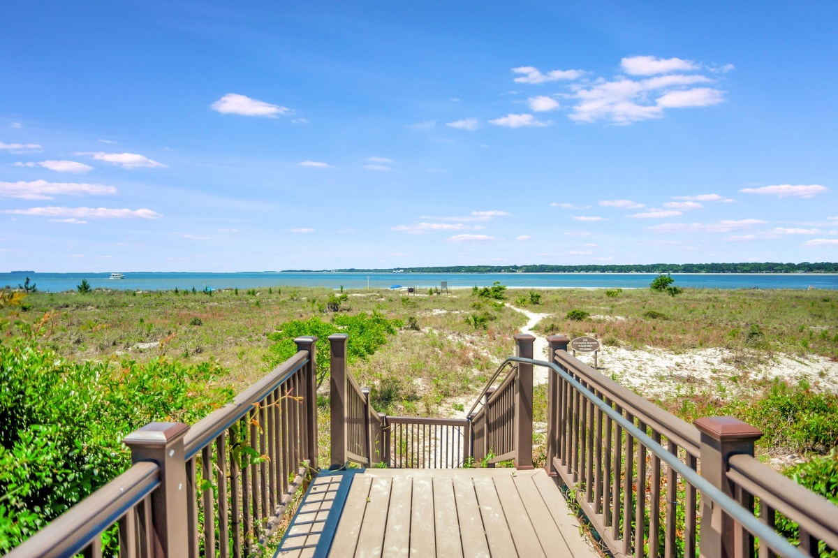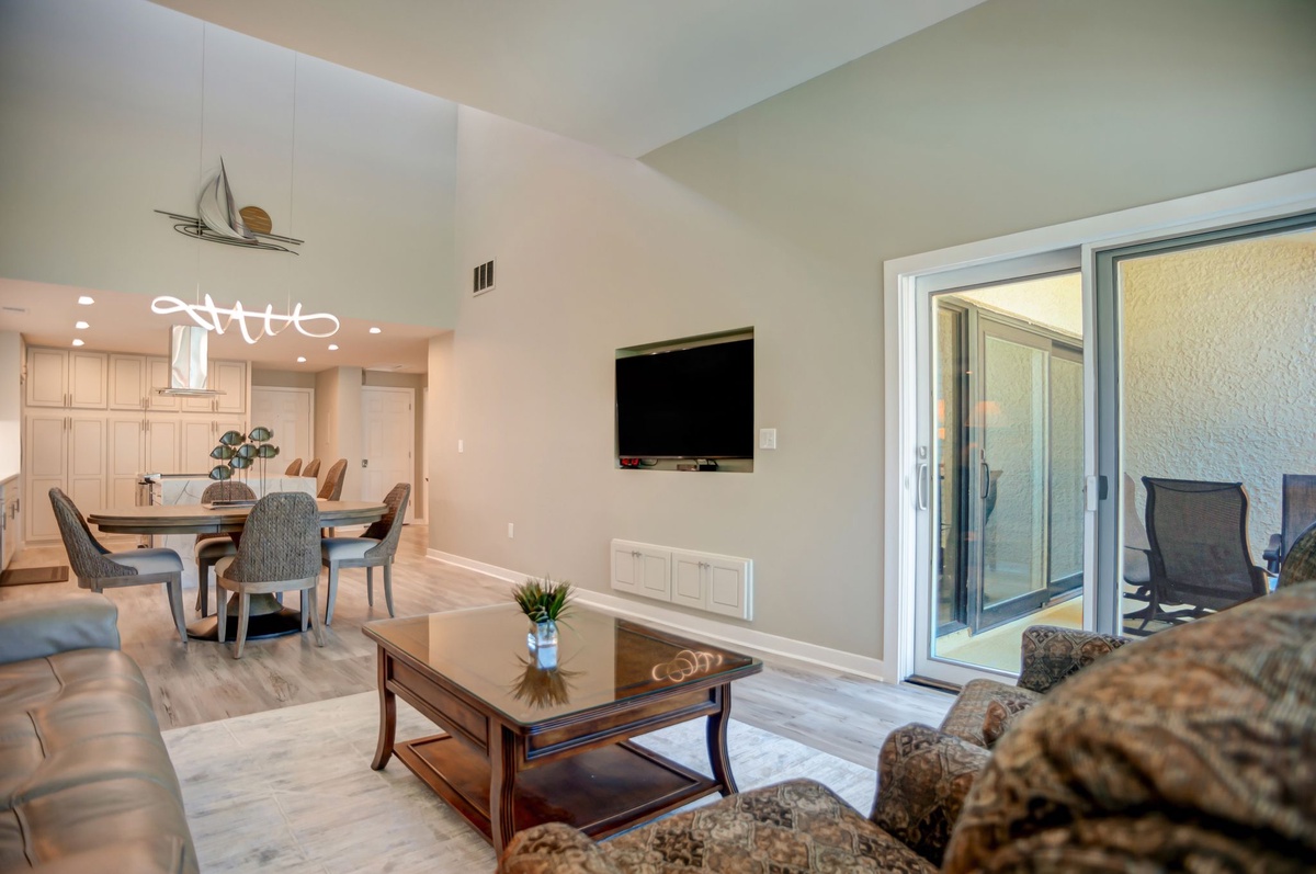 Just past that, the grand living space exults in sky-high views through a panorama of windows. The elegant leather sofa with power recliners may be oriented toward the recessed flat-screen TV, but the real star is the scenery. Step through sliders and you’re basking in elevated views across the dunes toward the sparkling waters of the Calibogue Sound, with high-top al fresco seating to drink it in.