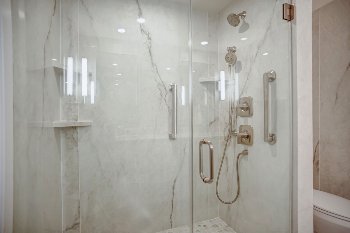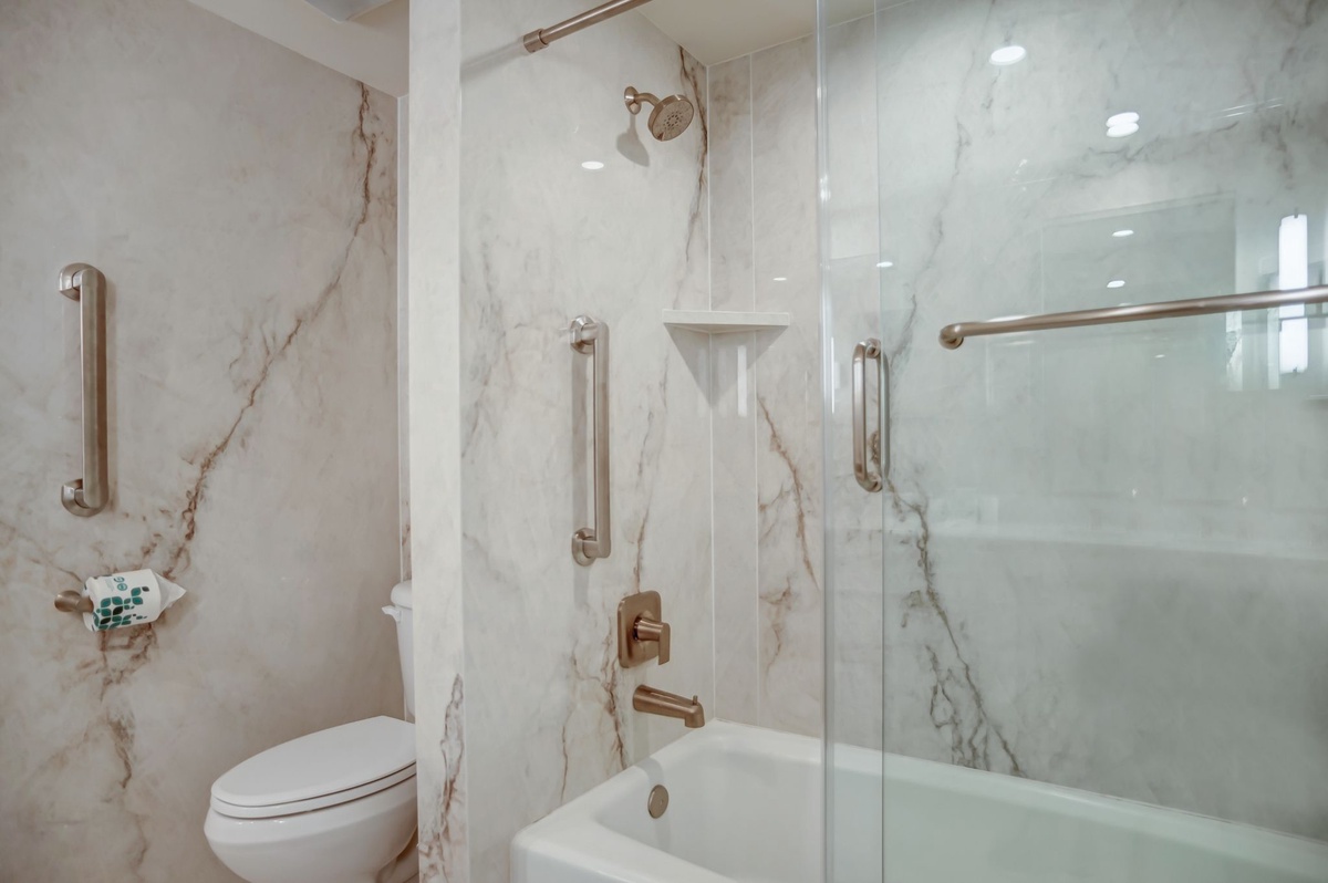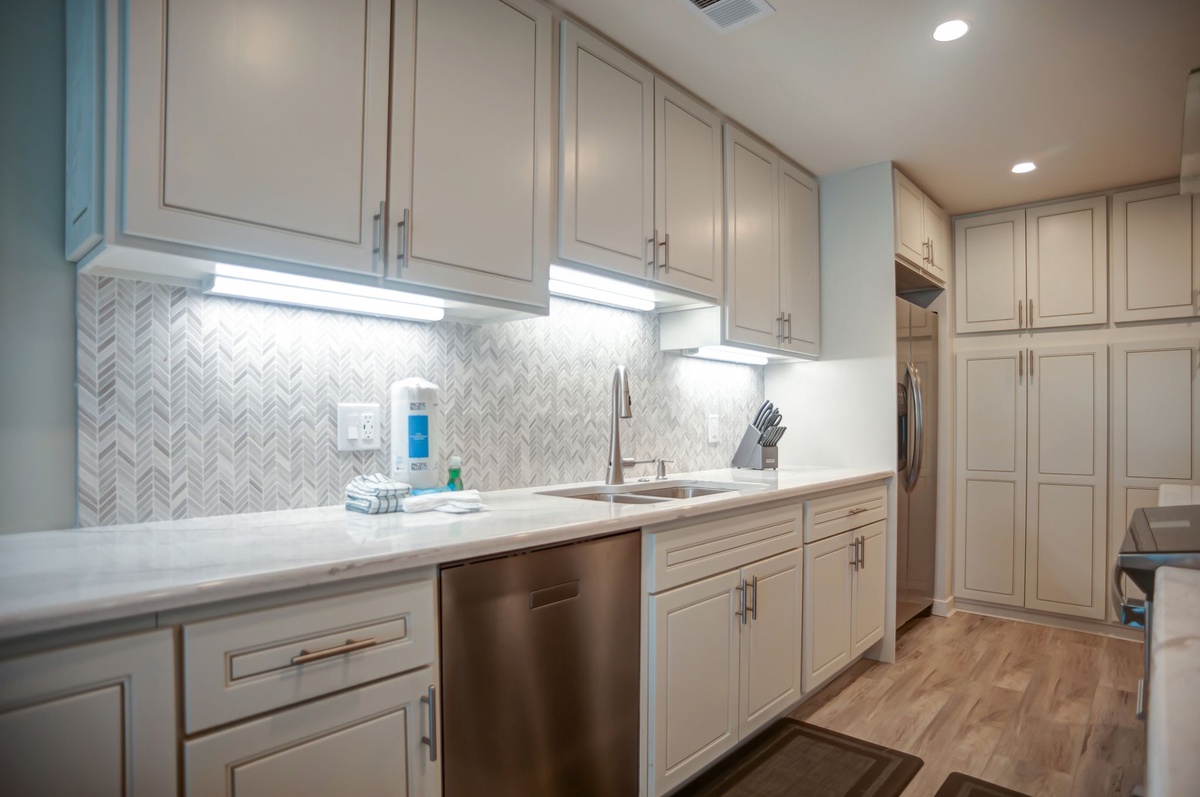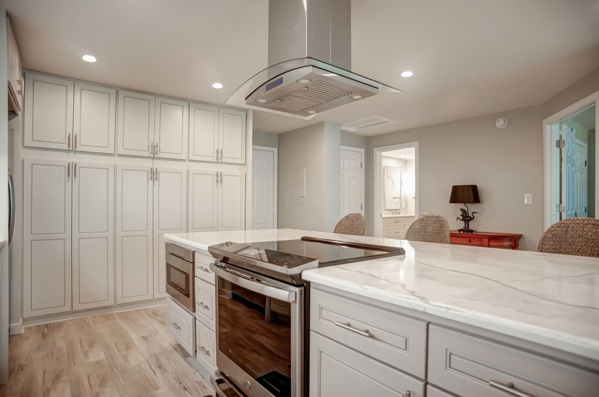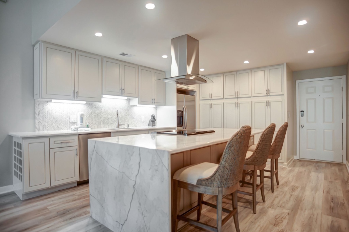 Meticulous updates have graced each sun-kissed space with vibrant modern style. As you enter, luxury flooring guides your eye toward the massive waterfall island of marbled granite. Boasting bar seating for four and a flat cooktop stove beneath a custom range hood, this statement piece anchors a gourmet kitchen stocked with state-of-the-art appliances and ringed by custom cabinets.