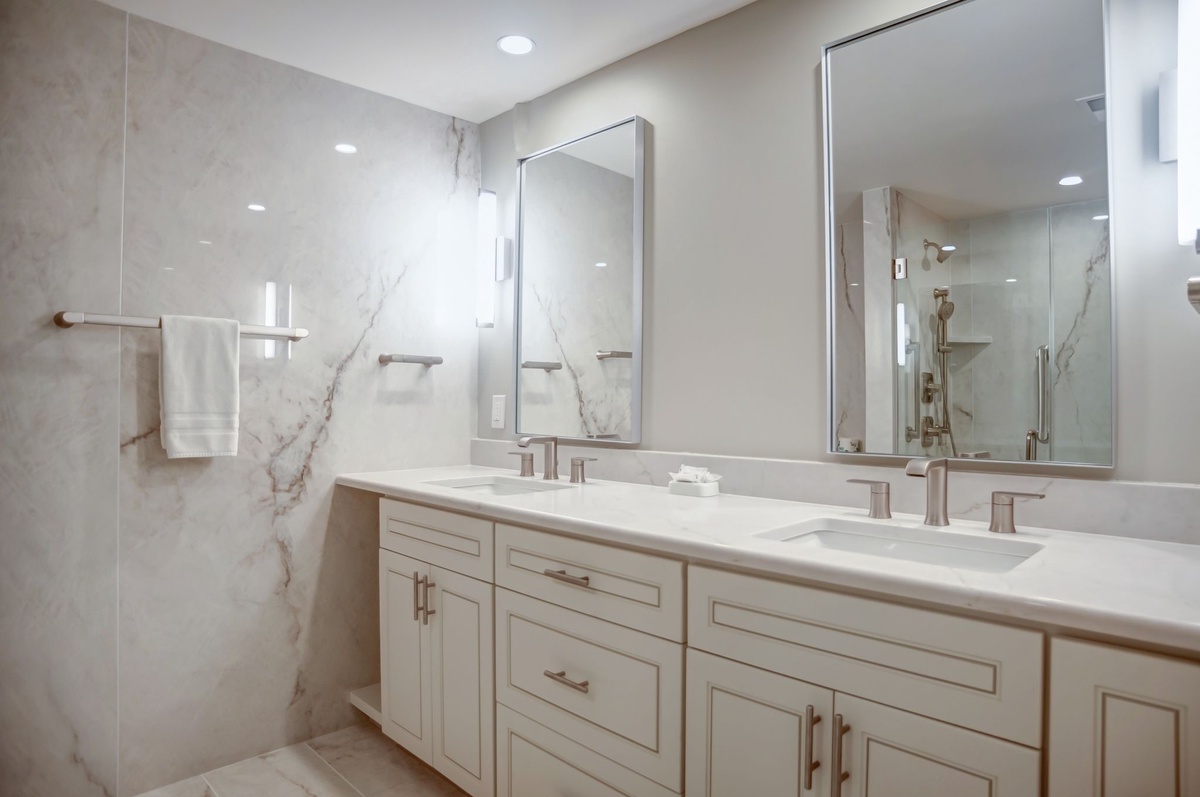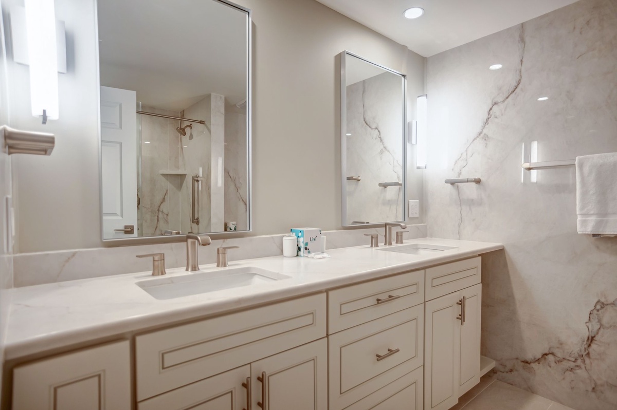 At the other end of the property, a full suite pairs dual queen beds with a private balcony, offering recessed flat-screen TV and en suite bath with dual-basin vanity and massive walk-in shower.
