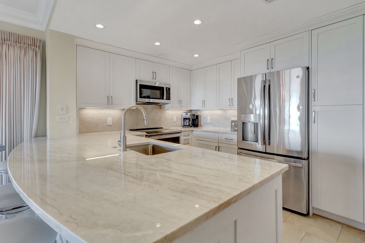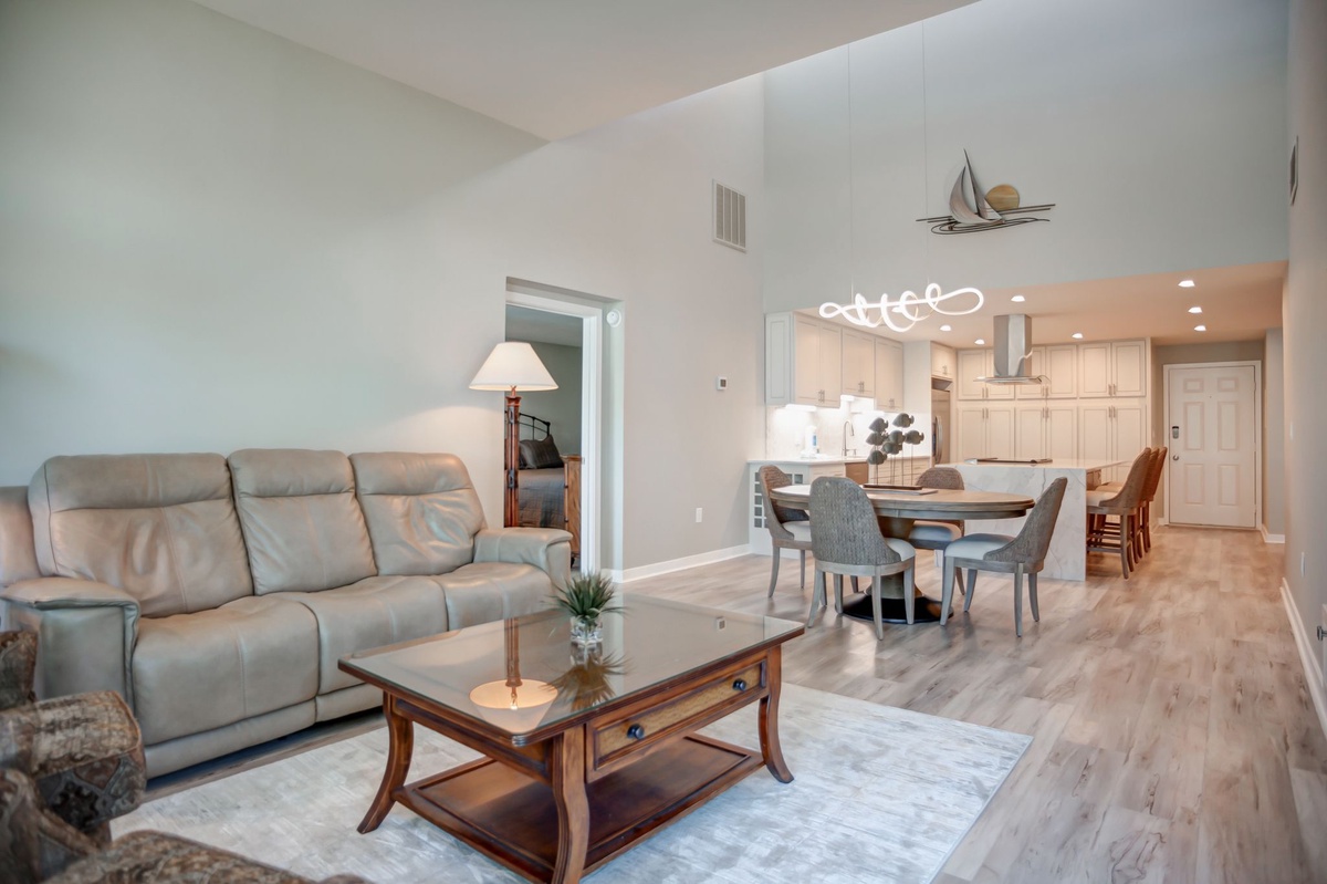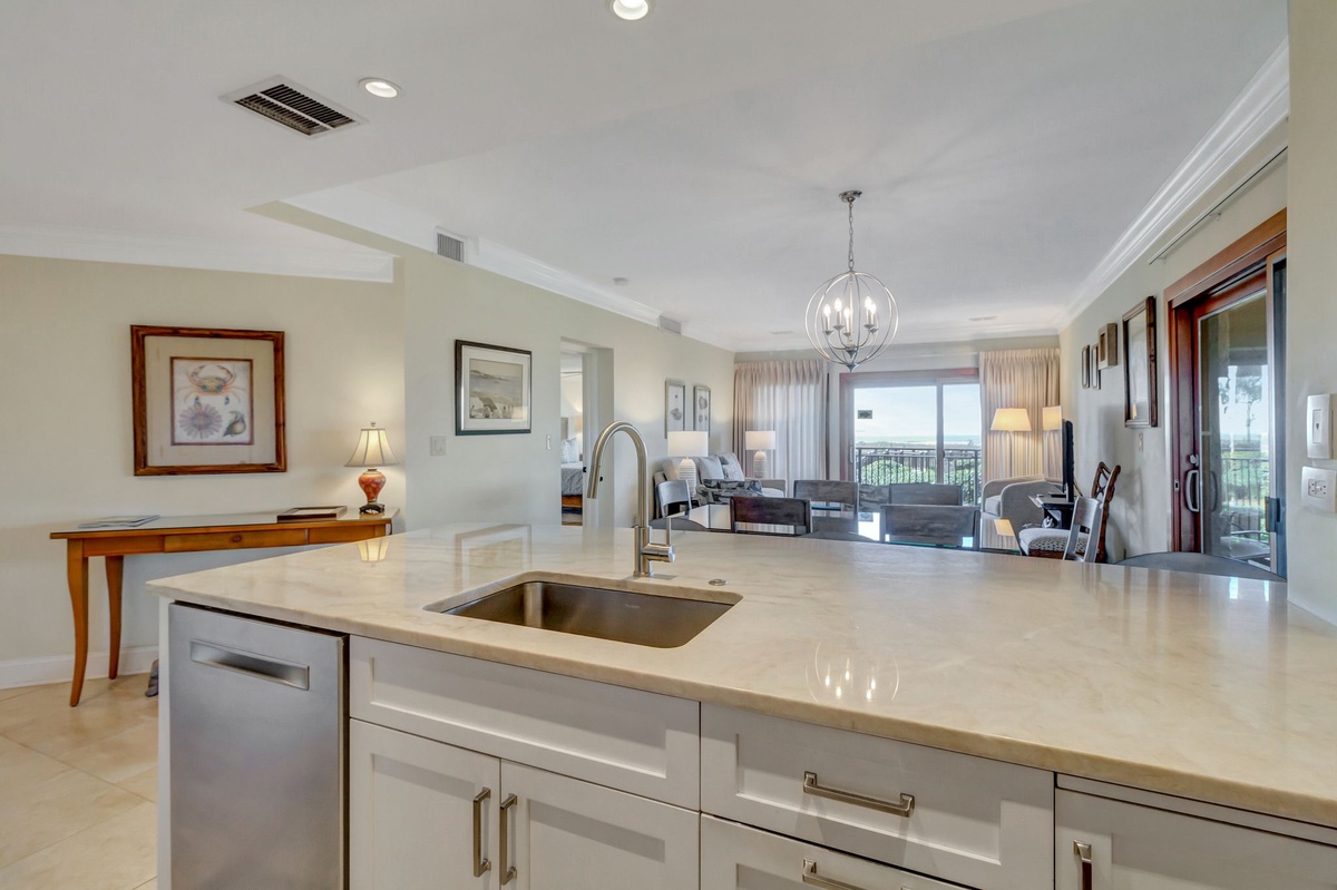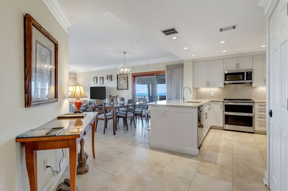 The living room houses a sleeper sofa, two swivel armchairs a flat screen TV. But the focal point of this room is of course the view, seen from two walls of windows and sliding glass doors that reveal a wraparound deck. The back door is literally on the pathway to both the on-site swimming pool and to the beach. Further, the deck features delightful awning-covered seating with a table for four, for beachside dining al fresco.