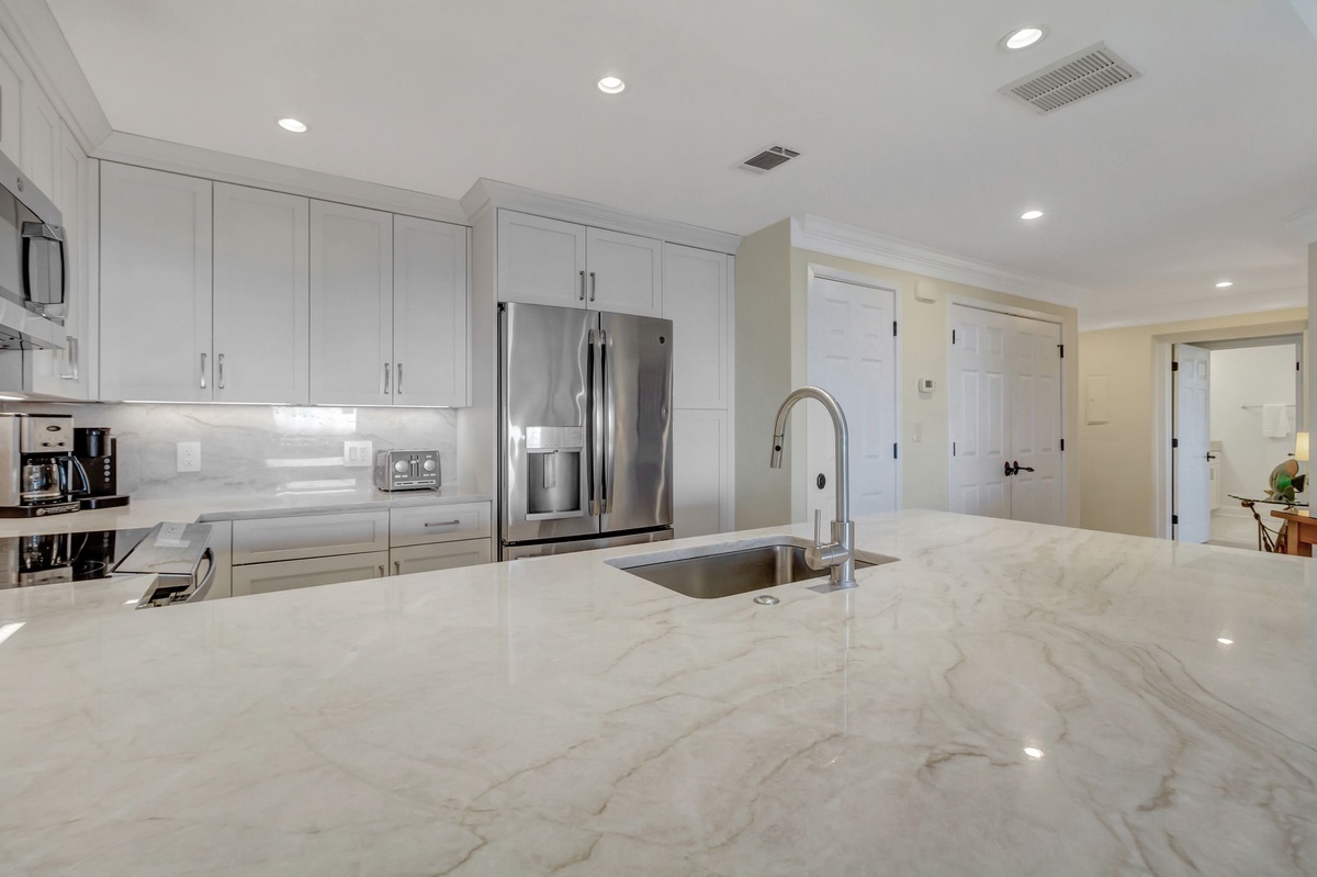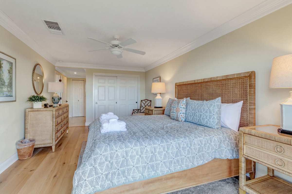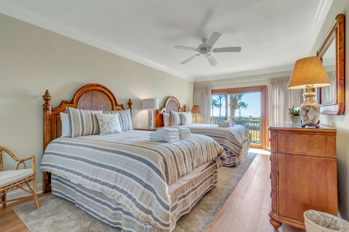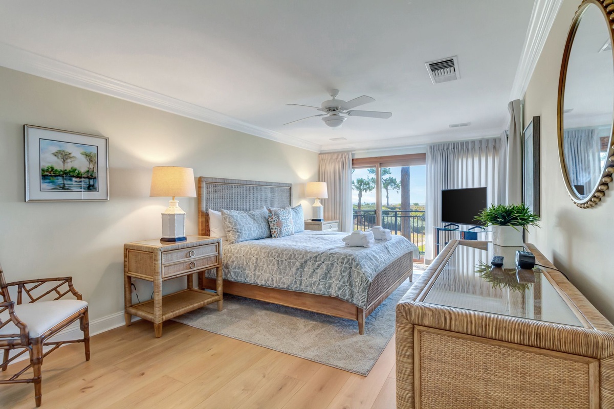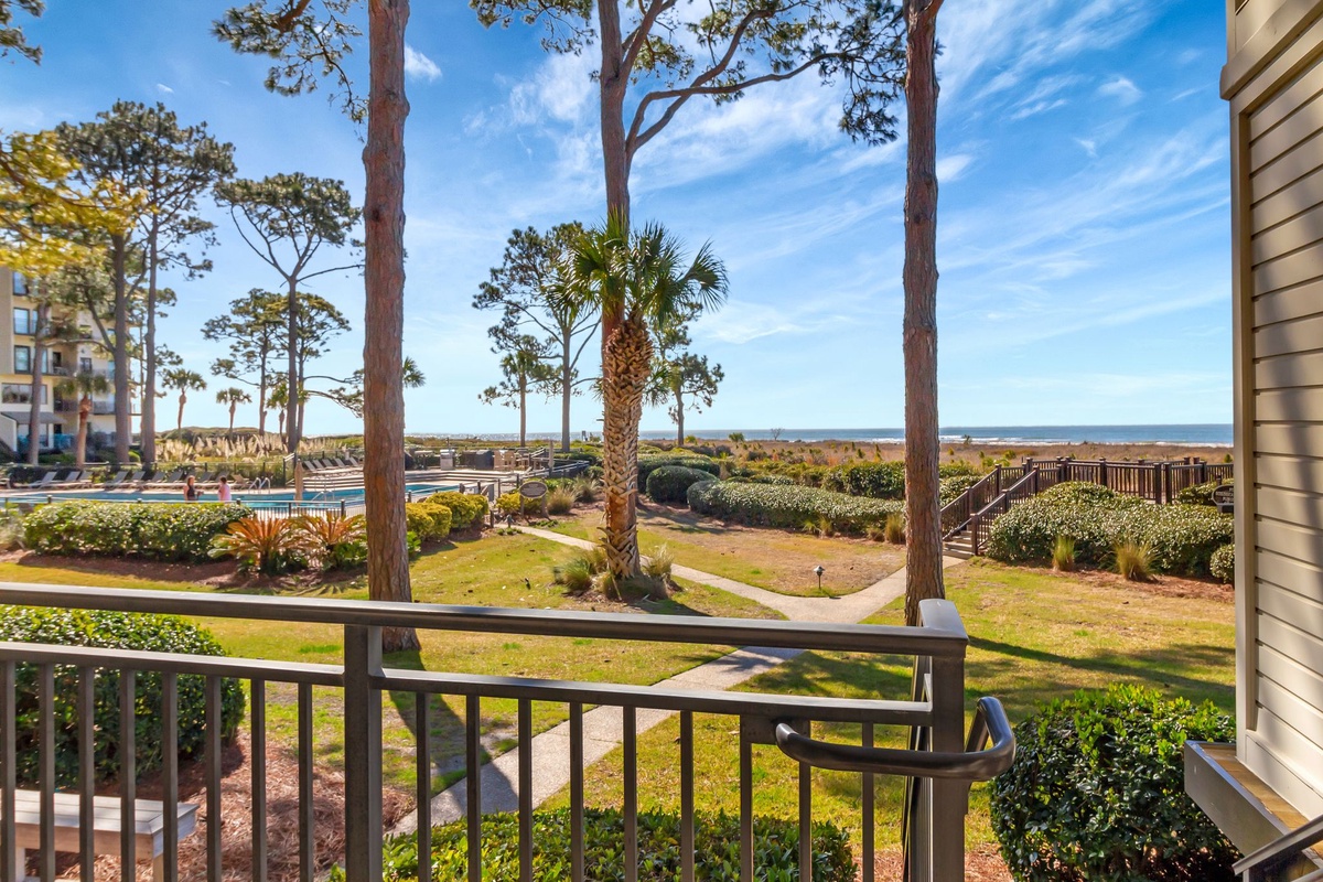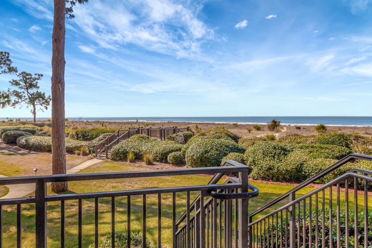 This first floor Beachside Tennis villa is an end unit, providing it with a panoramic view of the waters of Calibogue Sound and the curving shoreline of South Beach. It is paradise!