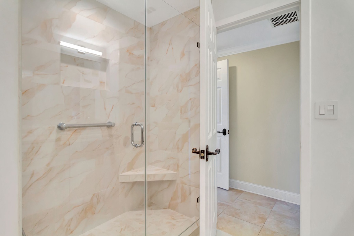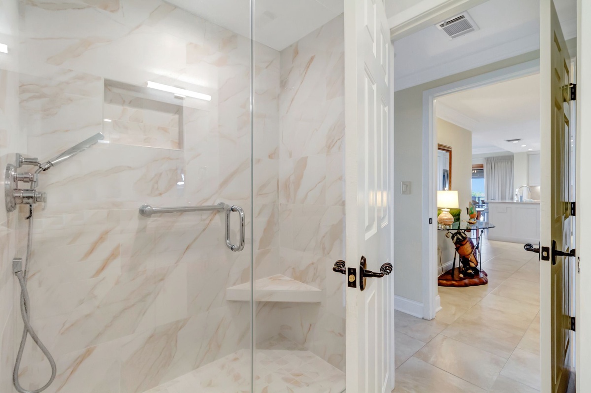 Both bedrooms enjoy the stunning South Beach vista, and have similar tranquil coastal tones, one with King bed, the other with two queen beds and deck access. The rooms also house identical bathrooms, offering tiled walk-in showers.