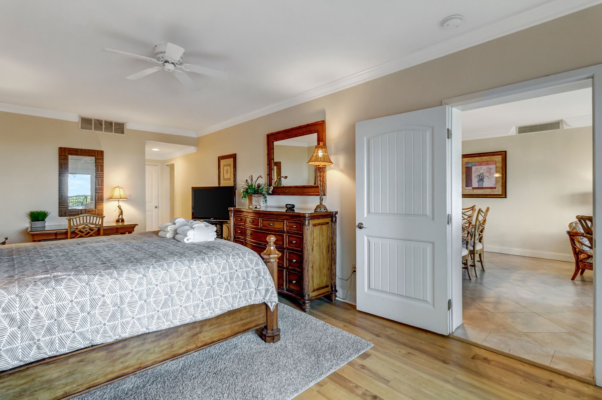 In muted corals and greens, the master bedroom has a king-sized bed, flat screen TV, DVD, walk-in closet and deck access through sliding glass doors, with its own outdoor bar-height table for four with swivel seating. The master bedroom also enjoys this spectacular view. In addition, its private bathroom has a granite double vanity, oil-rubbed bronze pulls on its cream cabinetry and walk-in glass door shower.