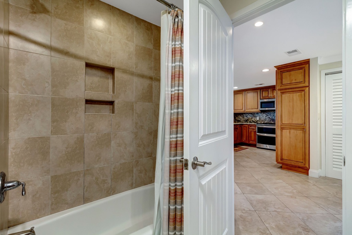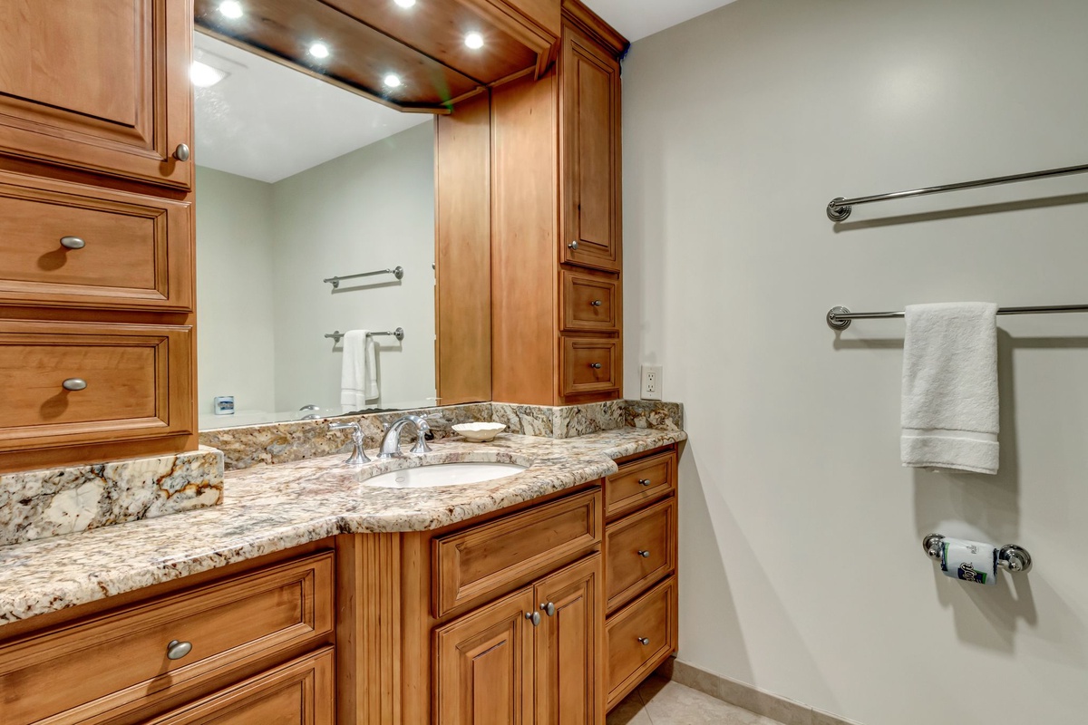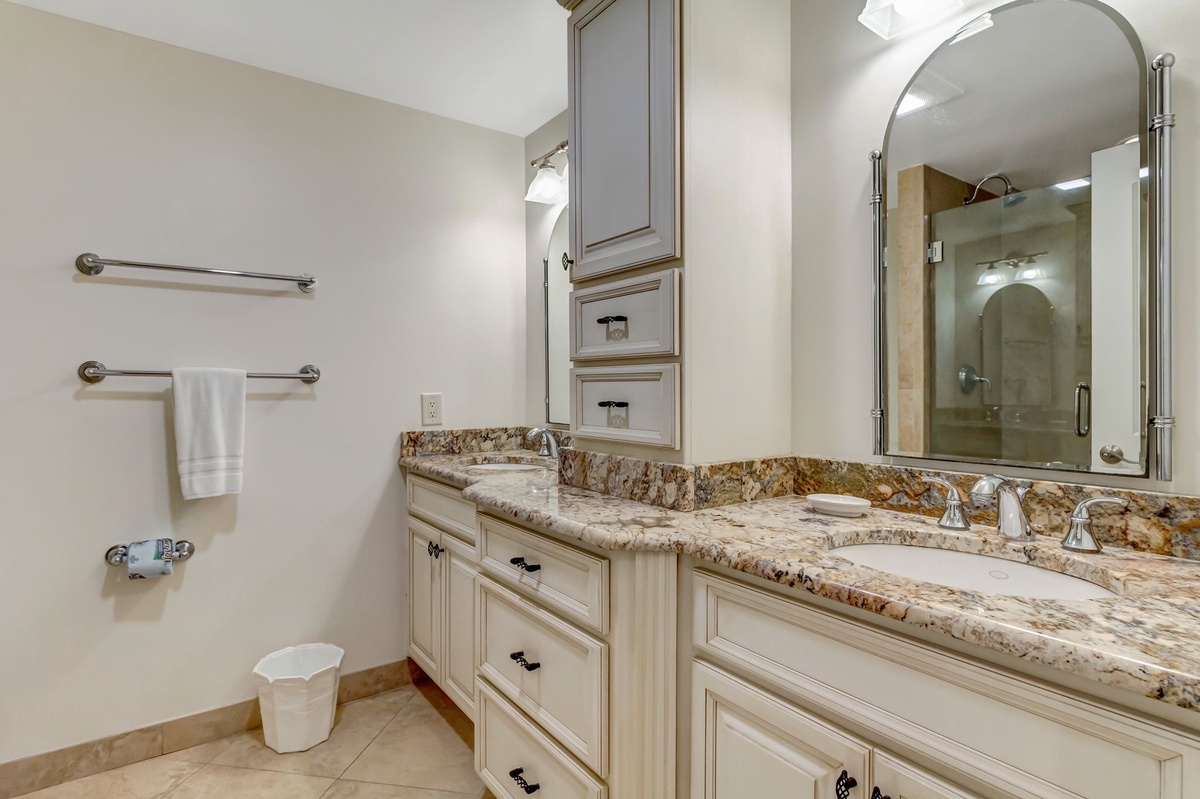 The second bedroom, with a palm frond motif and neutral hues, houses two queen-sized beds, TV and deck access through sliding glass doors. Its elegant private bathroom has a granite vanity, stone flooring and a tub/shower combo. Also nearby are a full-sized washer and dryer.
