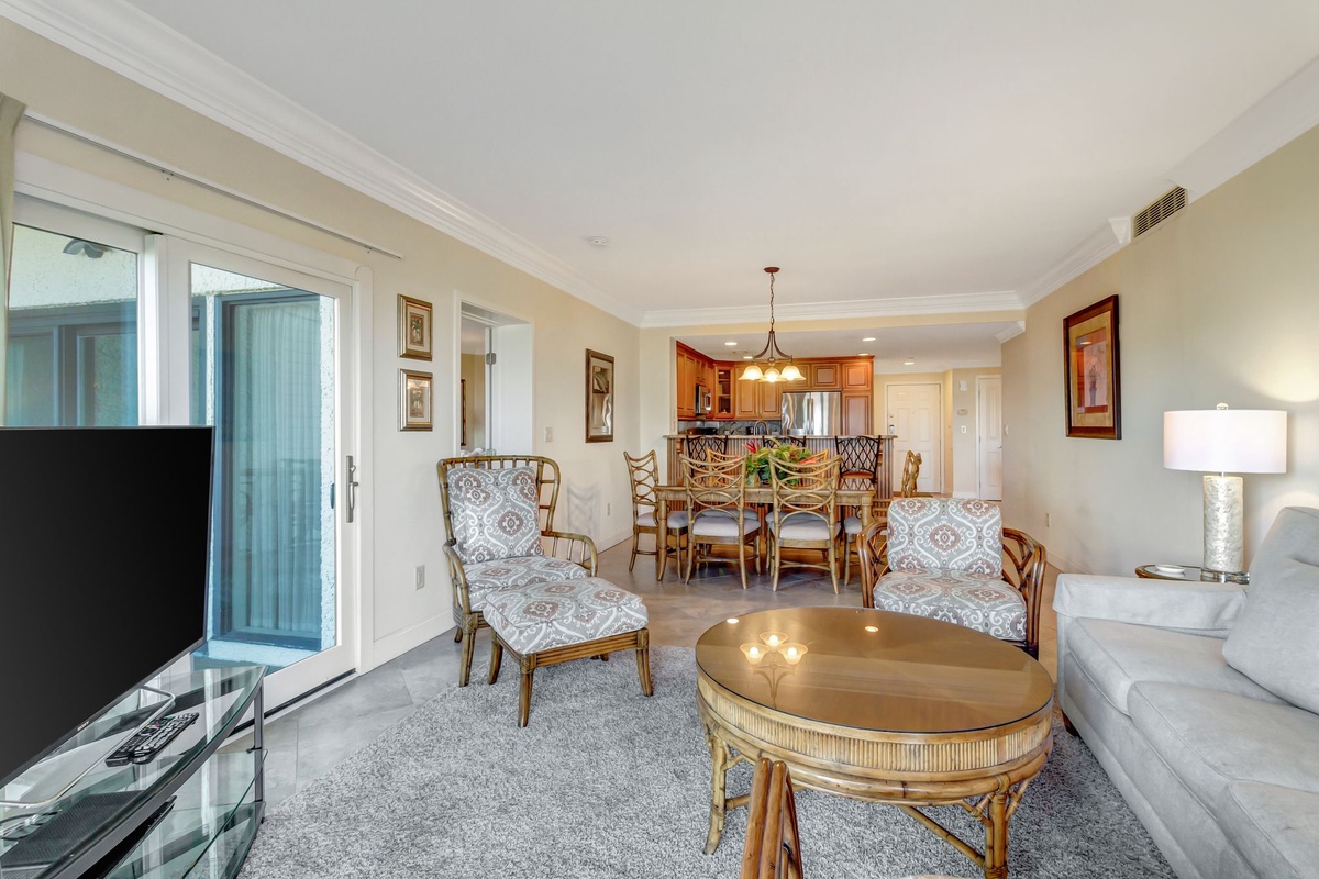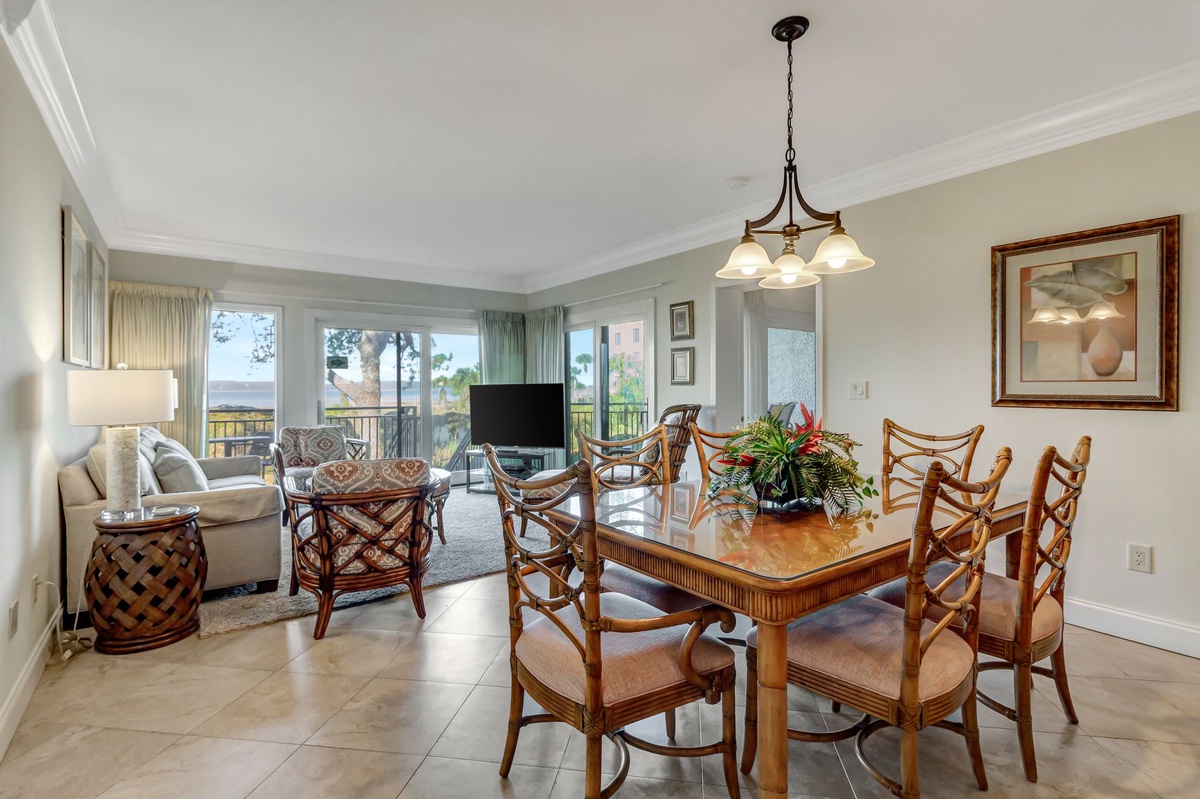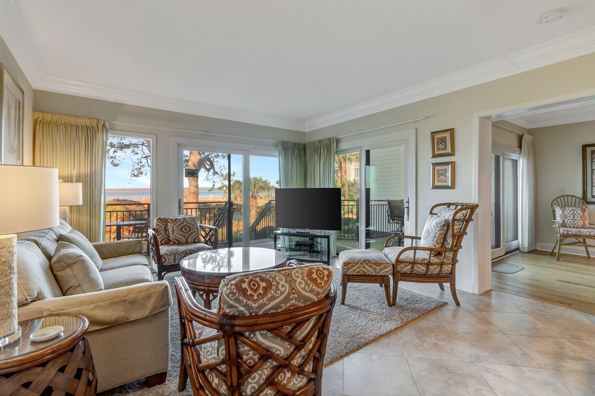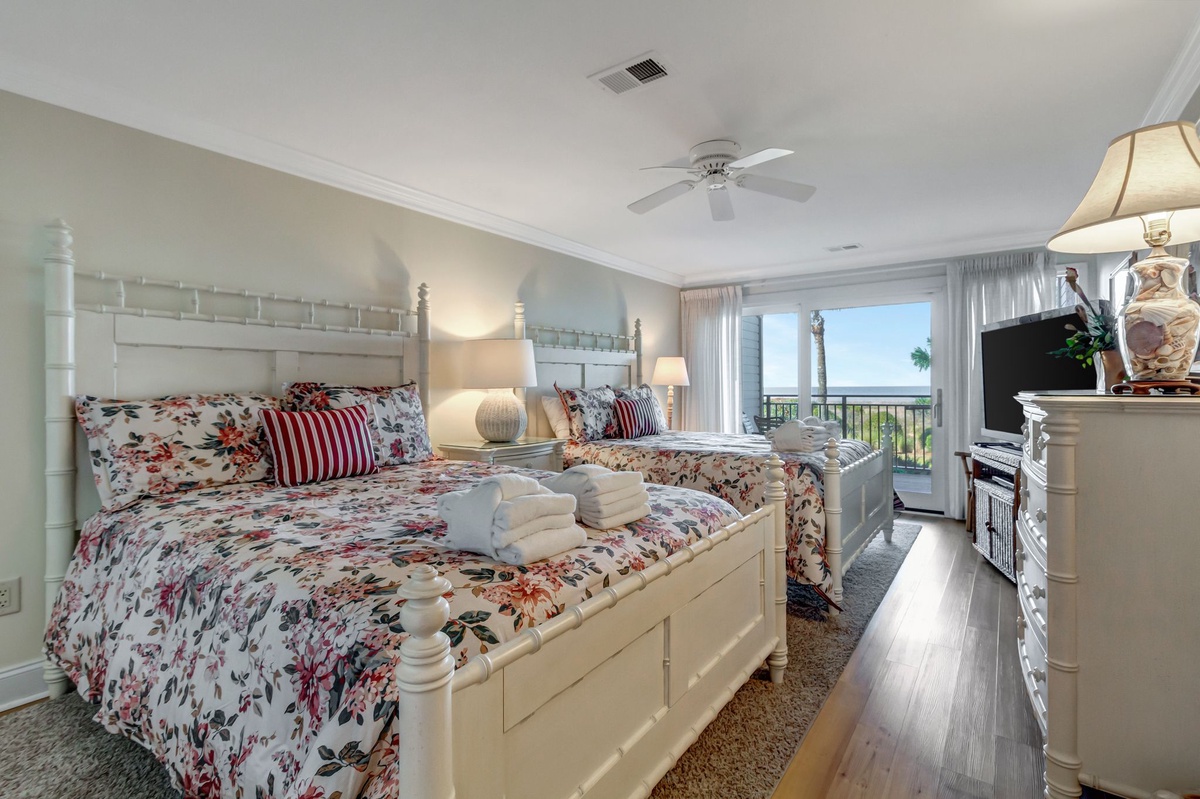 With a spectacular view of the beach and the Calibogue Sound, the living room provides a sleeper sofa, 55” flat screen TV, DVD and a wraparound deck, beach pathway and pool.