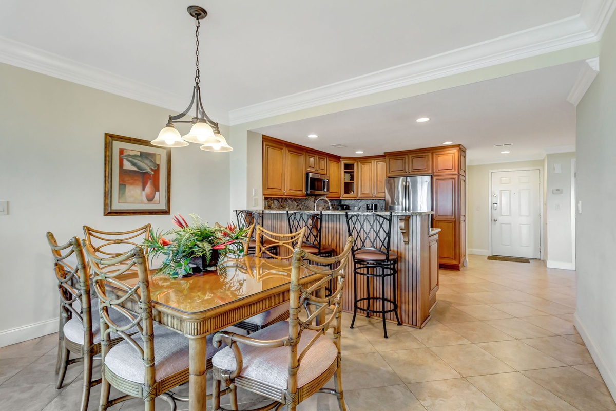 The epicurean-tier kitchen showcases tan granite countertops, stone flooring, stainless steel appliances, luxe wooden cabinetry with brushed nickel pulls, and a flat cooktop. Then, the dining area invites lingering over meals and conversation with comfortable seating for six at its glass table.