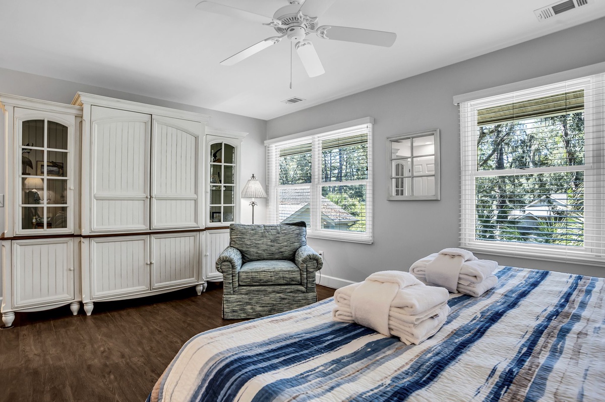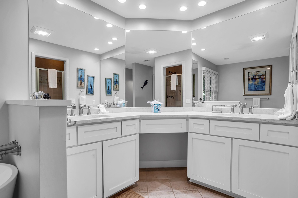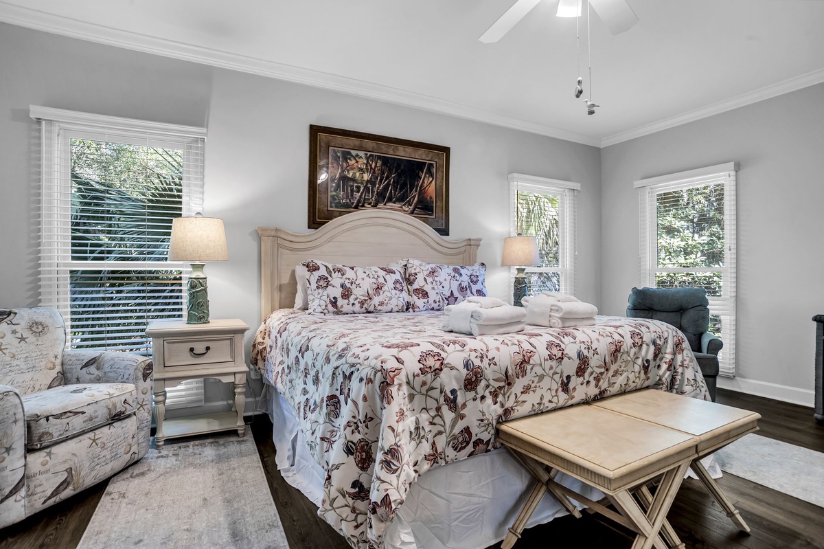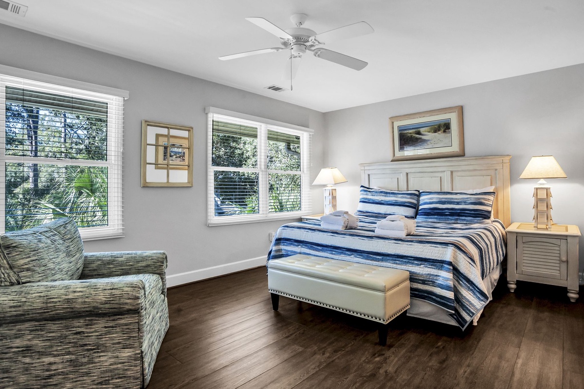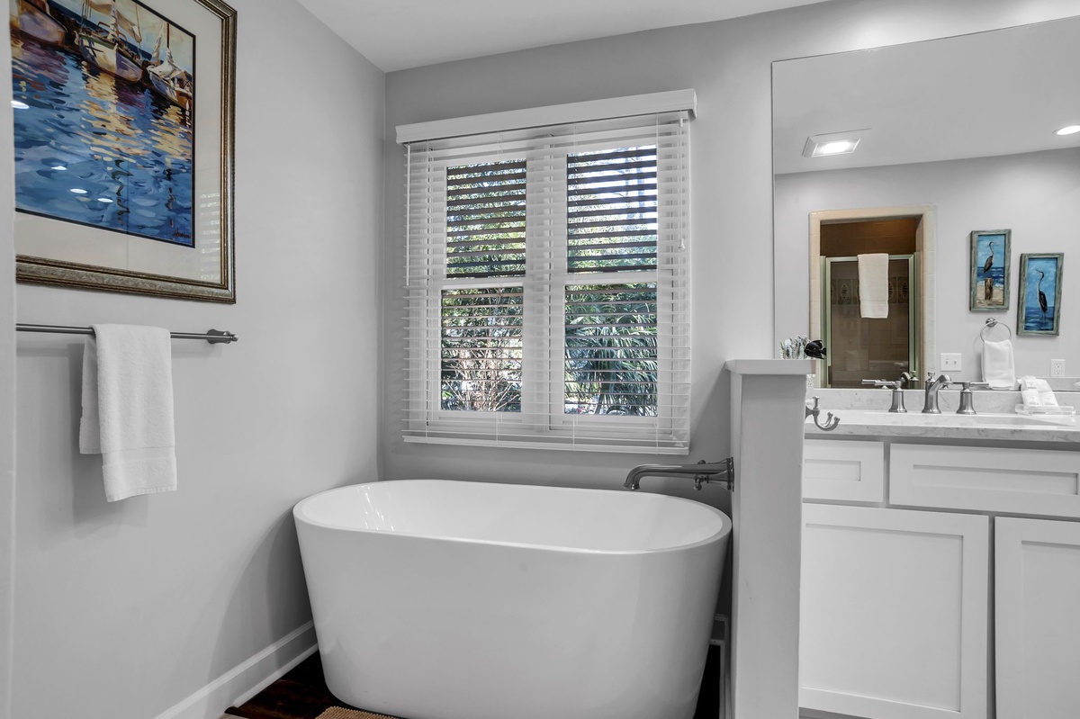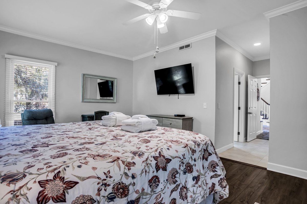 The master can be found on the ground floor, a sprawling suite with a king size bed, ceiling fan, flat-screen TV and spa-like en suite bath with soaking tub, his and hers vanities and spacious walk-in shower boasting dual showerheads.