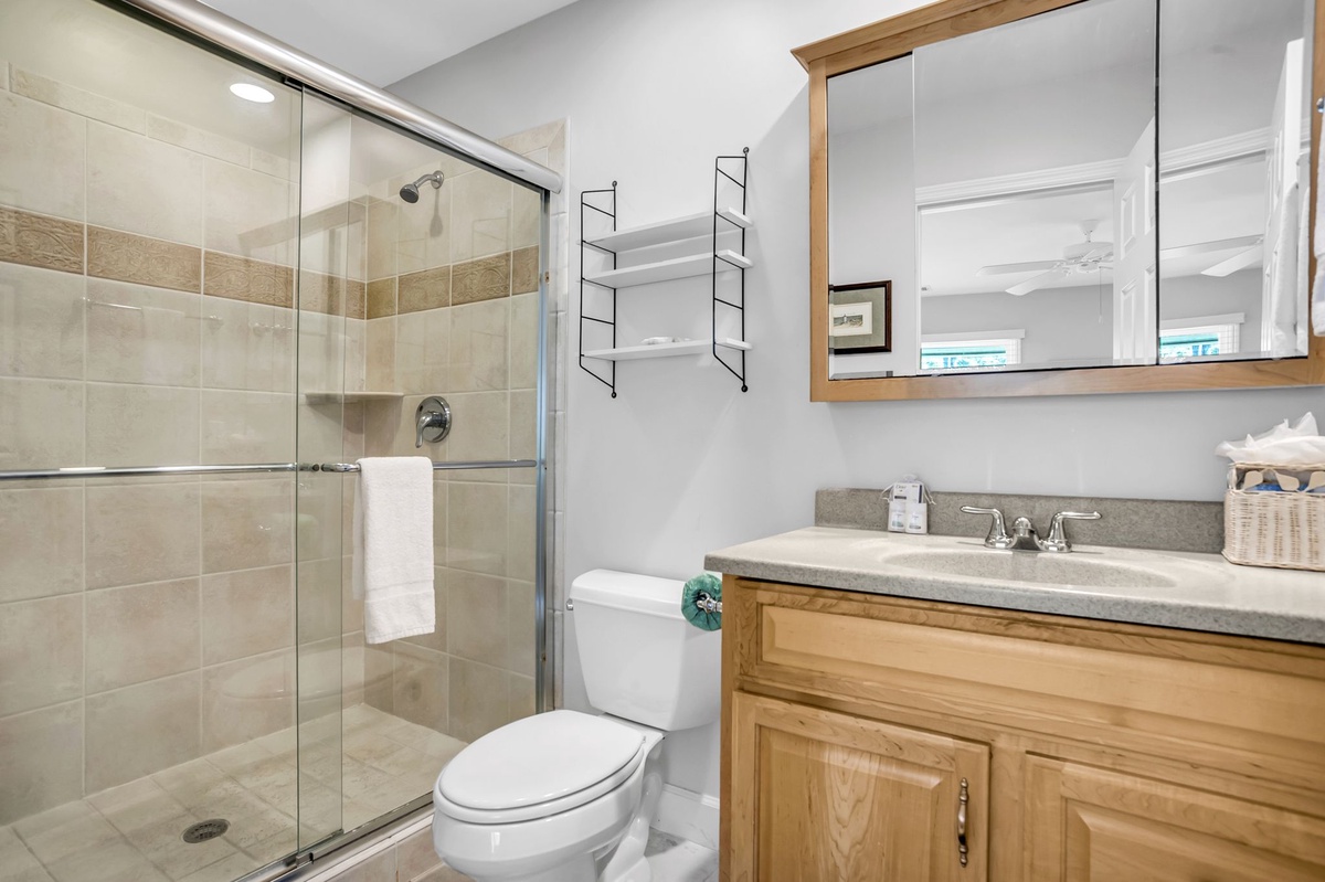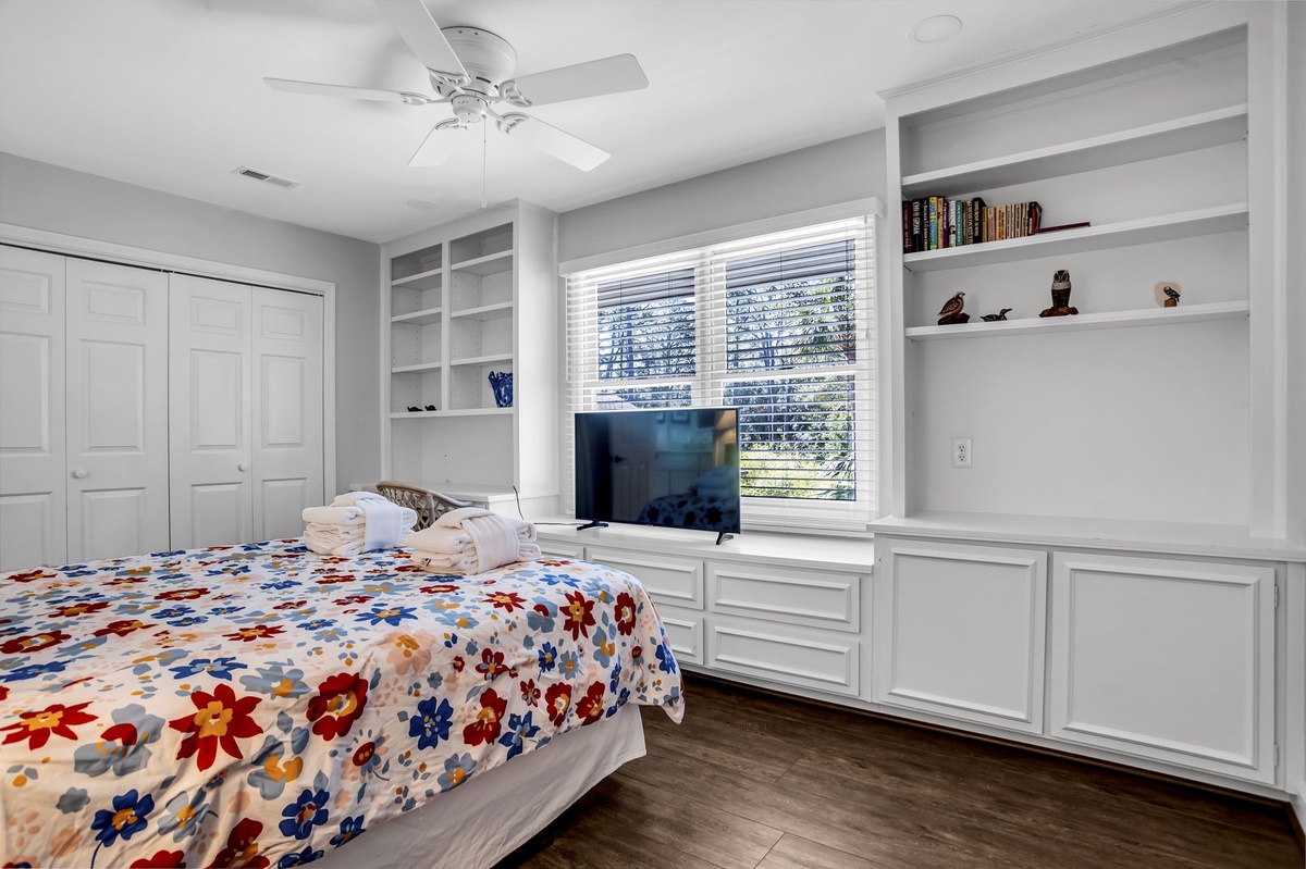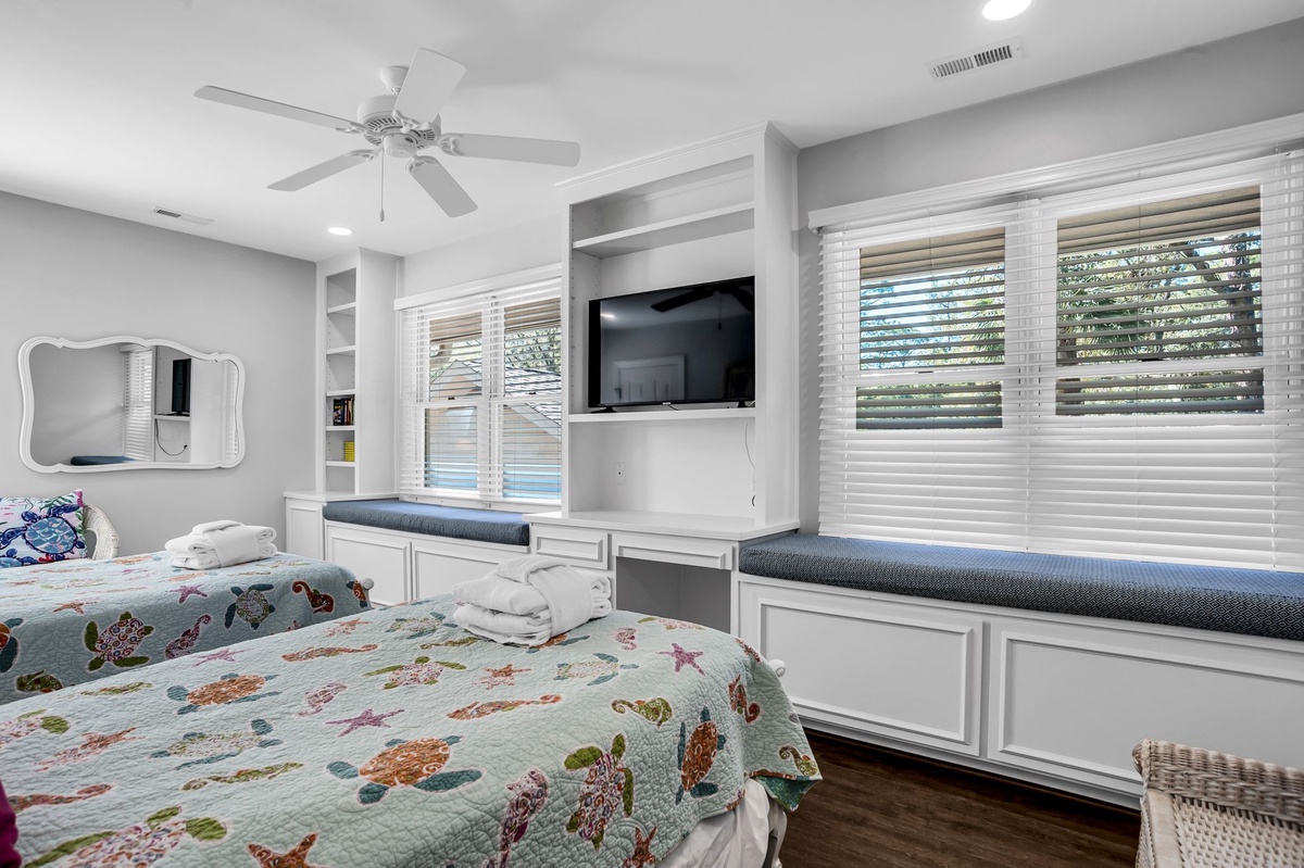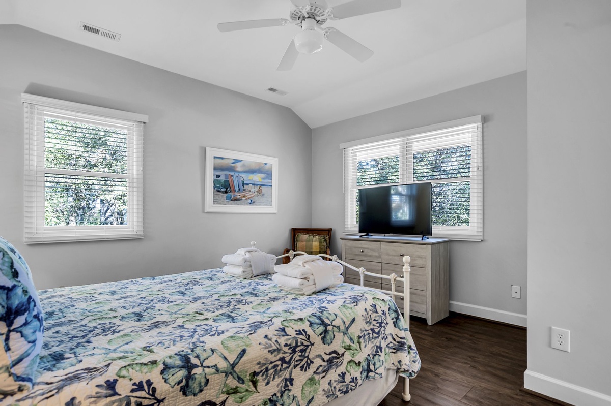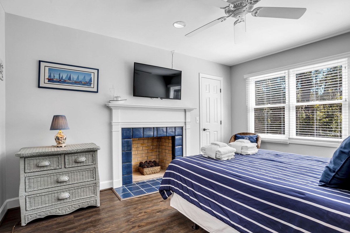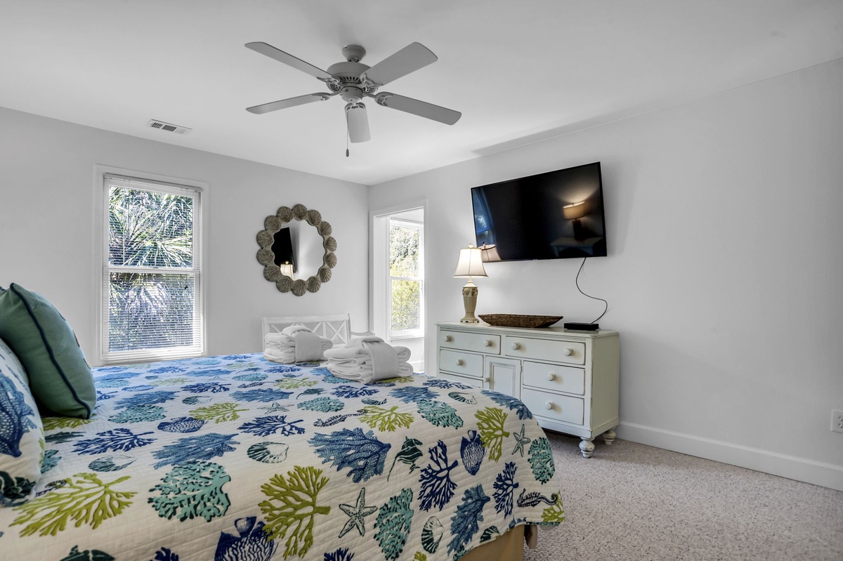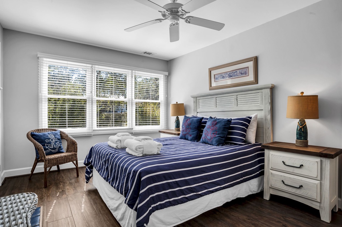 The master can be found on the ground floor, a sprawling suite with a king size bed, ceiling fan, flat-screen TV and spa-like en suite bath with soaking tub, his and hers vanities and spacious walk-in shower boasting dual showerheads.