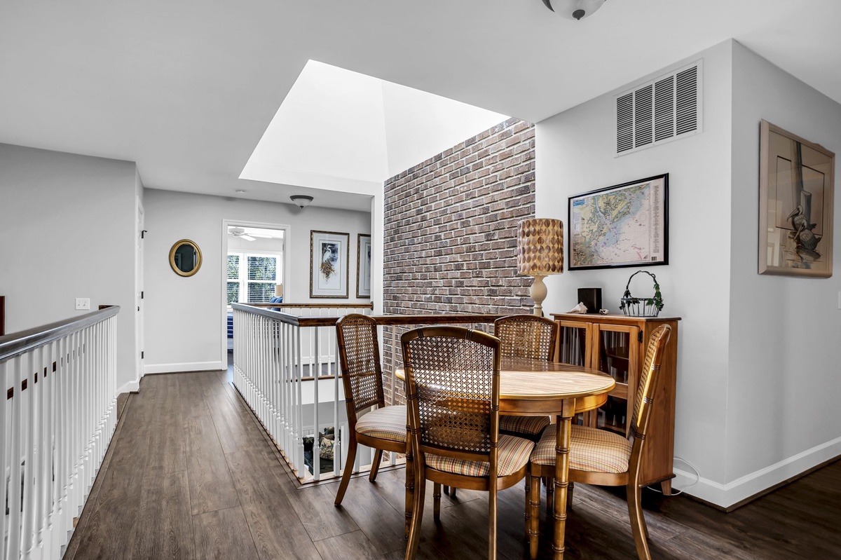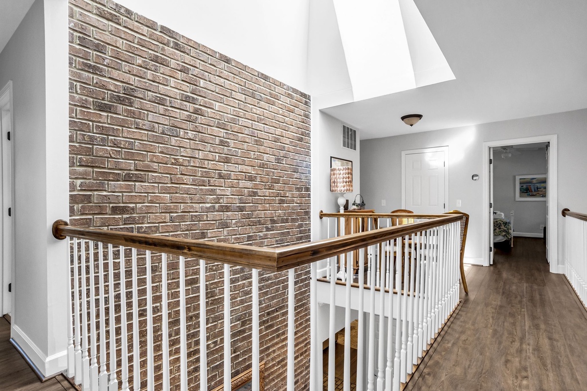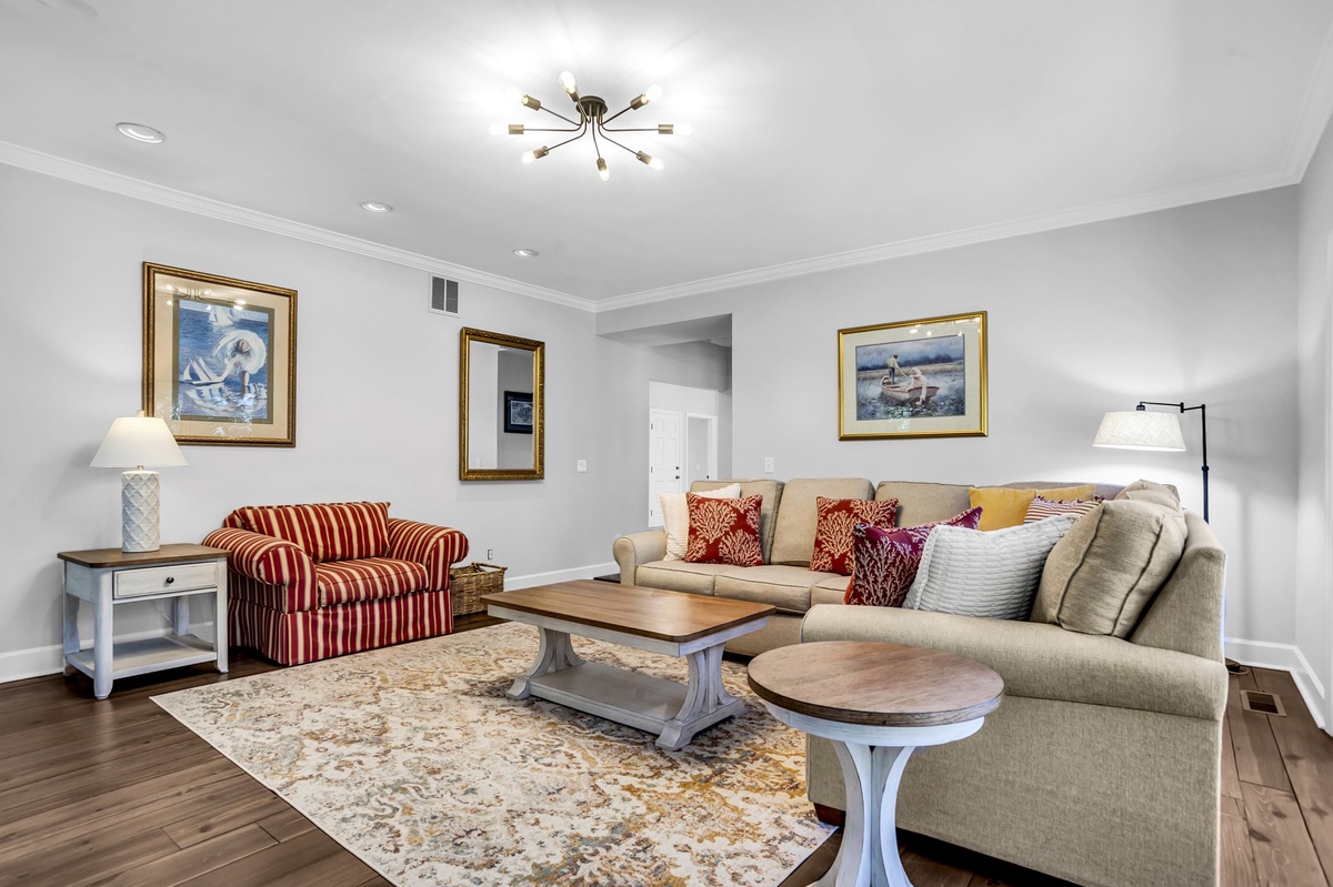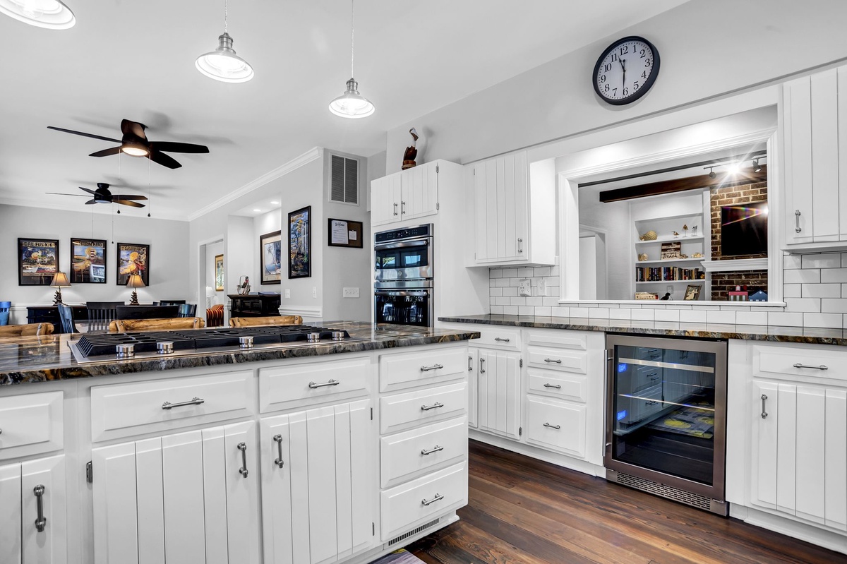 Stepping inside the front door, you are greeted by intricate windows, dazzling millwork and a soaring accent wall of red brick, signs of the craftsmanship within. Surrounding the space you’ll find quiet places for smaller get togethers, like the den with its broad sectional sofa, decorative fireplace and flat-screen TV; or the expansive Carolina room that stretches along one side of the house. You’ll also find grander rooms for family get togethers, like the living room with its spacious sectional sofa, decorate fireplace and 50-inch flat-screen TV; or the dining hall with its granite-topped farmhouse table with seating for 10. Meals taken here are prepared in the exquisitely spacious kitchen, with its custom cabinets, flat cooktop stove and bevy of updated appliances.