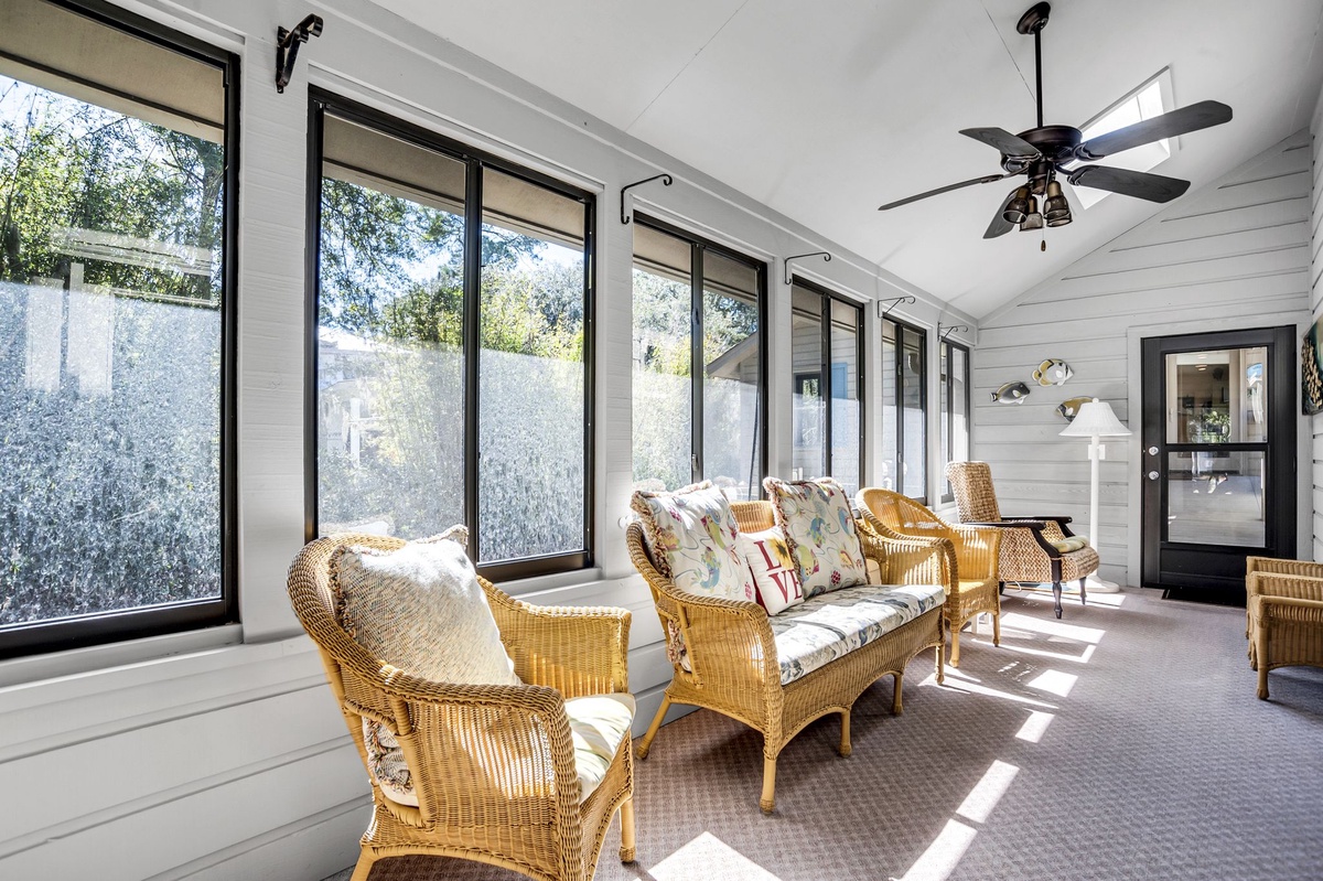 Those seeking even more privacy and comfort will find it in the spacious elevated guest house to one end of the property. Enjoying soaring cathedral ceilings, the main living space of this guest house enjoys a sense of open airiness as well as a living room with sectional sofa and flat-screen TV, full bath with walk-in shower and a fully appointed kitchen with nearby dining for six as well as outdoor dining on the private patio. The guest suite boasts a king-size bed as well as en suite bath with walk-in shower.