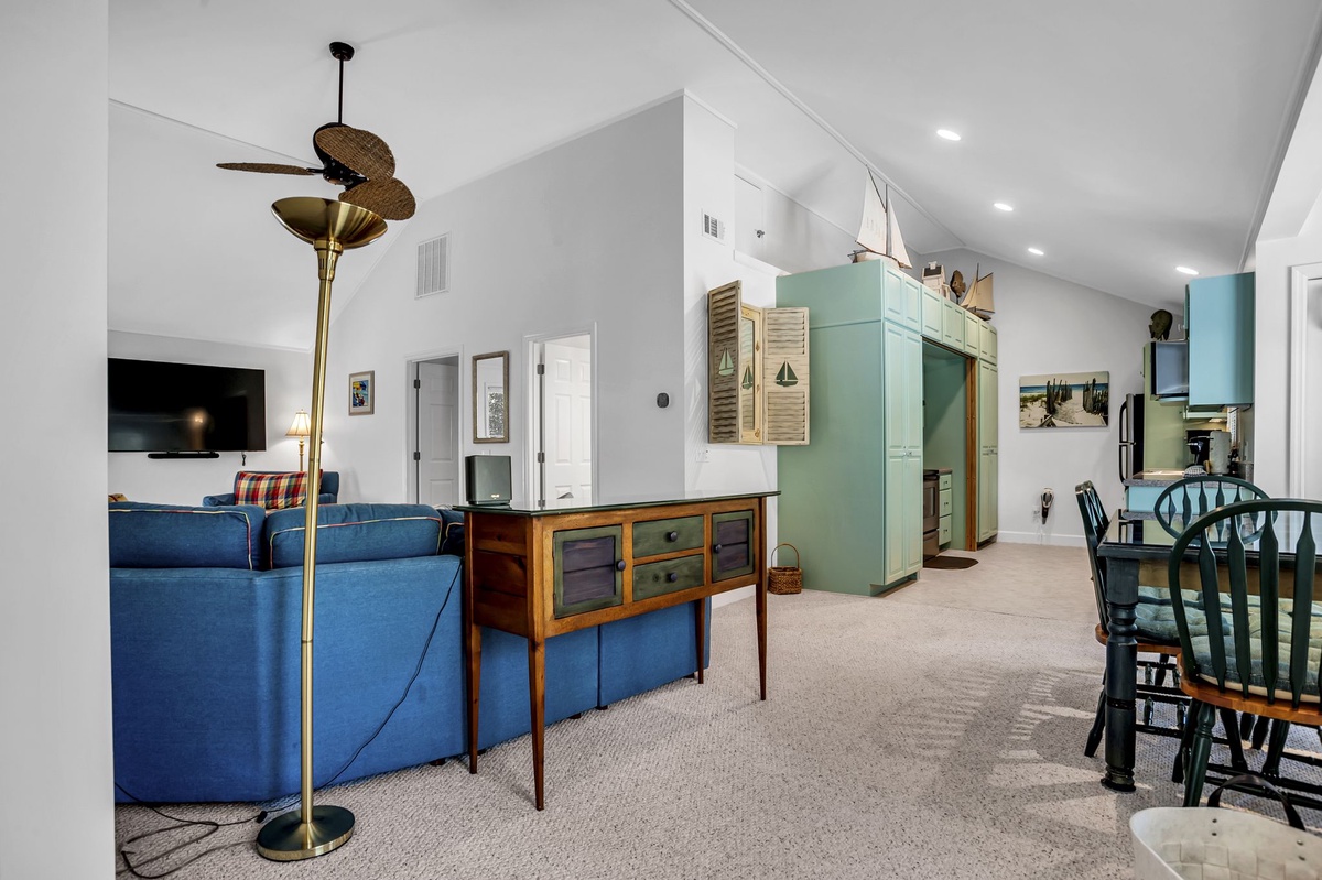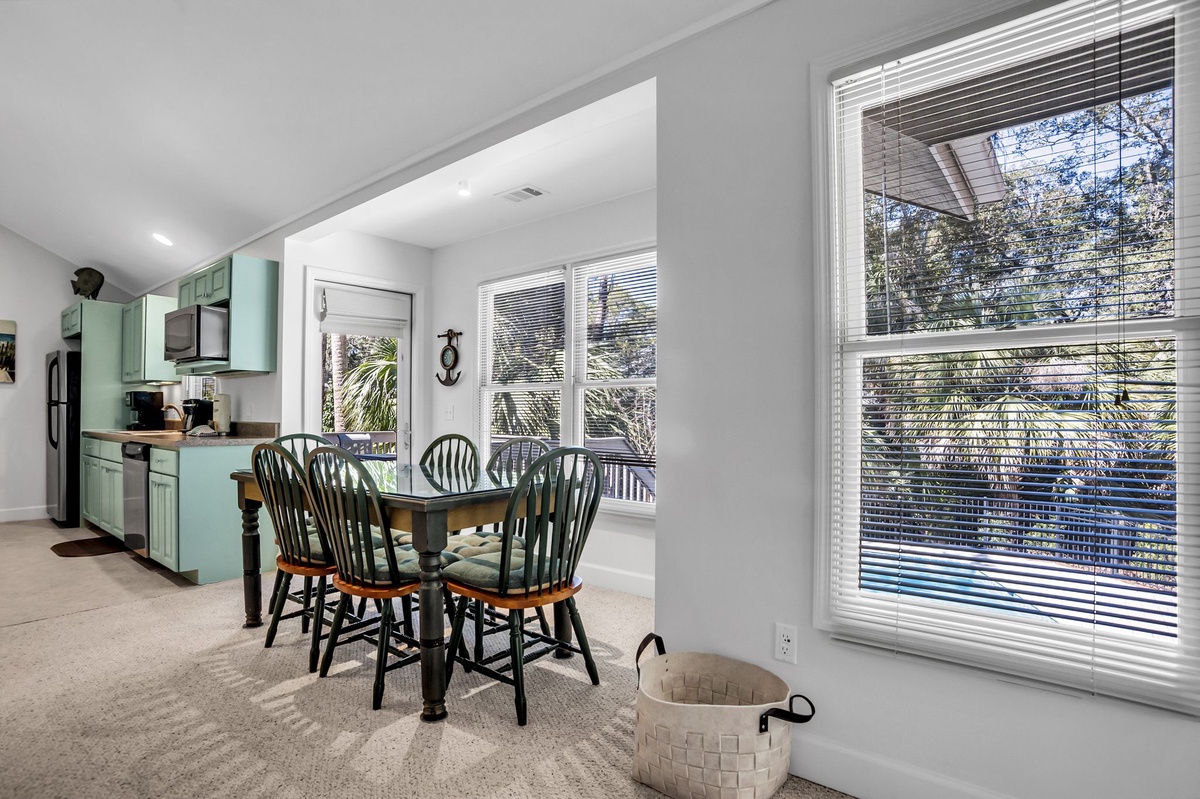 Want to take your dinner outside? The expansive deck provides two separate tables with seating for six beneath patio umbrellas where you can enjoy a meal to the music of the crashing waves.