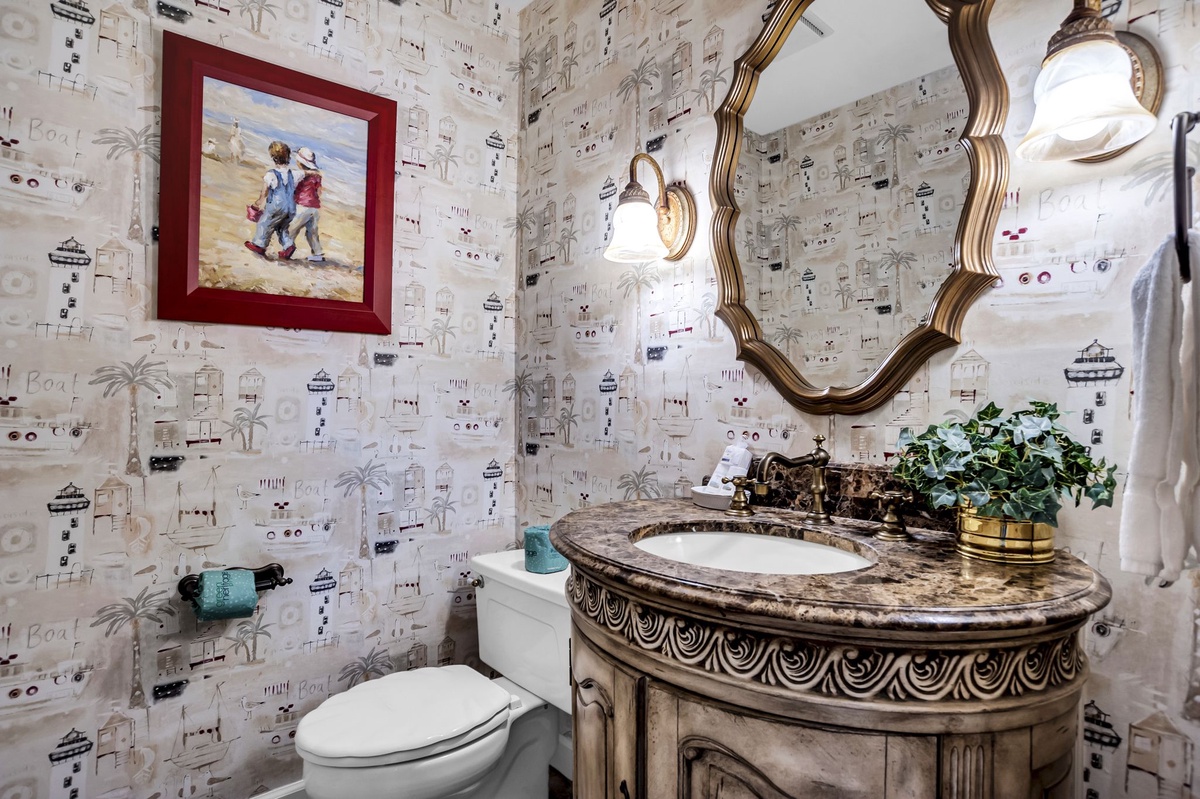 Accommodations are suitably impressive for a home so grand in vision, and spread out around the property for sublime privacy. Five of these guest rooms can be found on the main house’s second story, ringing a catwalk bathed in natural light from a massive skylight and overlooking the grand foyer. Among them are a multitude of sleeping arrangements, from king-size to queen-size and even a pair of bedrooms perfect for younger guests. Each enjoys amenities including ceiling fan, flat-screen TV and private bath – with one lucky guest enjoying their own private decorative fireplace!