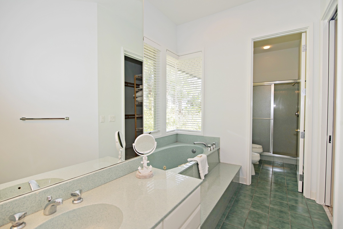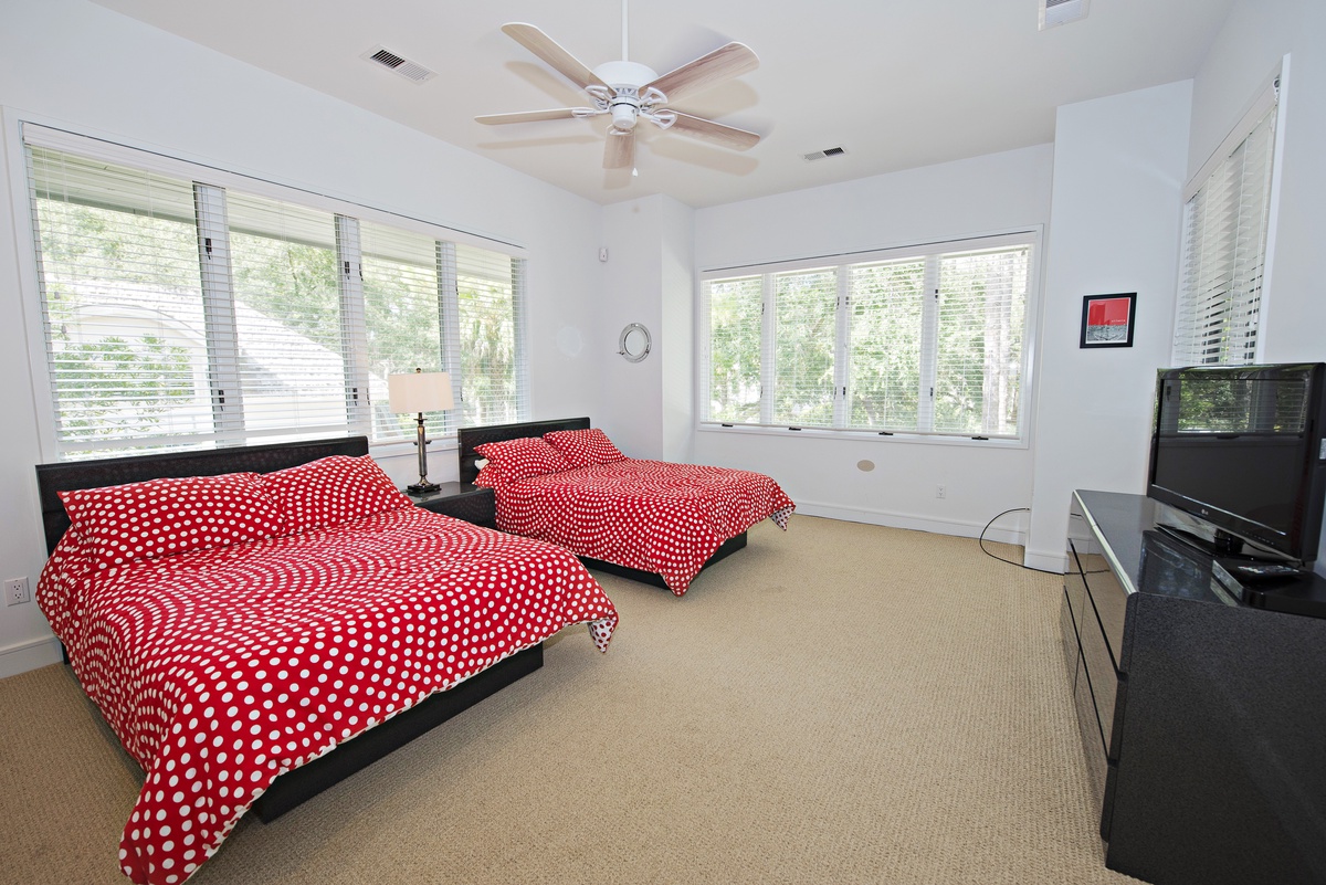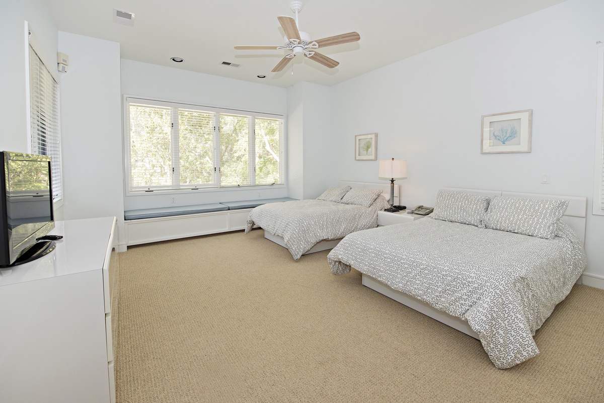 The second surrounds two double beds with coastal flair in a roomy suite boasting a private bath with wide single-basin vanity, garden tub and walk-in shower.
