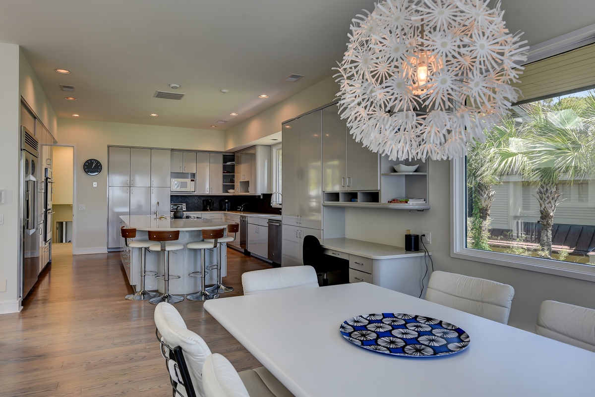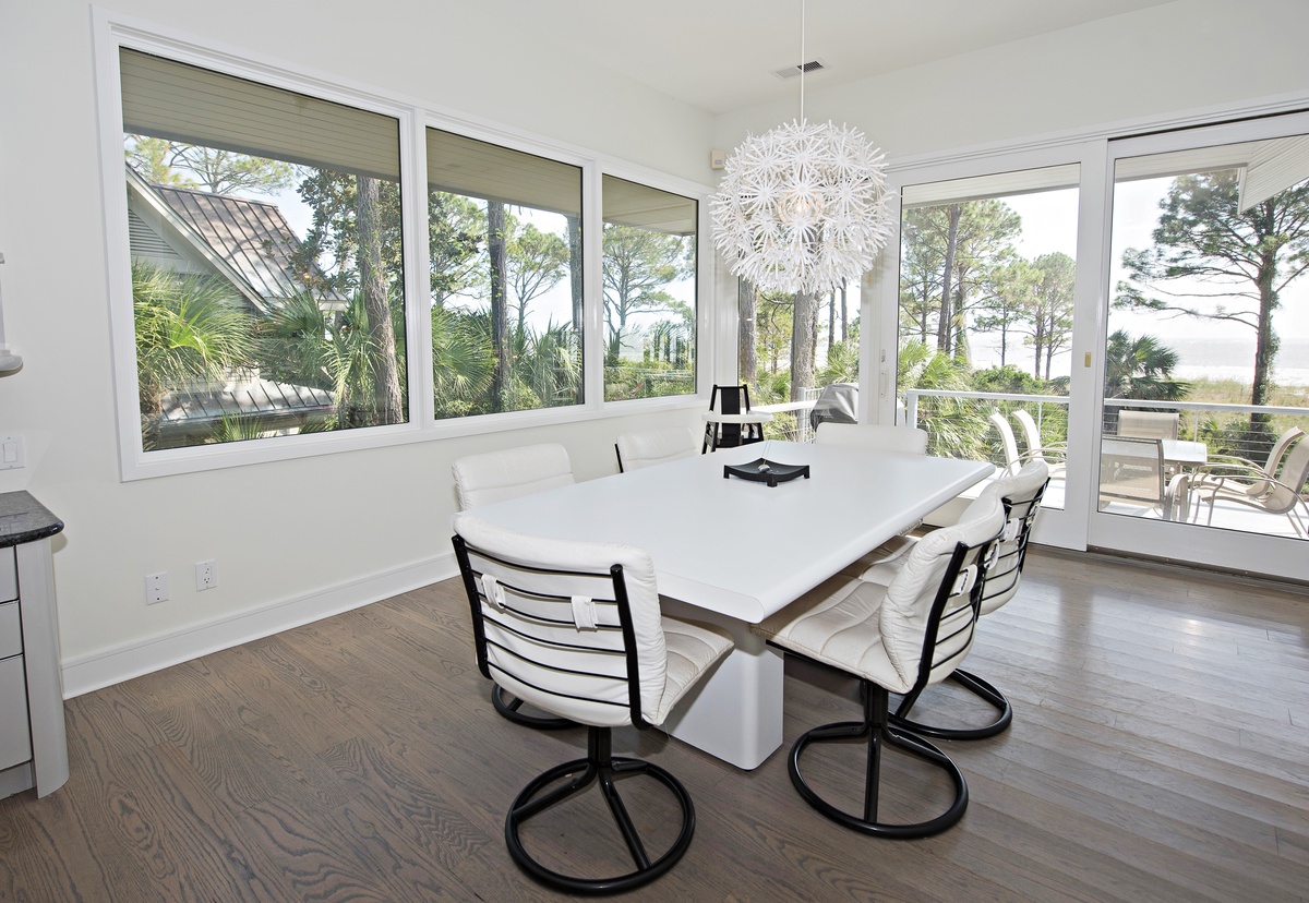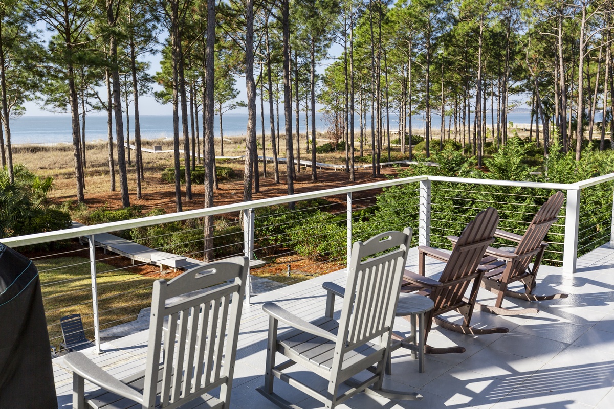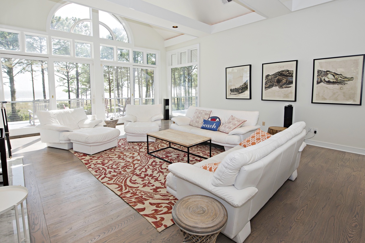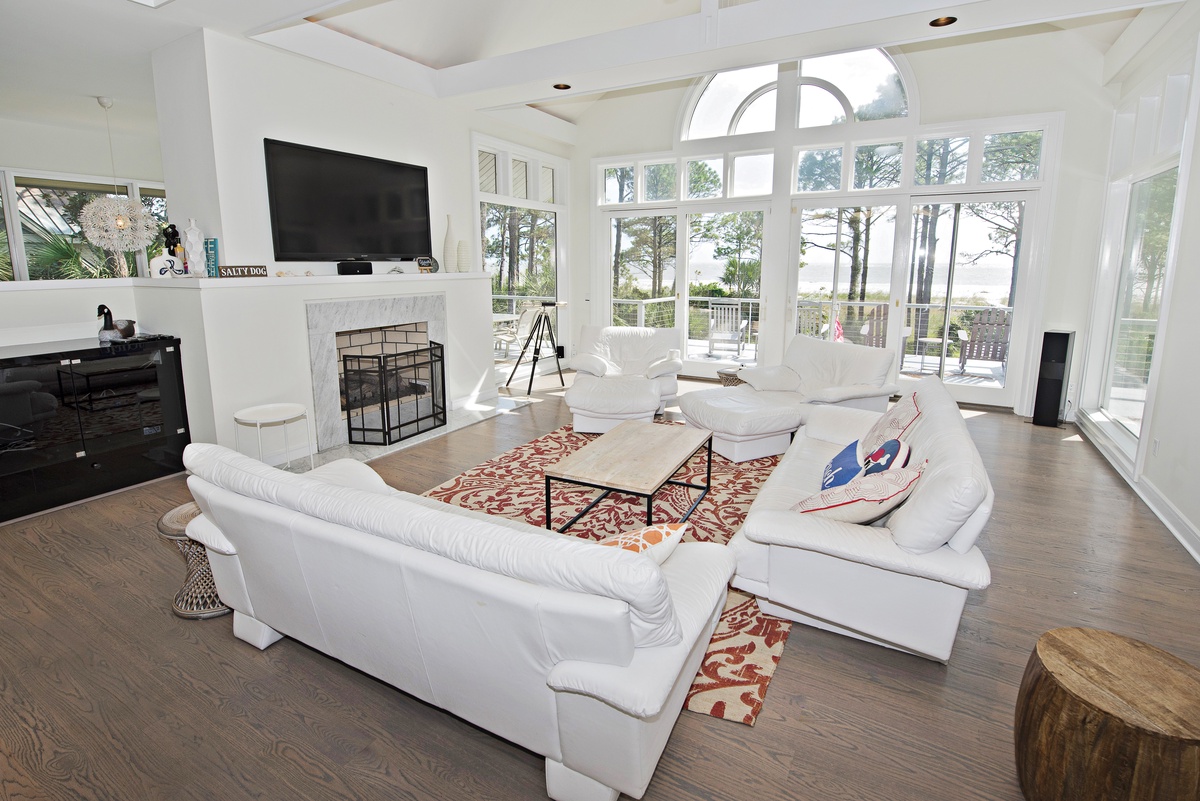 There’s even more space for entertaining upstairs, accessible via the spiral staircase. To one end of a massive open space crowned by vaulted ceilings, an elevated dining area offers elegant seating for 10 beneath arched windows. To the other, sliding glass doors open to a stunning second-floor deck with jaw-dropping views of the Calibogue Sound. An adjacent living space offers plentiful seating before a flat-screen TV and decorative fireplace.