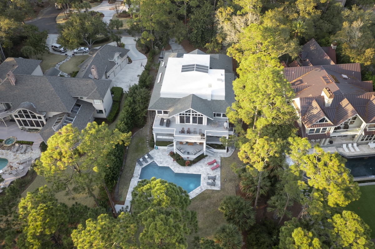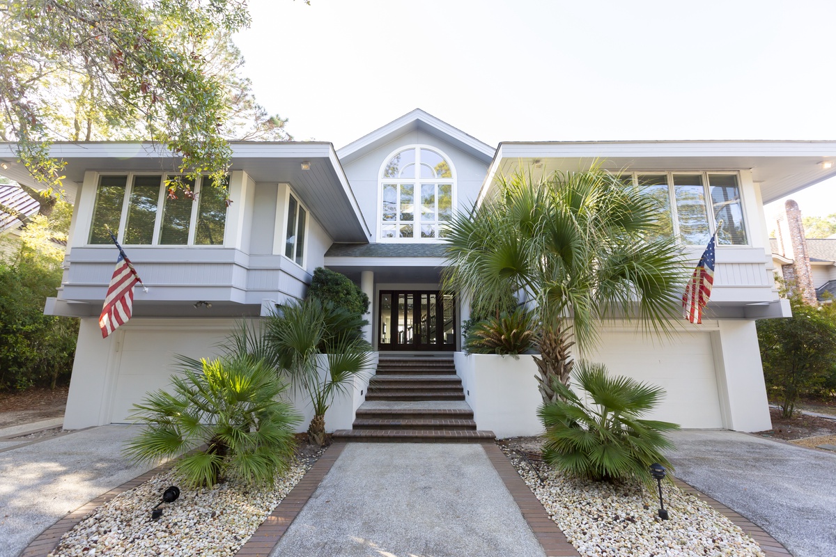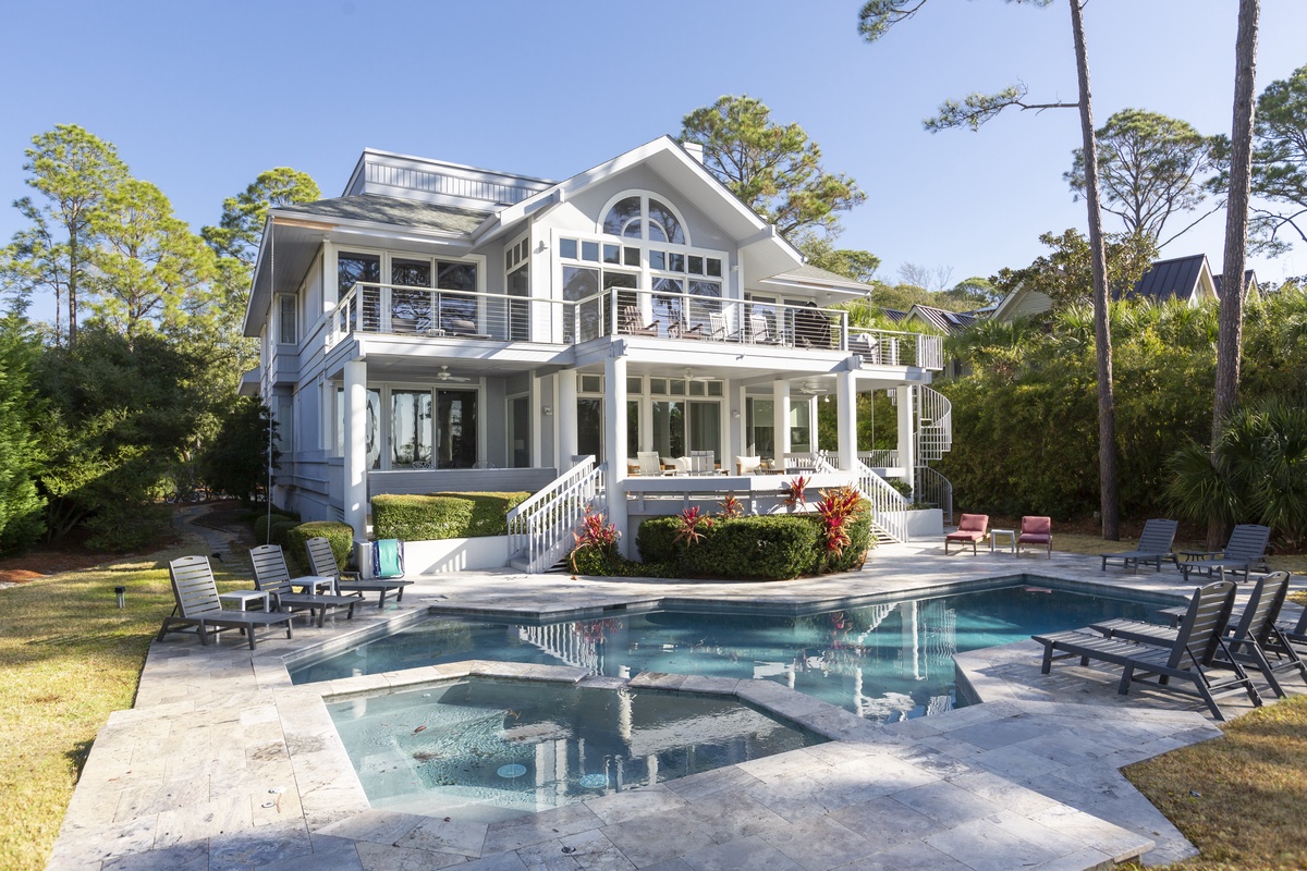 The grandeur of this private resort reveals itself the moment you step in and spy the glittering waters of Calibogue Sound just beyond a dramatic spiral staircase. Bathed in natural light from a glass ceiling above, the stairs anchor an open and airy space reminiscent of a five-star hotel lobby.