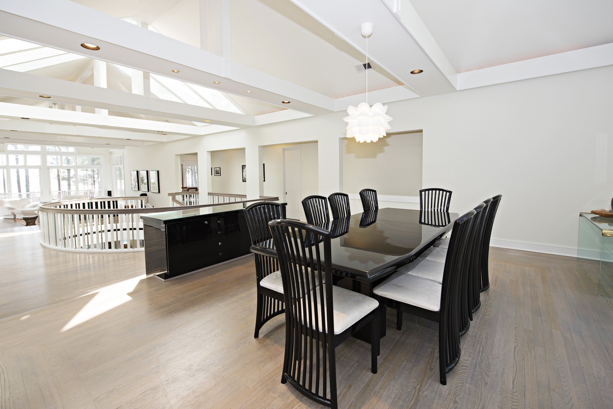A true gourmet kitchen occupies one side of this space, anchored by a massive granite counter sporting a chef’s dream selection of various burner options as well as an indoor grill and a prep sink. Dual ovens, a roomy refrigerator round out this exquisite kitchen, built for entertaining. Bar seating for four at the center island and a further six at a nearby dining area mean there’s not a bad seat in the house for a cooking demonstration.