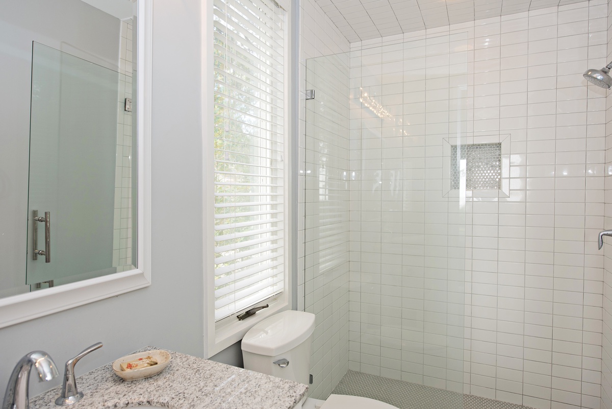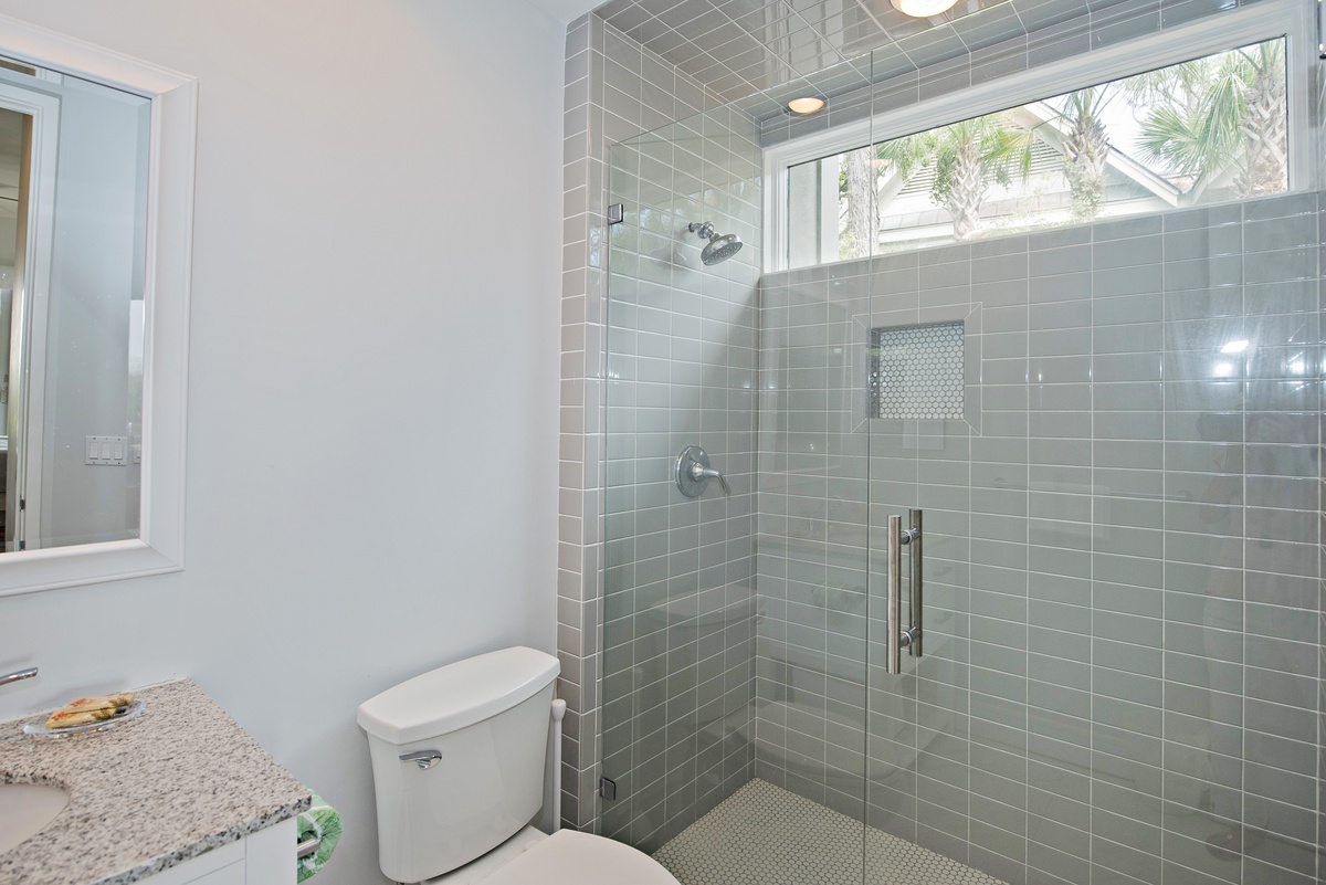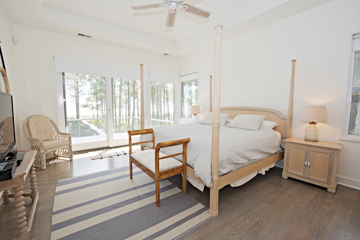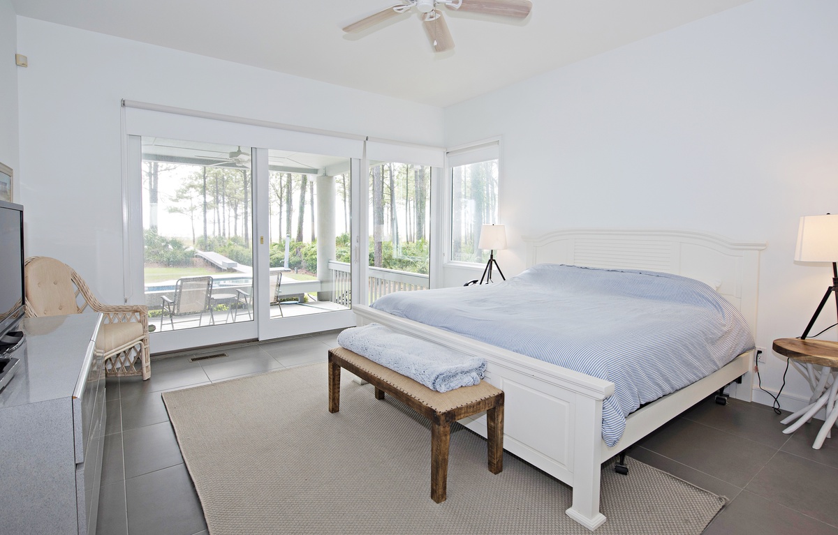 This property’s five-star luxury continues in each of its six bedrooms. On the first floor, you’ll find three suites, each with tall ceilings and personal flat-screen TVs. The first, a queen, enjoys its own access to the rear porch through a set of sliders, as well as a contemporary coastal chic design motif and an en suite with walk-in shower. The second, a king, can also access the rear porch through sliding glass doors. Rich with maritime flair, this space enjoys an en suite with massive walk-in shower.