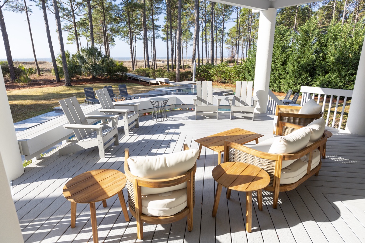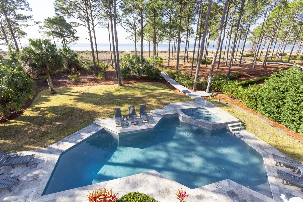 A grand Southern-style porch, out back, steps down to a full resort-sized swimming pool, topped with a spill down spa and framed by a wide pool deck and lush landscaping. Just past an outdoor shower, a boardwalk makes its way between dunes and down to the water’s edge.
