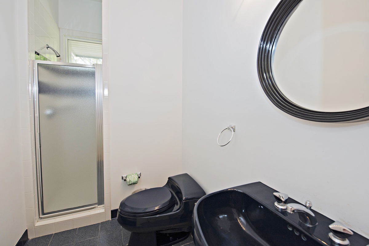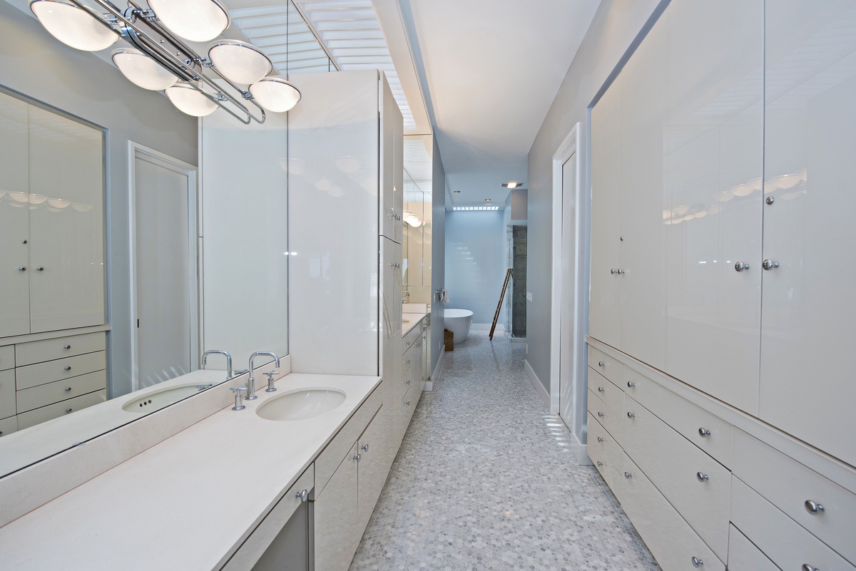 The final bedroom puts an exclamation point on the property’s five-star luxury, with a massive king-size four-post bed facing a flat-screen TV and flanked by sliding glass doors leading out to the upstairs deck. The en suite is a spectacle of spa-like opulence, with his and her vanities, garden tub and cavernous walk-in shower.