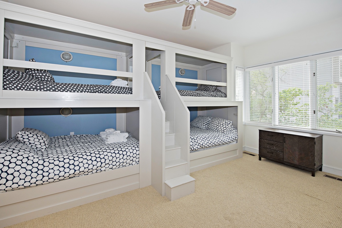 The third downstairs bedroom is paradise for younger visitors, with four built in bunk beds (2 twin tops, 2 double bottoms) perfect for sleepovers. The en suite offers dual basins as well as a tub and shower.
